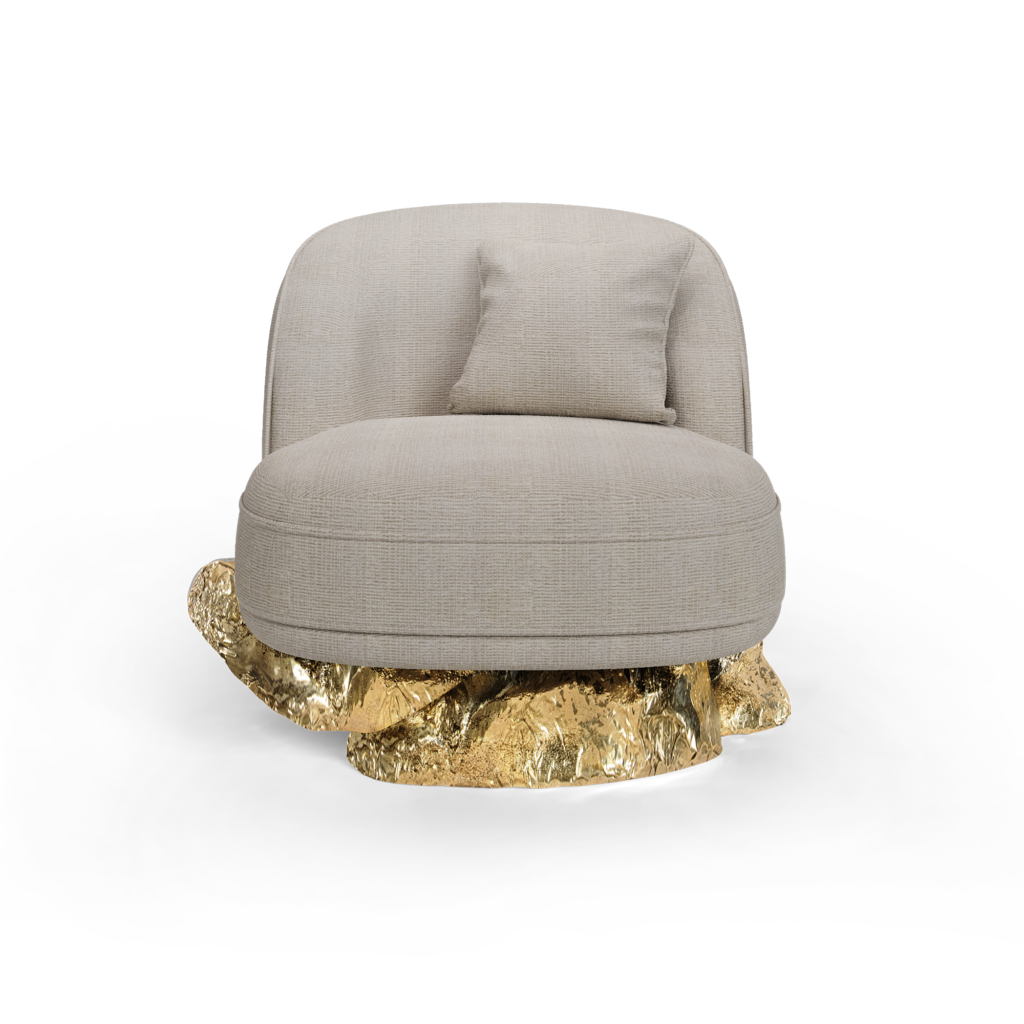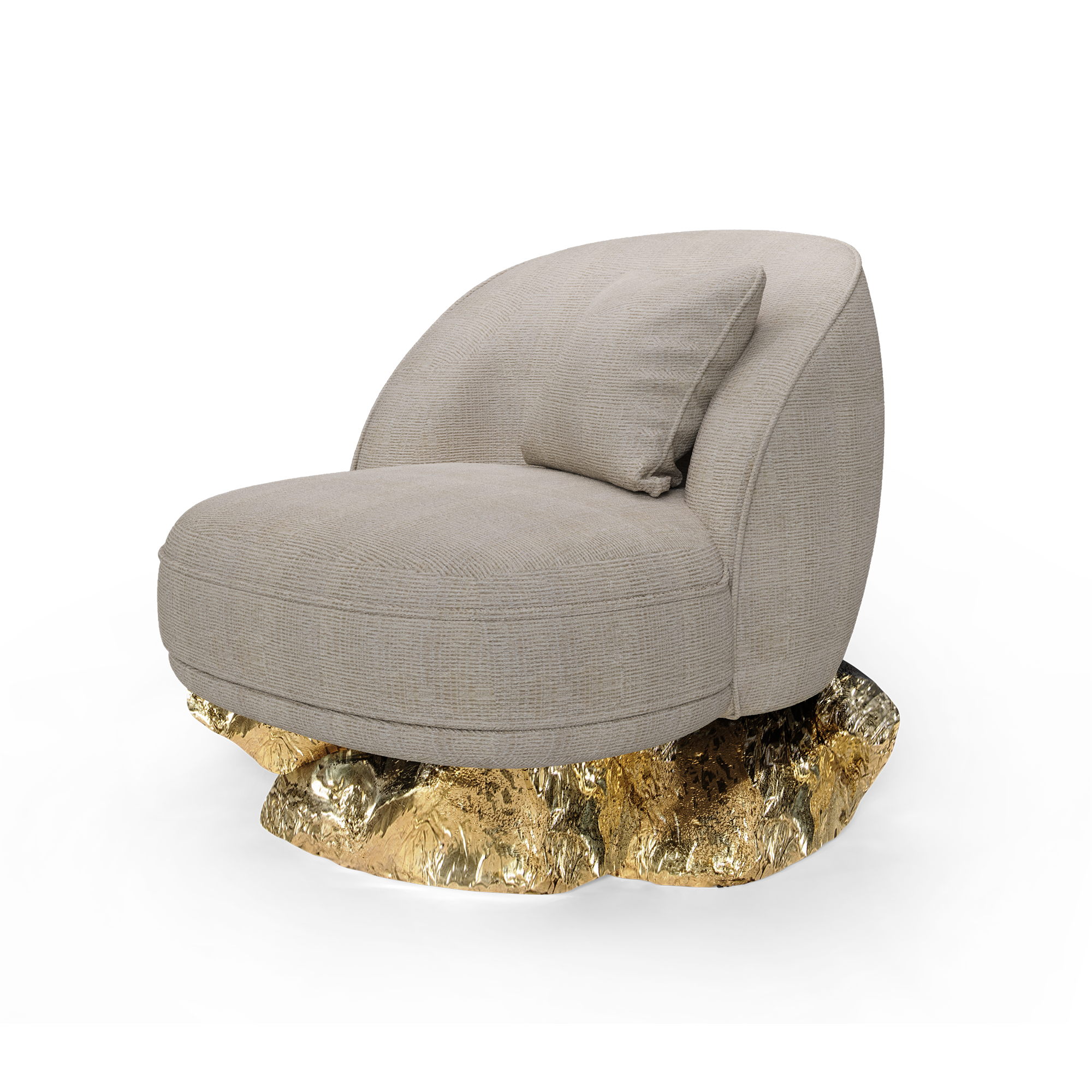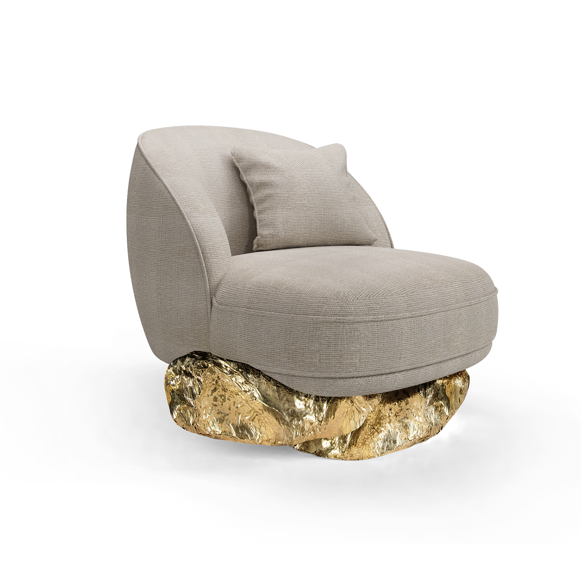 The Angra armchair is a harmonious fusion of art and comfort inspired by the extraordinary Angra sideboard. This armchair nestles on an unexpectedly curved golden base drawing its essence from the dramatic cliffs of Angra do Heroismo on the Azores island in Portugal. As you sink into the plush cushions of this armchair, you’re not just sitting; you’re embarking on a journey through design and natural beauty. A unique piece that is an invitation to elevate your space and encapsulates sophistication paying homage to historical landscapes and contemporary aesthetics.