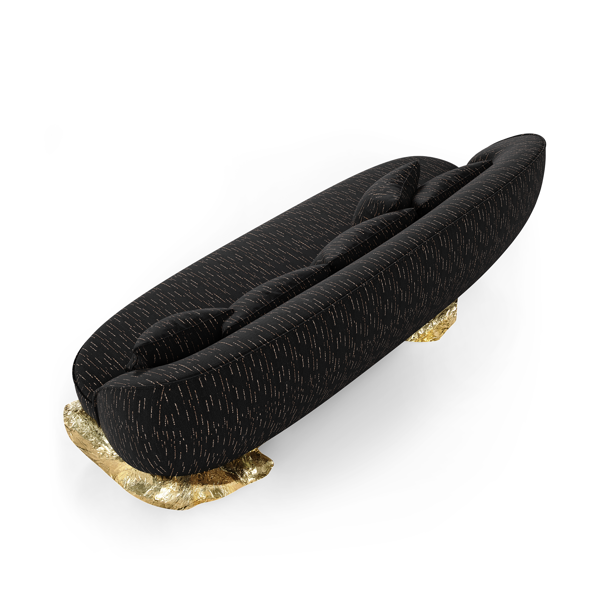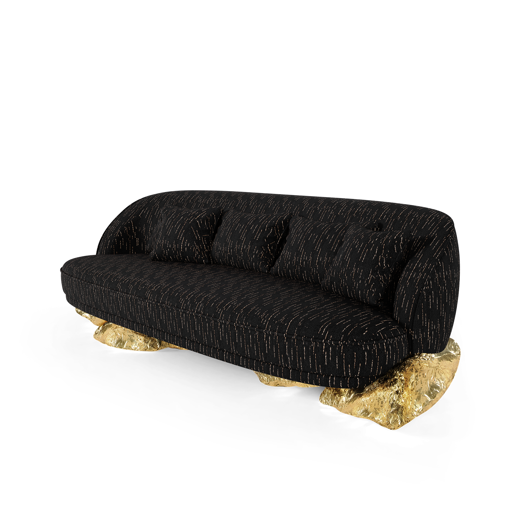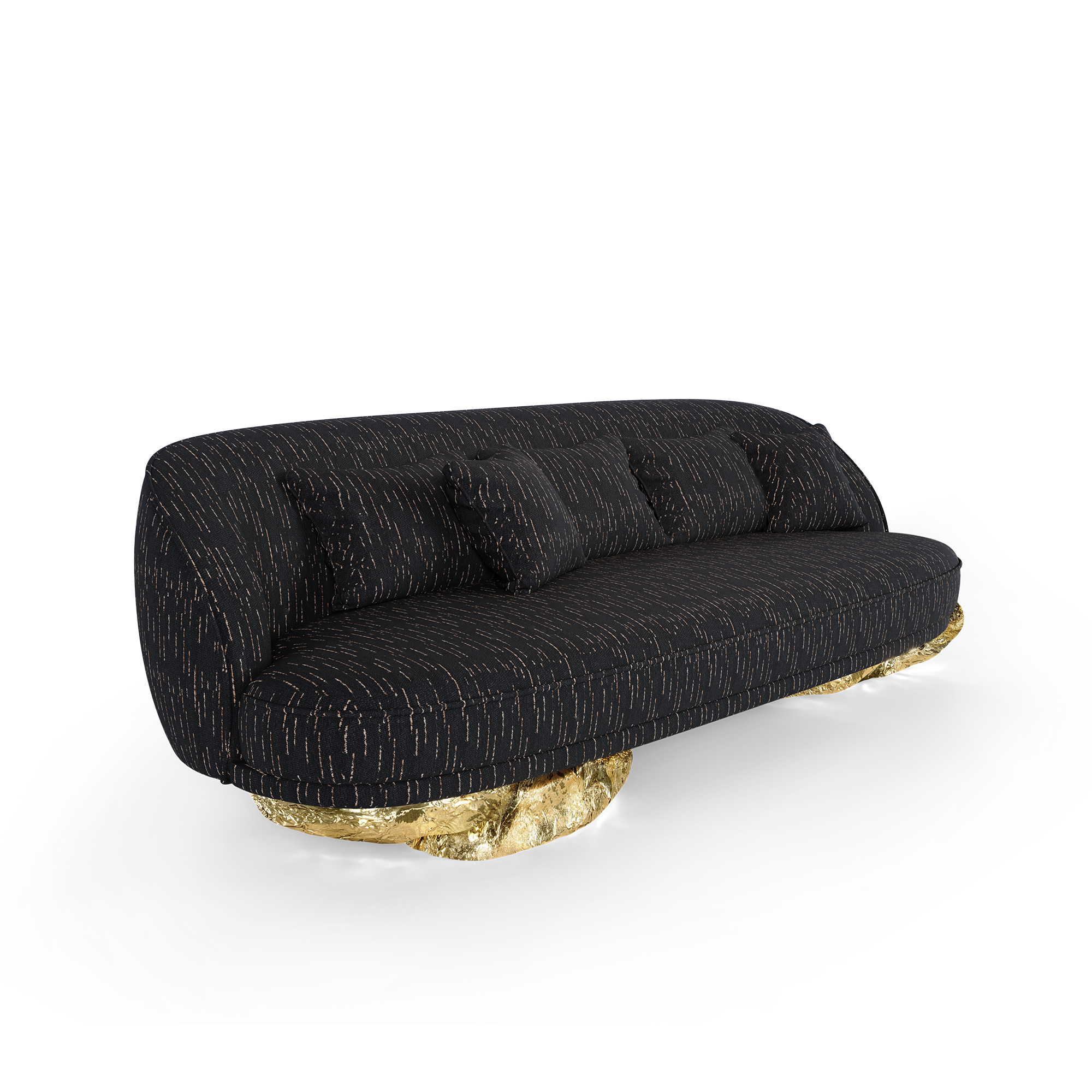 Introducing the Angra sofa, a blend of art and comfort inspired by the remarkable Angra sideboard. This sofa elegantly rests on a unique curved golden base, drawing inspiration from the breathtaking cliffs of Angra do Heroismo in Portugal’s Azores. As you lounge on this masterpiece, you’re not just sitting; you’re immersing yourself in a story that celebrates artistry and historical landscapes. A remarkable design that is an invitation to experience design and transcends the ordinary, bringing sophistication and inspiration to your living space.