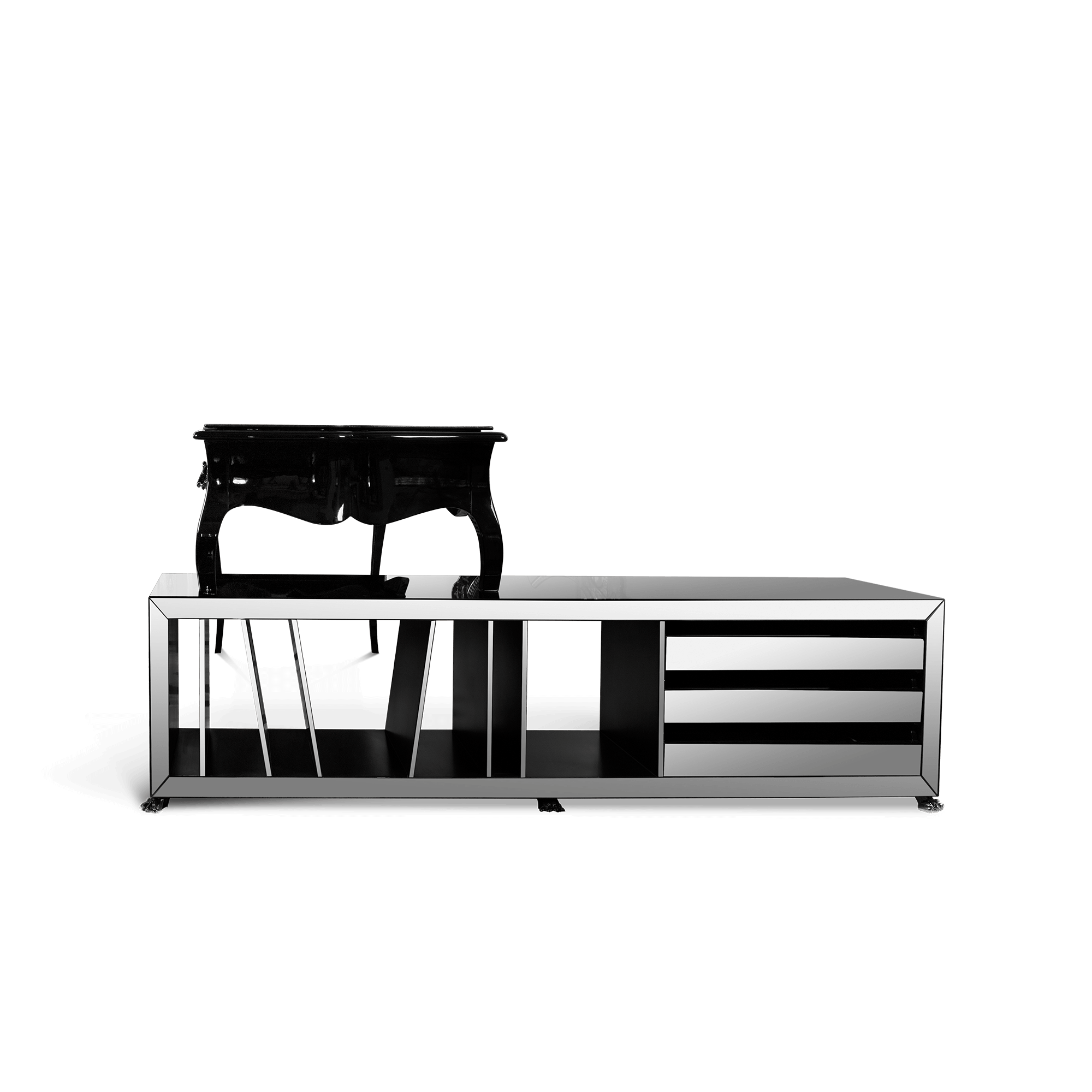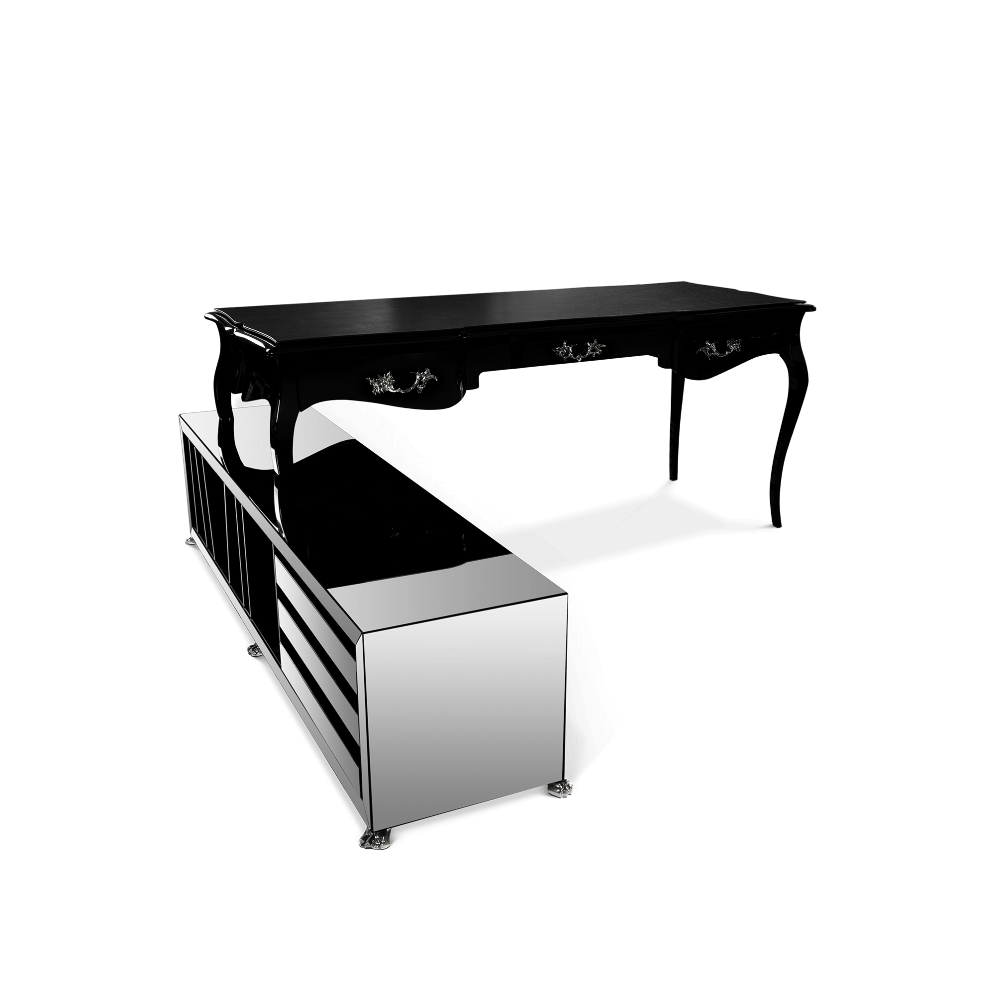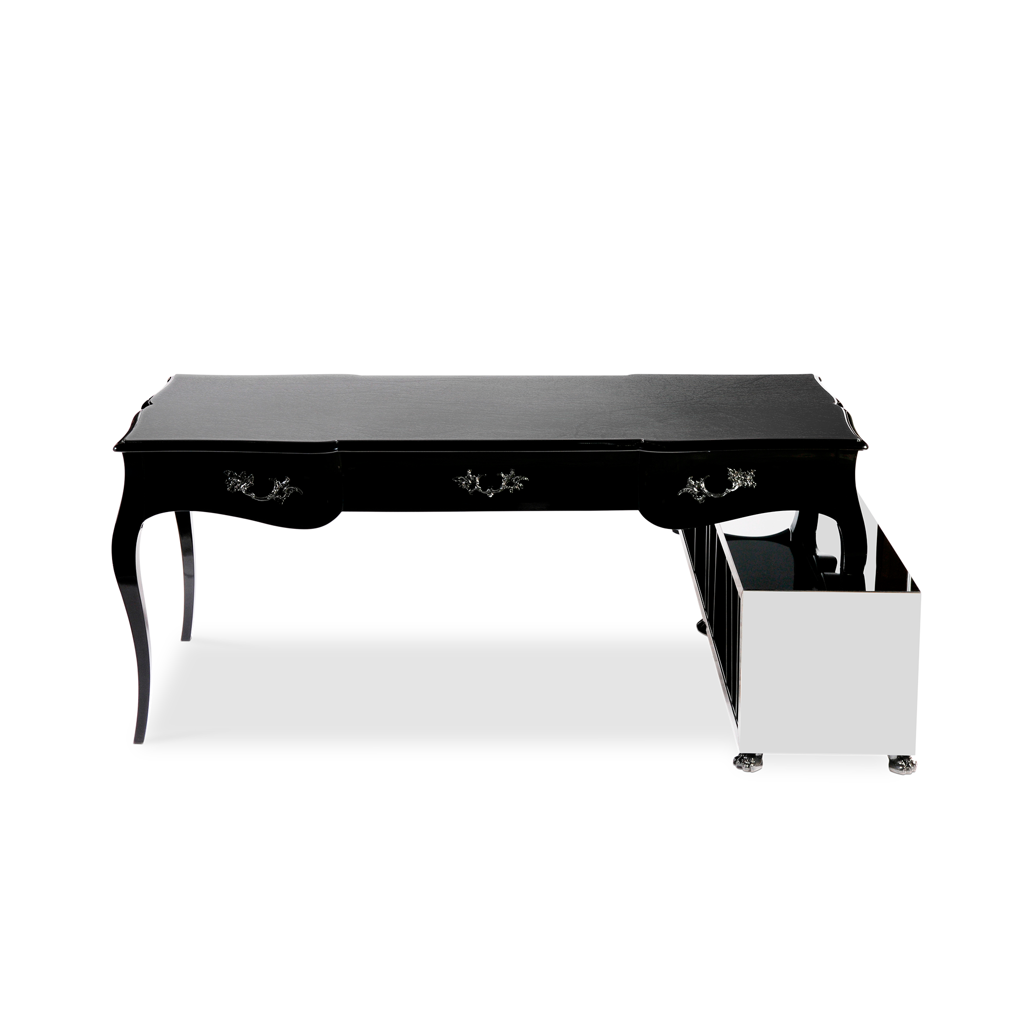 The Boulevard modern desk is a highly desirable classical piece. Perfect for your home office, or for a private space in your modern house, where you wish to register your thoughts and your ideas. Crafted from solid wood, this writing desk features a black leather top and three drawers with a classic cast brass handle finished in black. The attached drawer file unit has ample storage and is covered in a smoked mirror.
