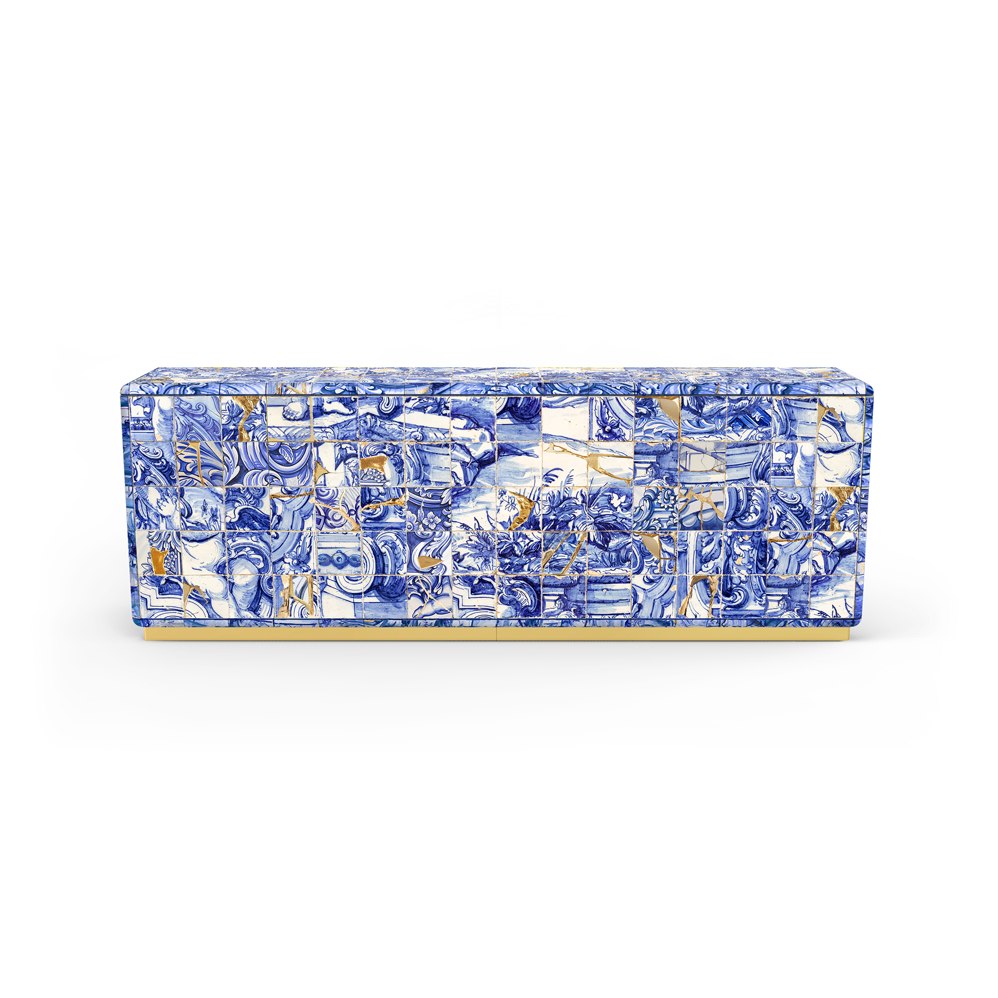 The Carmo Sideboard is a true tribute to Portugal’s rich artistic and cultural heritage, combining tradition and innovation in every detail. Covered in hand-painted tiles, the sideboard also incorporates the Japanese technique of kintsugi, where the imperfections and cracks in the tiles are highlighted by gold strokes, creating a unique piece that celebrates beauty in the scars of time. With four doors on the outside, Carmo reveals a refined gold leaf-lined setting on the inside, with four drawers that evoke the opulence of ancient palaces. Two bronzed glass shelves add a contemporary touch, perfectly balancing functionality and elegance. Divided into two distinct compartments, Carmo is a centerpiece that transcends traditional furniture and can take center stage in any sophisticated space. With its exquisite execution and luxurious 360-degree aesthetic, this sideboard is a true masterpiece of exclusive, handcrafted design, reflecting the spirit of personalization and exclusivity.
