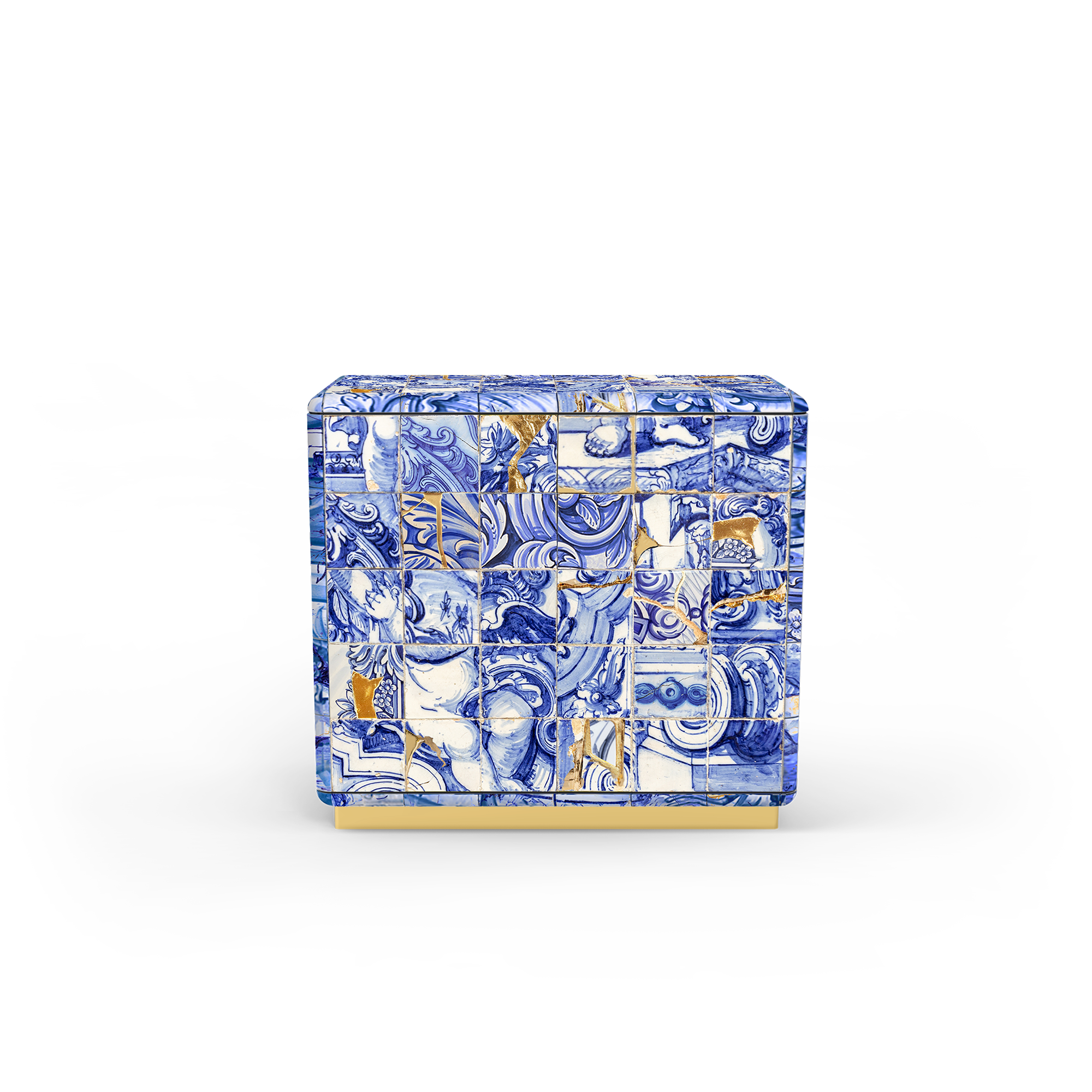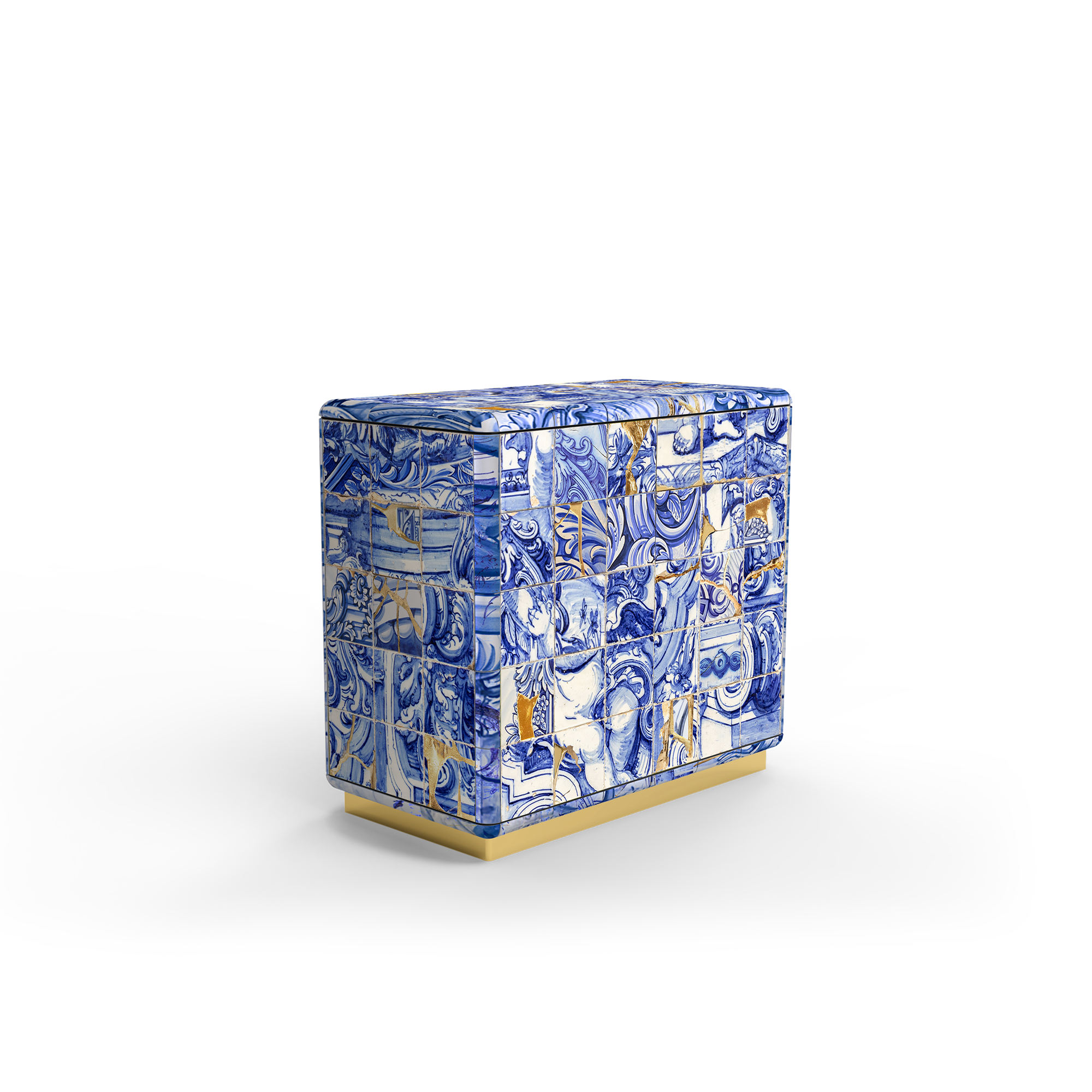 The Carmo Sideboard is a true tribute to Portugal’s rich artistic and cultural heritage, combining tradition and innovation in every detail. Covered in hand-painted tiles, the sideboard also incorporates the Japanese technique of kintsugi, where the imperfections and cracks in the tiles are highlighted by gold strokes, creating a unique piece that celebrates beauty in the scars of time. With four doors on the outside, Carmo reveals a refined gold leaf-lined setting on the inside, with four drawers that evoke the opulence of ancient palaces. Two bronzed glass shelves add a contemporary touch, perfectly balancing functionality and elegance. Divided into two distinct compartments, Carmo is a centerpiece that transcends traditional furniture and can take center stage in any sophisticated space. With its exquisite execution and luxurious 360-degree aesthetic, this sideboard is a true masterpiece of exclusive, handcrafted design, reflecting the spirit of personalization and exclusivity.