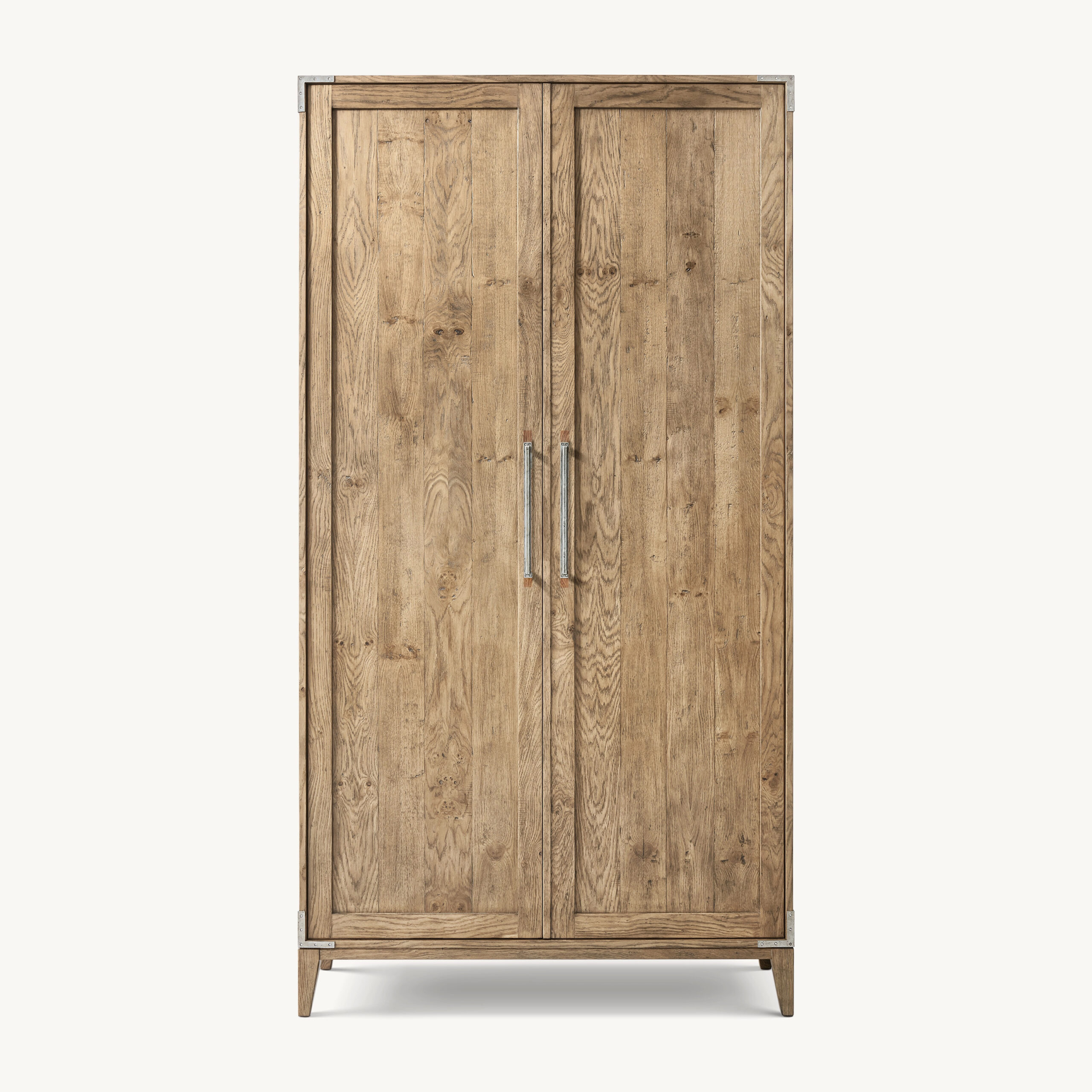 Oak is wire brushed to highlight its rich grain; a sealed wax finish enhances its color