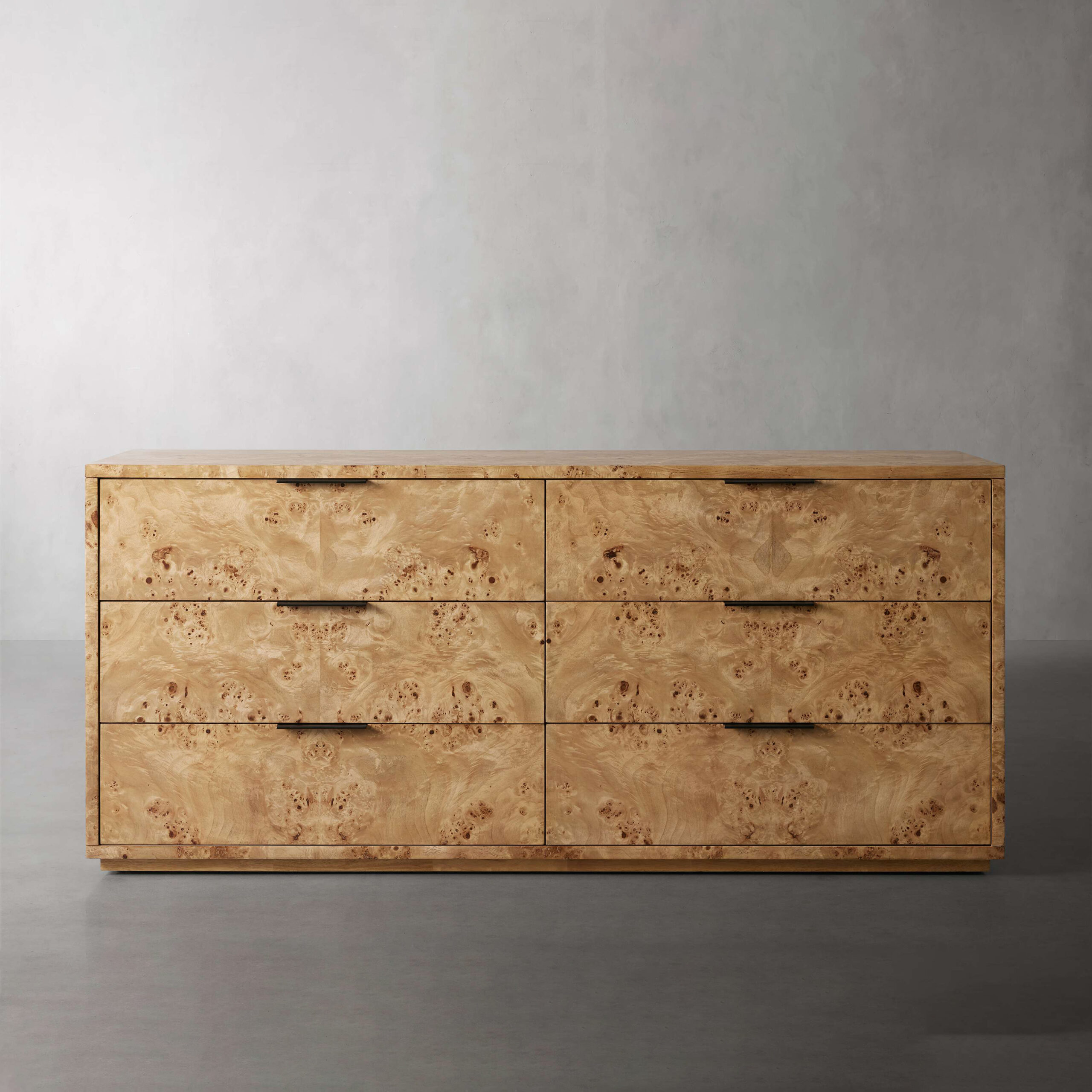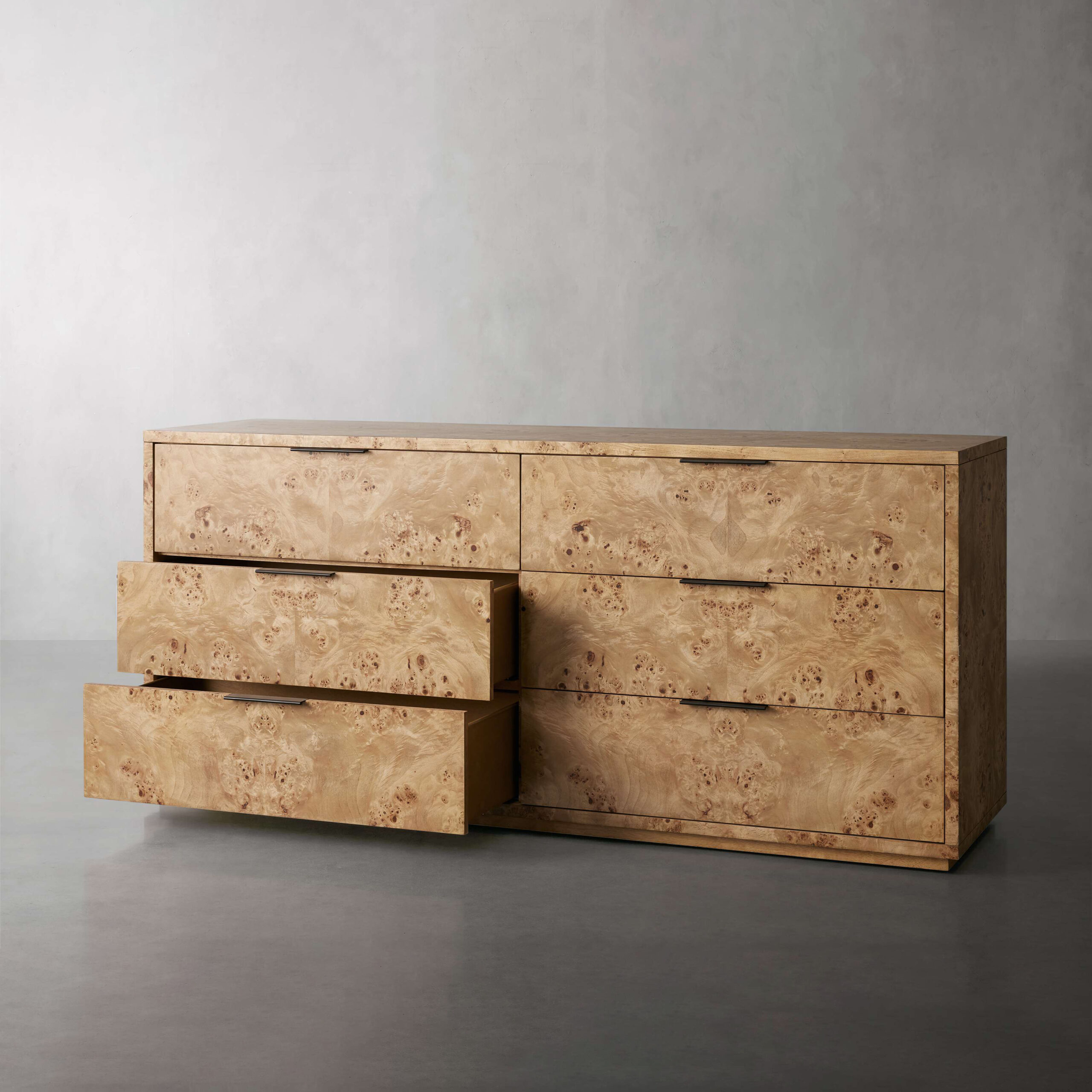 Swirling mappa burl wood is book matched across drawer fronts to create stunning visual interest and texture.