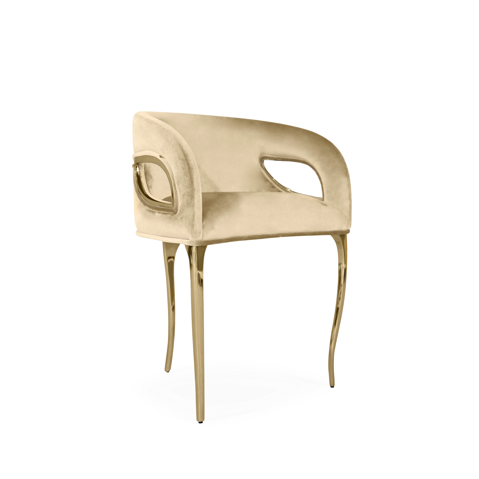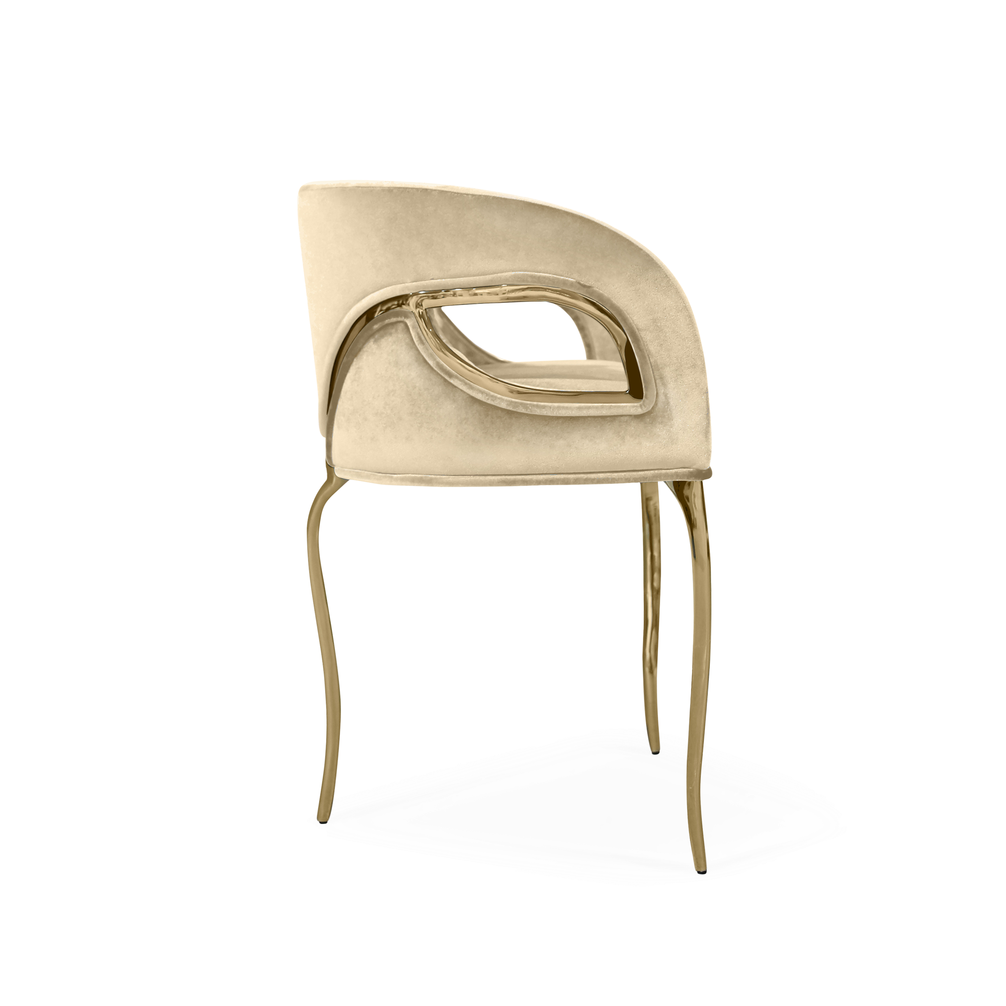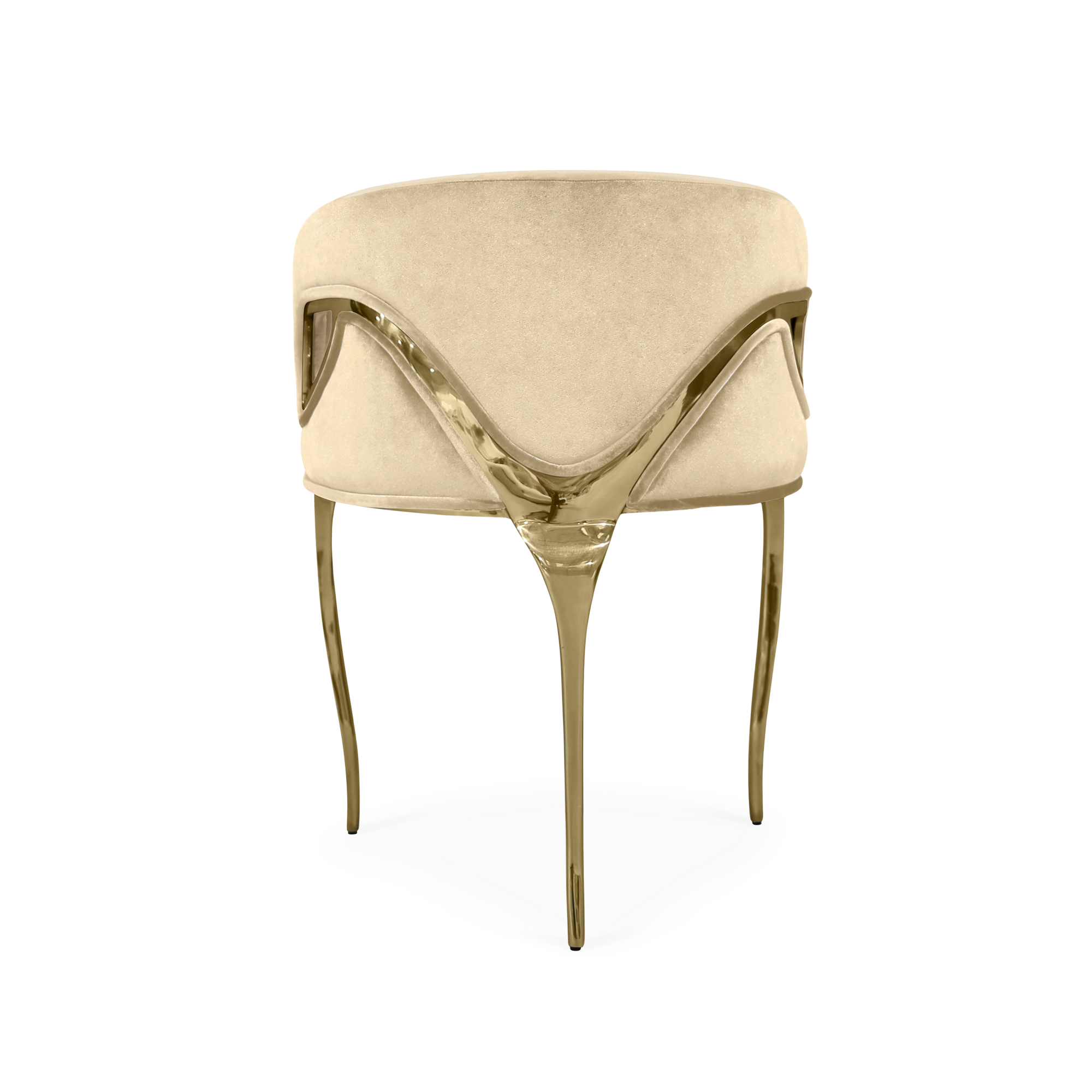 Chandra is both bold and daring. The modern edge in this chair exudes the feeling of vintage glam, while metal bands delicately bind the chair highlighting the sculpted fluidity of the tight back upholstery.