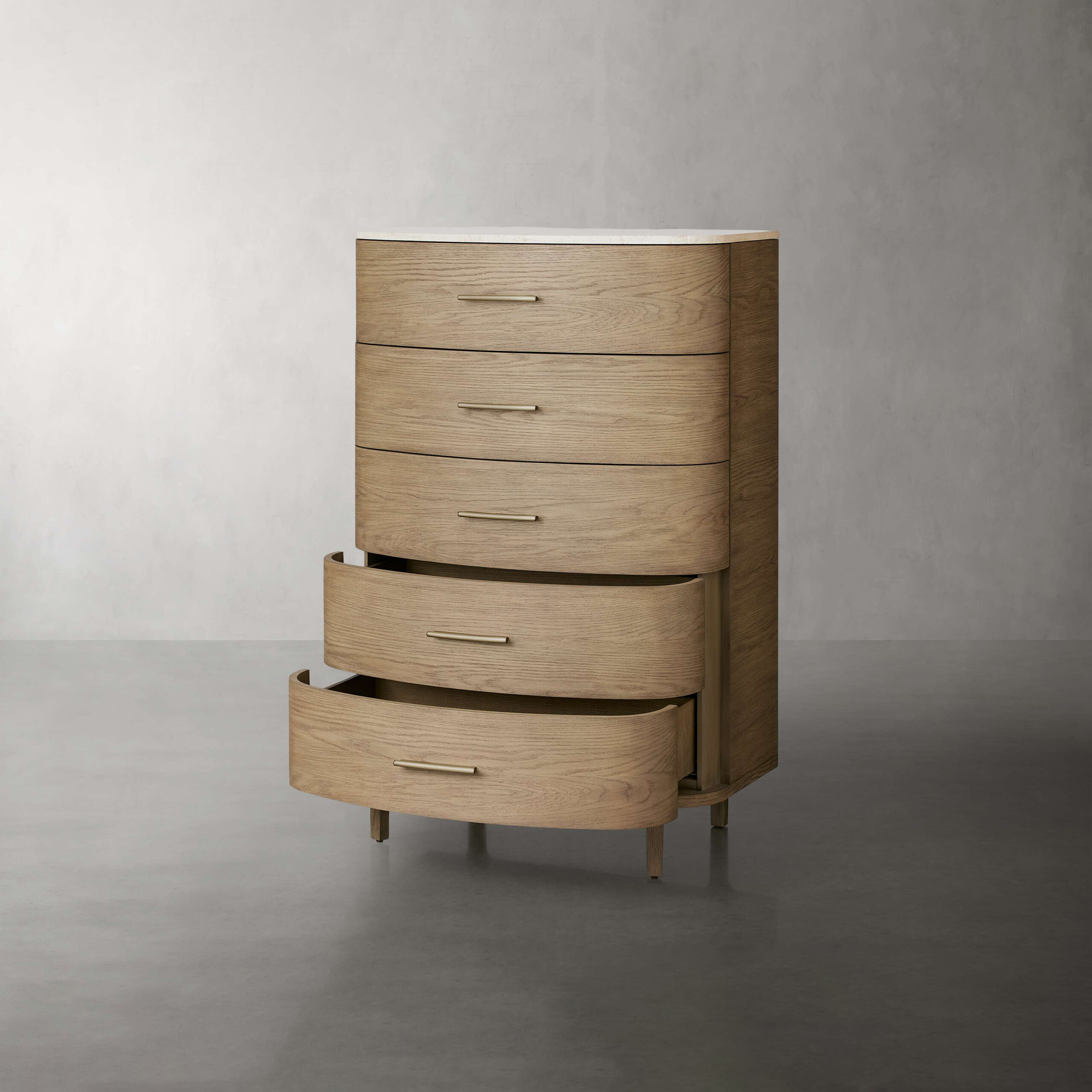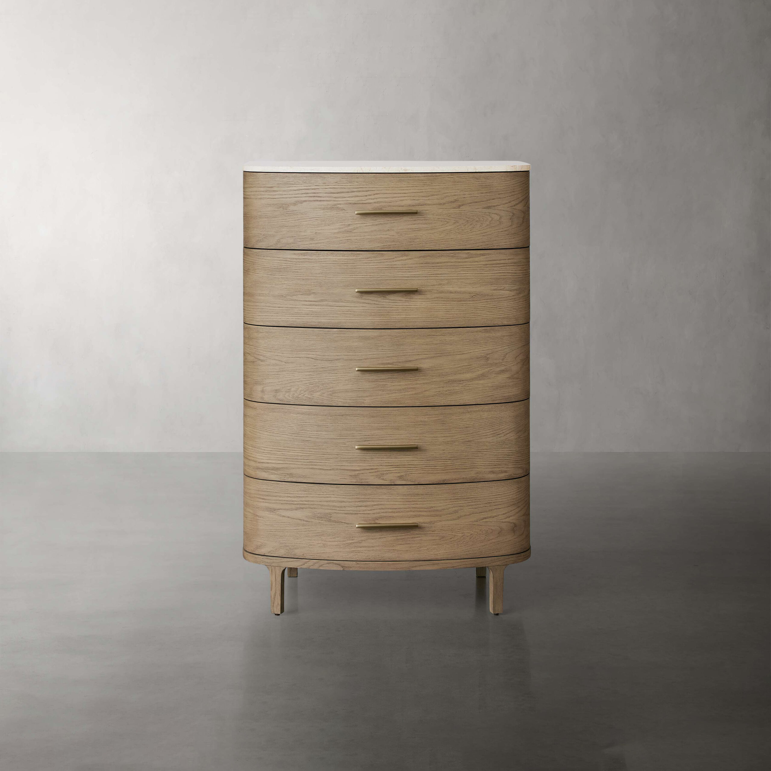 Dressers and nightstands feature white marble or cream marble tops and brass drawer pulls.