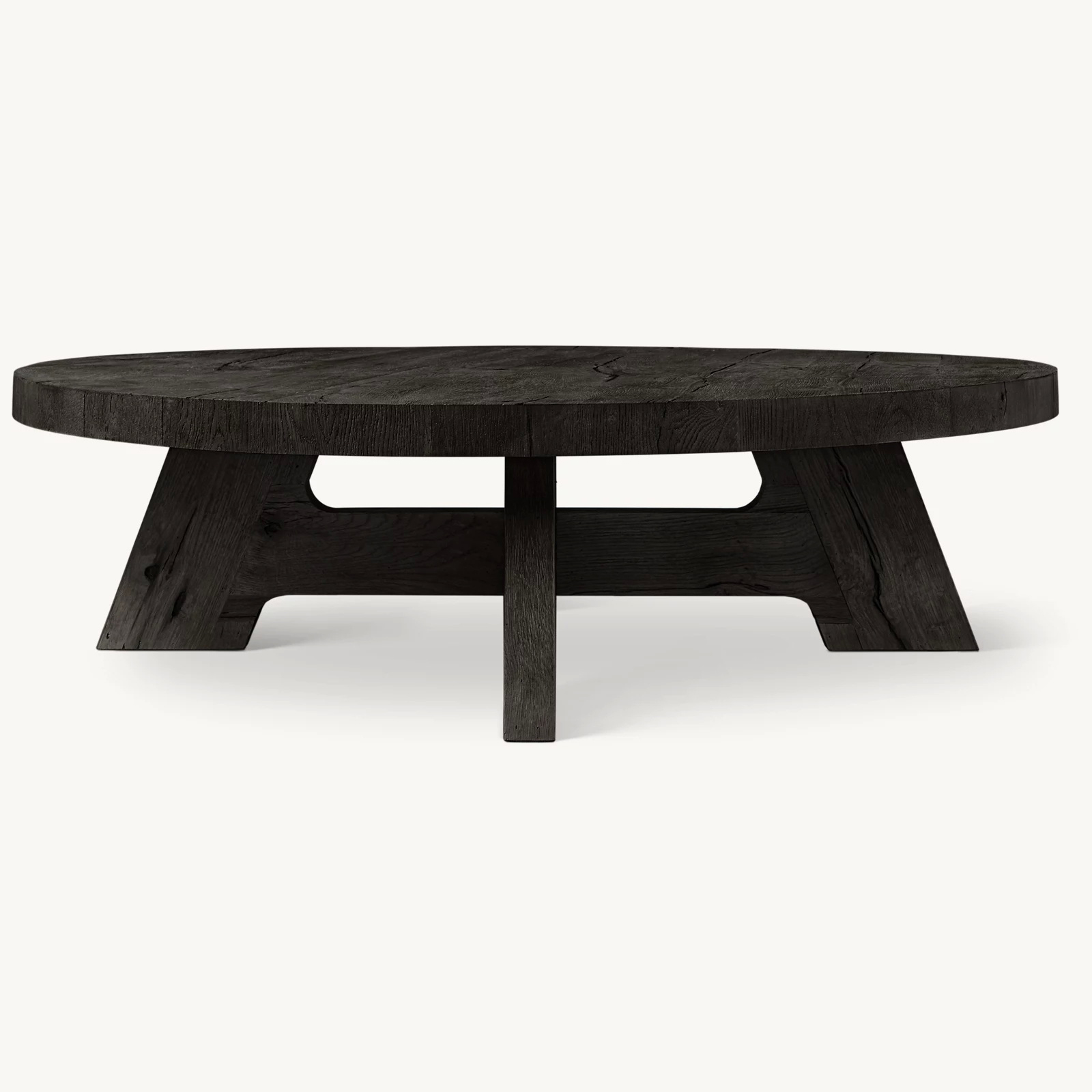 A multistep high-heat finishing process enhances the natural grain pattern and results in a rustic look with distinctive cracking and purposeful imperfections; after heating, the oak is wire brushed by hand and stained to a matte finish
