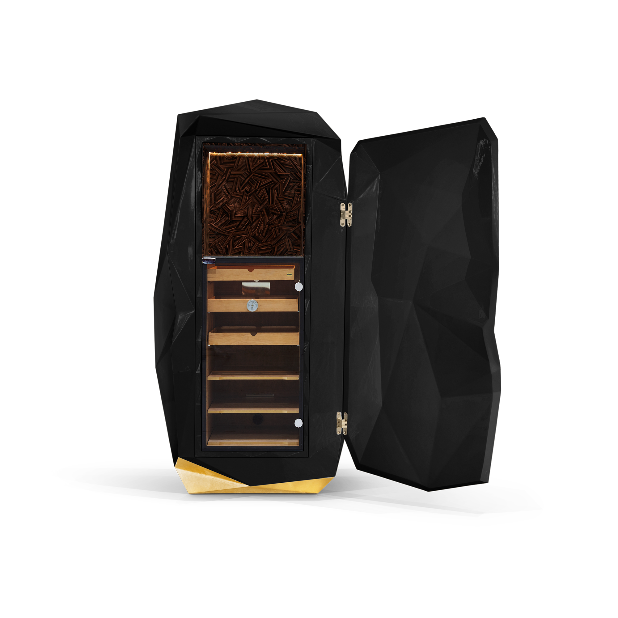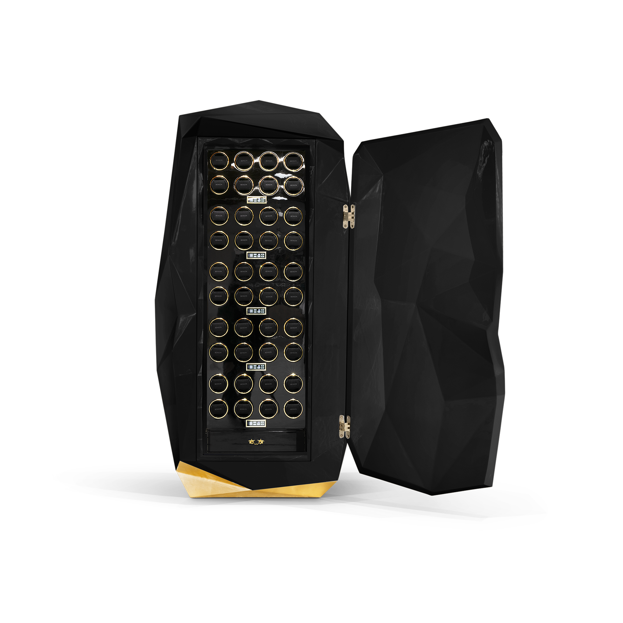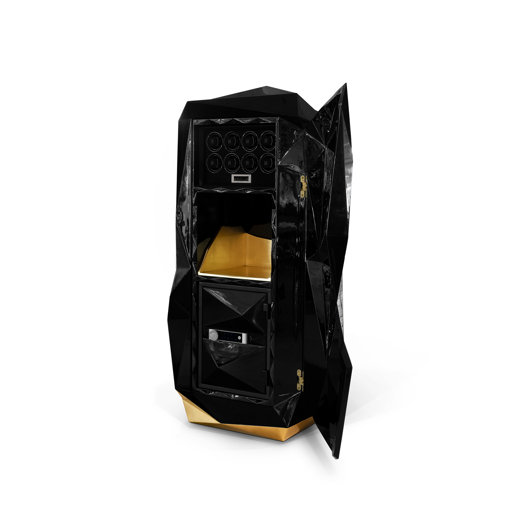 The Diamond floor safe reinterprets the quintessential diamond shape throughout contemporary design, a beautiful outcome of architectural thinking with elegant faceted lines. With a structure built in wood and finished in fine oriental black lacquer with a high gloss varnish coat, its hidden door conceals a six module watch winder box, a certified safe with a touch sensitive illuminated keypad, and a gold plated liquor pull-out tray.