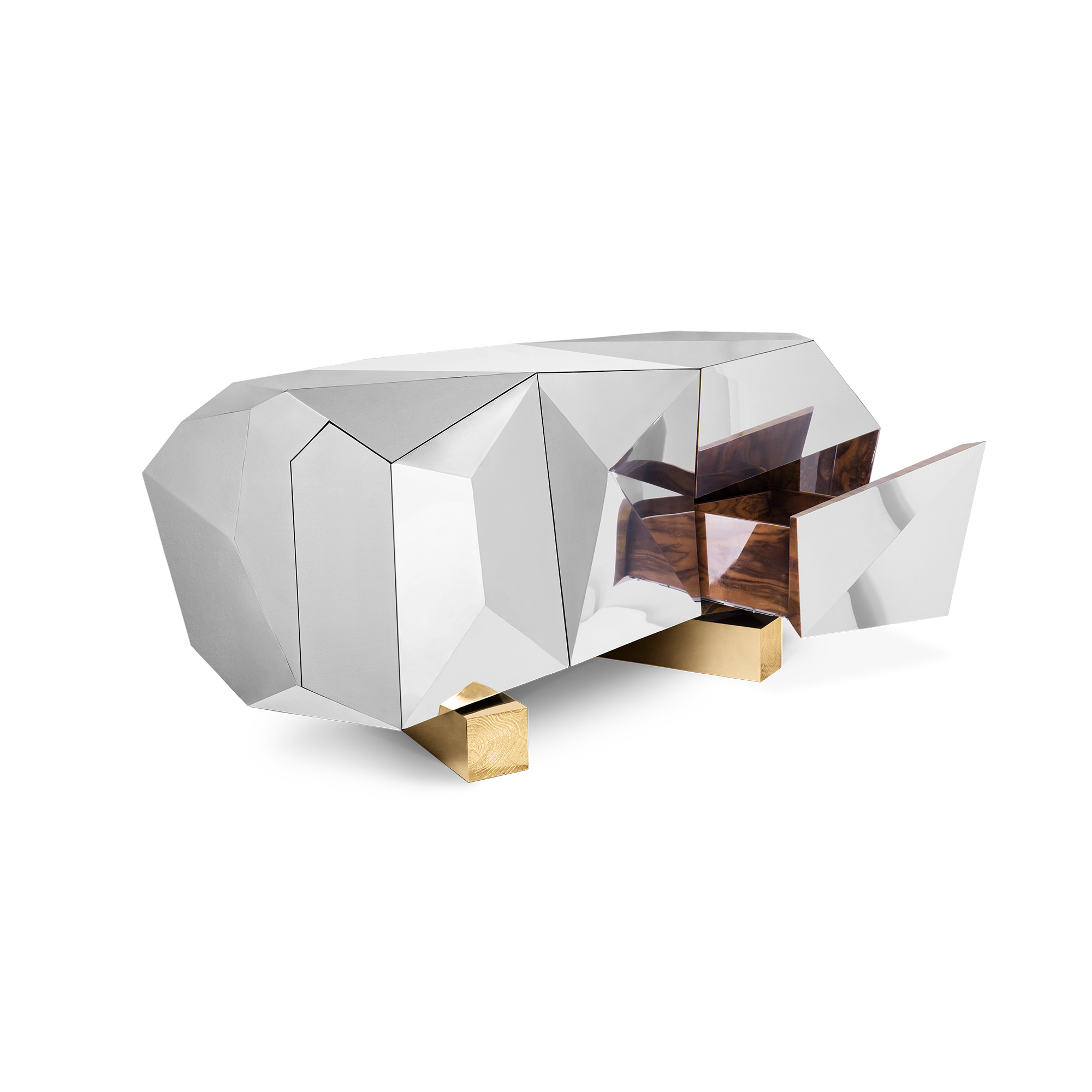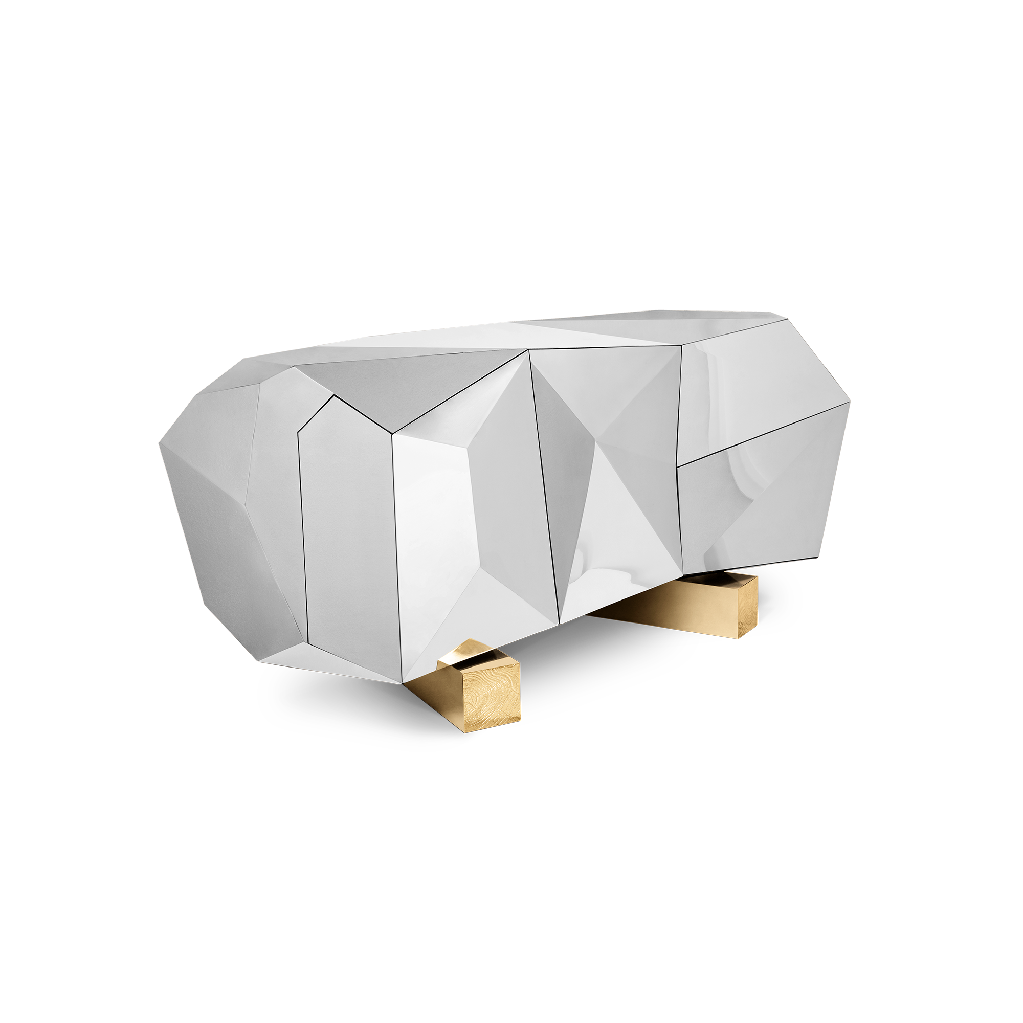 The iconic faceted Diamond Pyrite sideboard is reinvented as a remarkable outcome of architectural thinking with a powerful glistening effect.