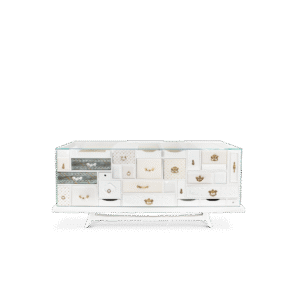 Time honoured masterpiece, the faceted Diamond sideboard is born as a subtle precious brown jewel with cutting-edge lines to challenge the boundaries of form. Influenced by the deconstructivism movement of postmodern architecture, the contemporary storage sideboard is conceived from wood and covered by gold leaf finished with a translucent shade of brown with gradient effect. It features two highly sculpted drawers and three doors, leading to a remarkable gold leaf interior and one shelf. Layer by layer, leaf gilding is one of the most treasurable and richest crafts techniques. An unexpected way to give a timeless touch and to carry the legacy of those who built it. The strong geometric design is coupled with three brass plated feet with casted brass details. A real expression of exclusivity and high collectible design.