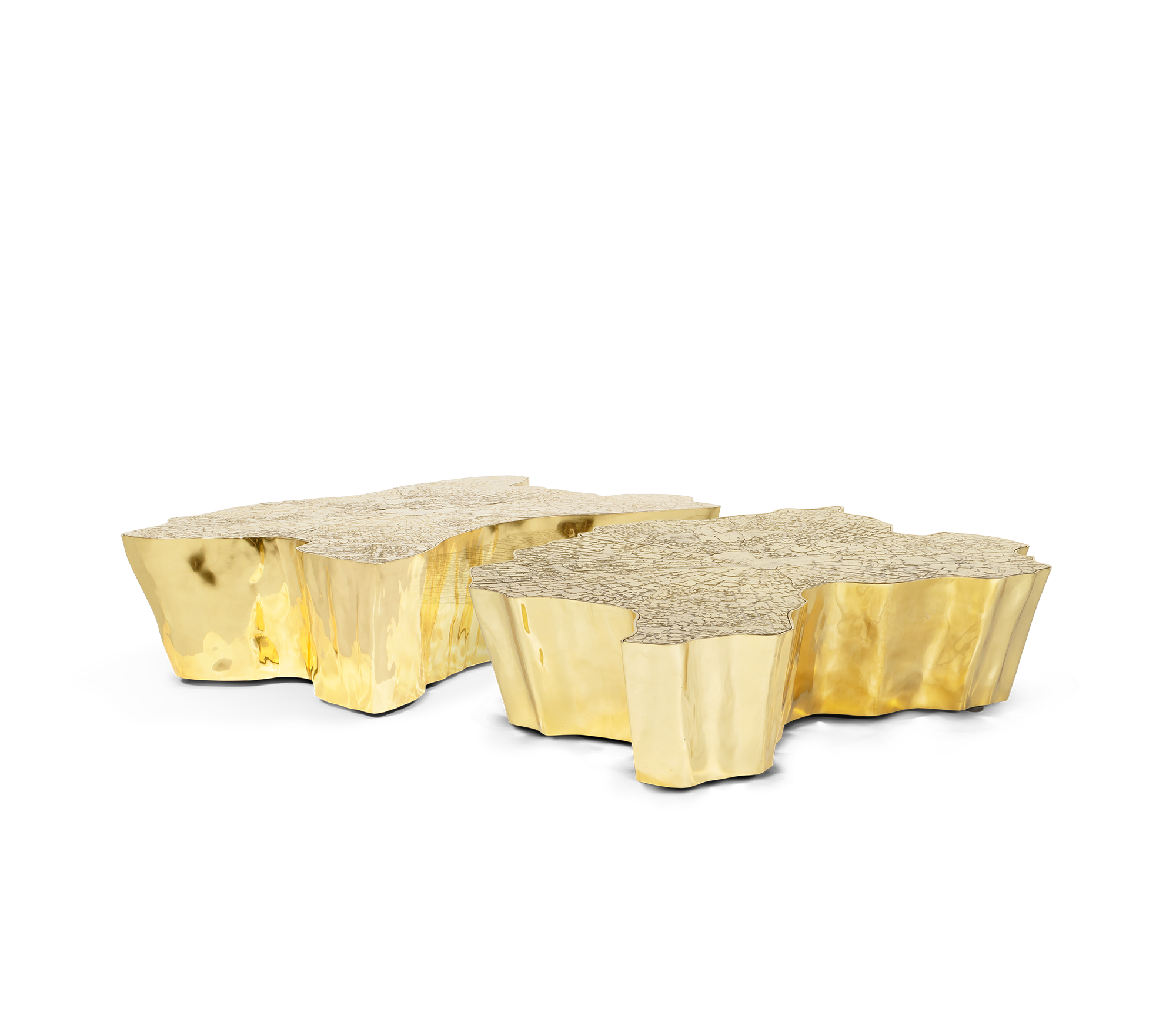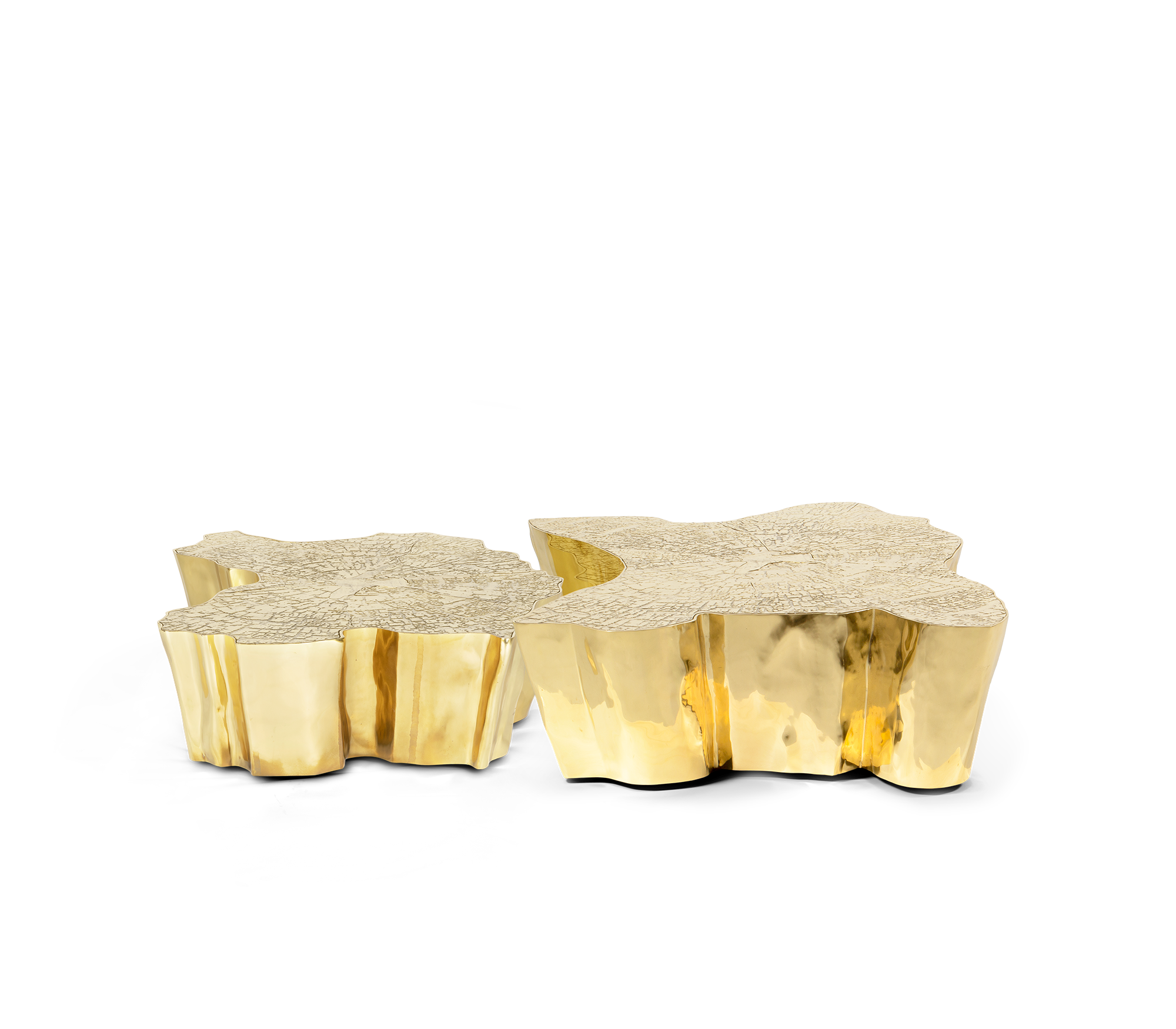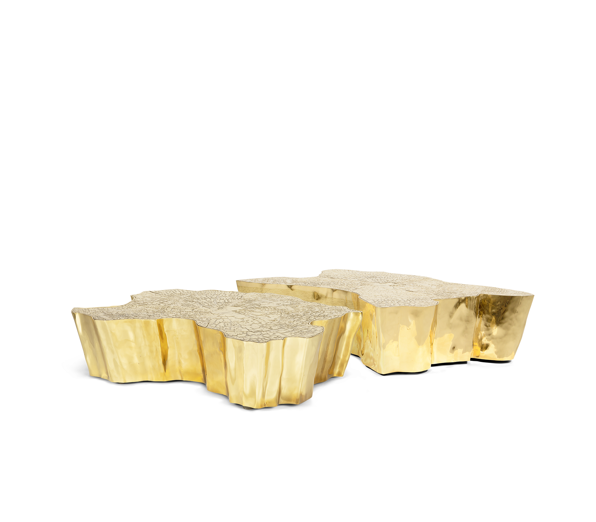 The mystic behind the name inspires Eden. A slice of the tree of life that fell from the Garden of Eden, this accent coffee table awakens desire and curiosity with its intriguing cut. Born from master artisans and the ancient technique of polished cast brass, this statement design piece incorporates nature-inspired design with industrious welding techniques, being manually assembled, making each piece unique. With delicate lines and bold details, a manually engraved top exposes the heart of a golden tree, boasting a sinuous gold plated base that stood the test of time.