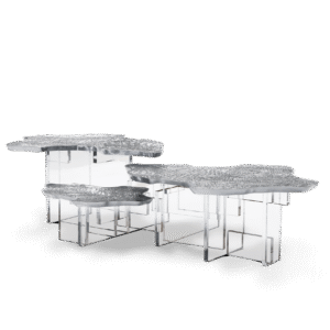 Available in sets of 7, 8, or 14 pieces with varying heights. A contemporary coffee table set with casted metal structures and natural marble table tops.