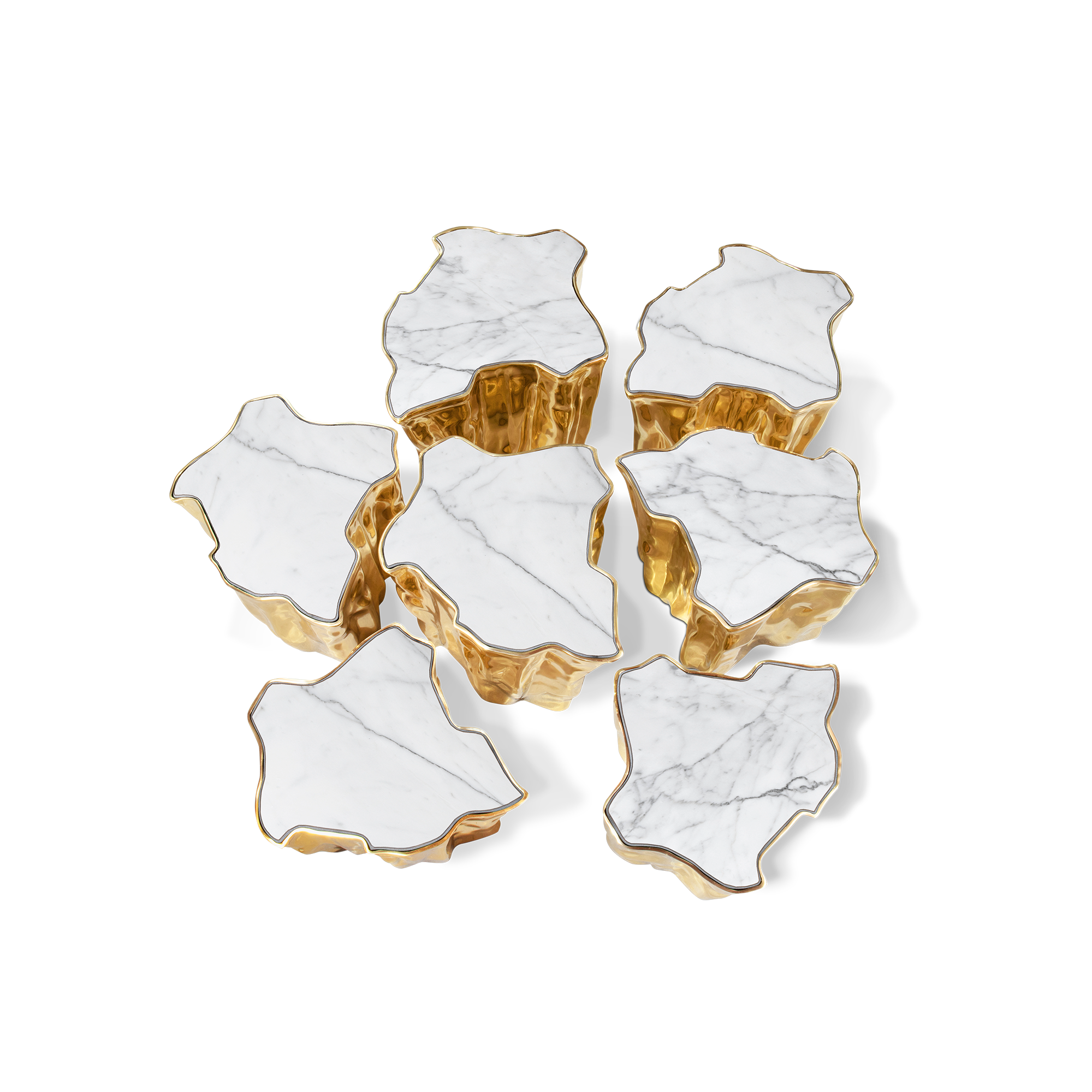 The mystic behind the name inspires Eden. A slice of the tree of life that fell from the Garden of Eden, this accent coffee table set awakens desire and curiosity with its intriguing cut. Born from master artisans and the ancient technique of polished cast brass, these statement design pieces incorporate nature-inspired design with industrious welding techniques, being manually assembled, making each piece unique. With delicate lines and bold details, a manually engraved top exposes the heart of a golden tree, boasting a sinuous gold plated base that stood the test of time. It is available in groups of 7, 8 or 14 pieces, with different heights, for unexpected combinations. The remarkable and already time-honoured piece, Eden coffee table series combine with both contemporary and modern design styles, classy rooms waiting for superior craftsmanship and iconic design.