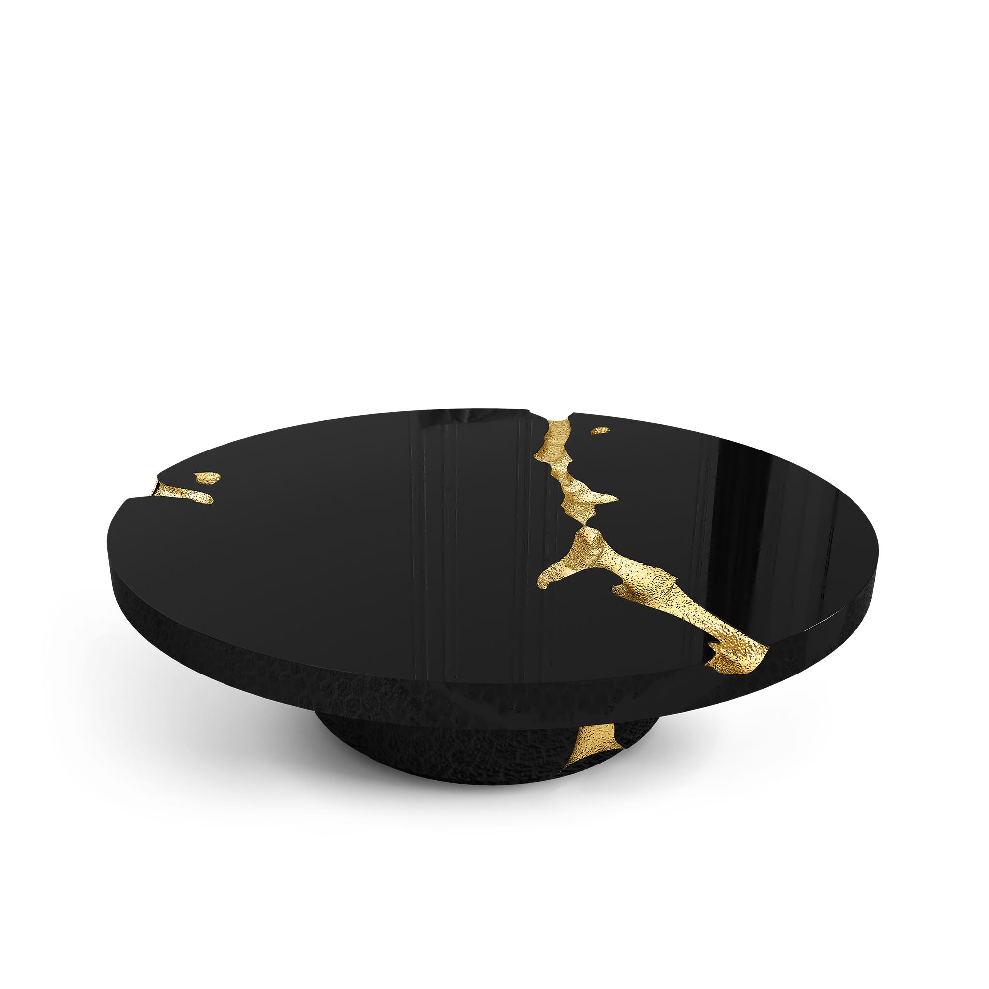 The elegant round center table is built from mahogany wood and features an exquisite polished brass surface detail. Its cracks are hand carved and inserted through polished brass sheets, which are hand hammered for a unique and organic finish. Its finest gold detail crack reflects a gold interior in a manifesto towards power. Flawless and bright, the remaining poplar root surface will raise the bar of the most sophisticated living rooms. Designed and built to make an impression and deliver an unmatched experience, Empire contemporary coffee table is ready to make a statement any occasion.