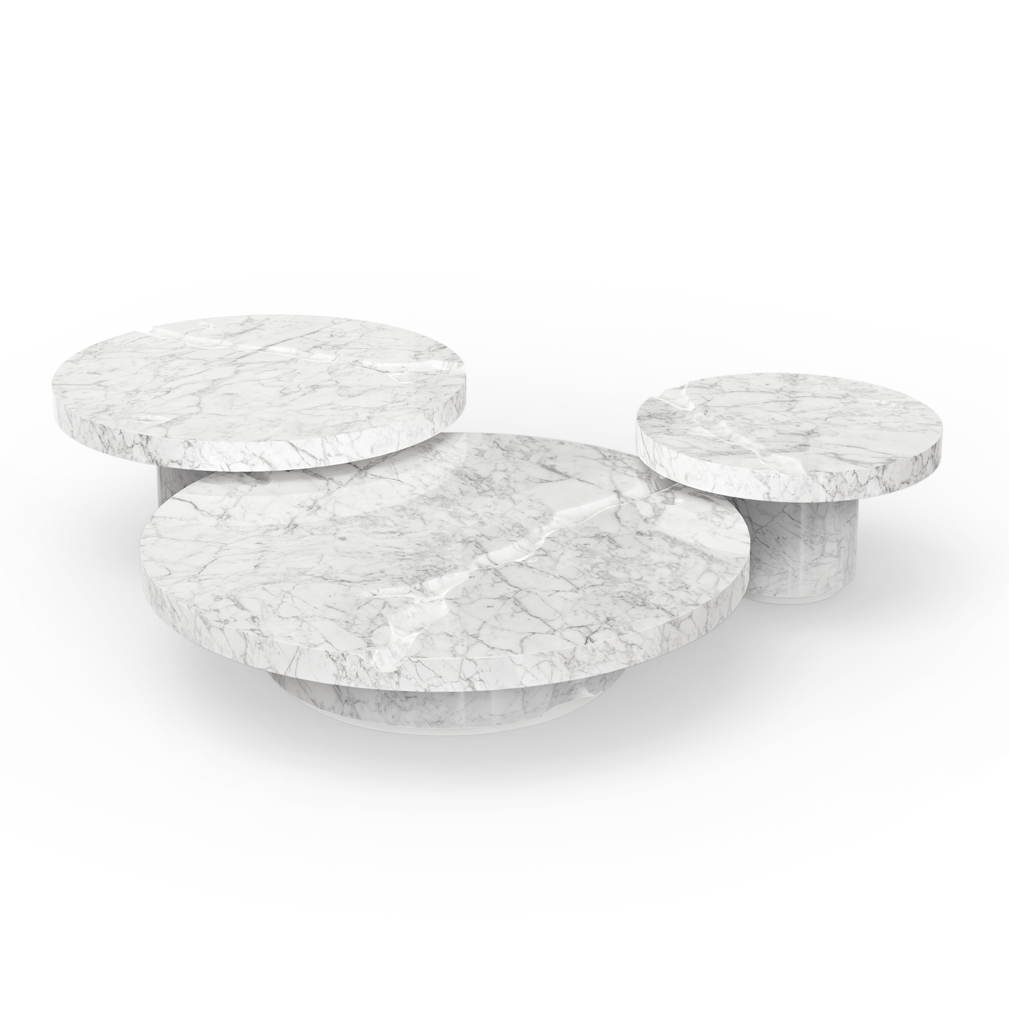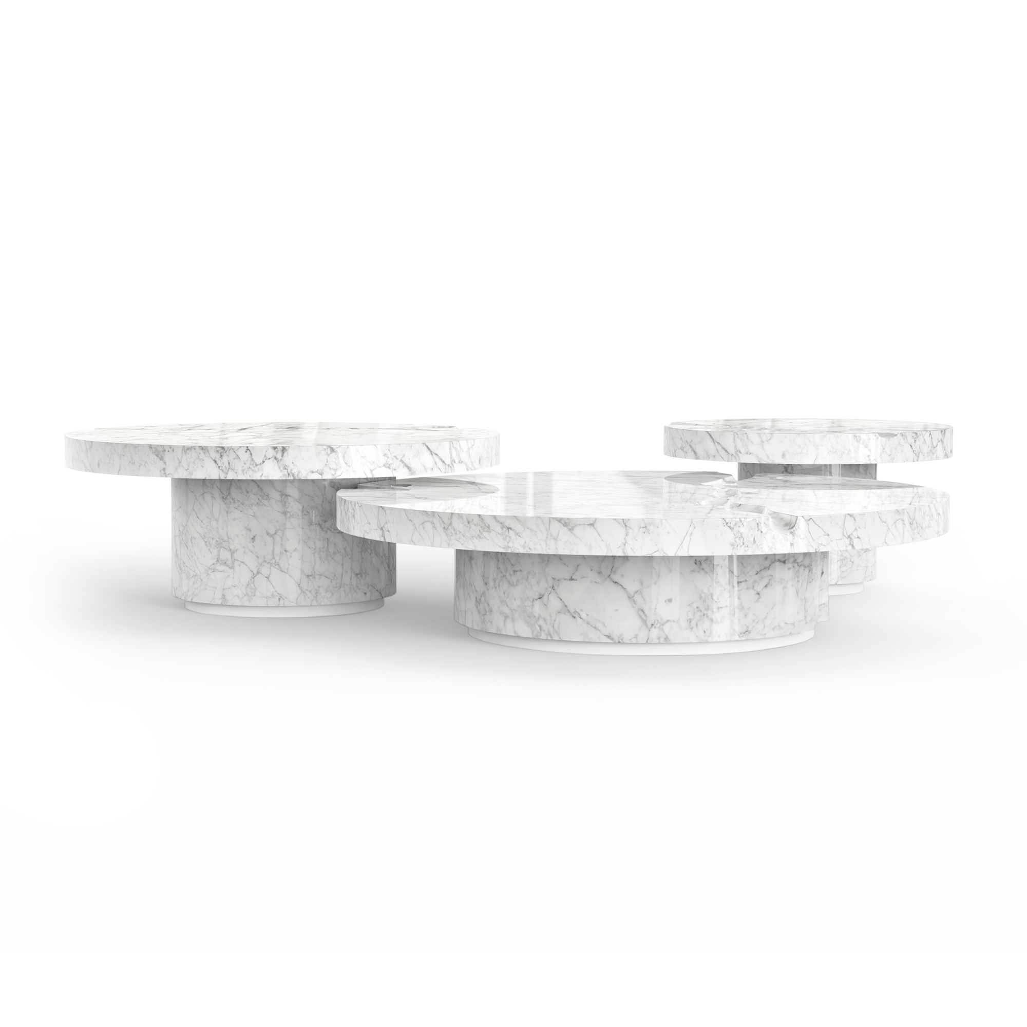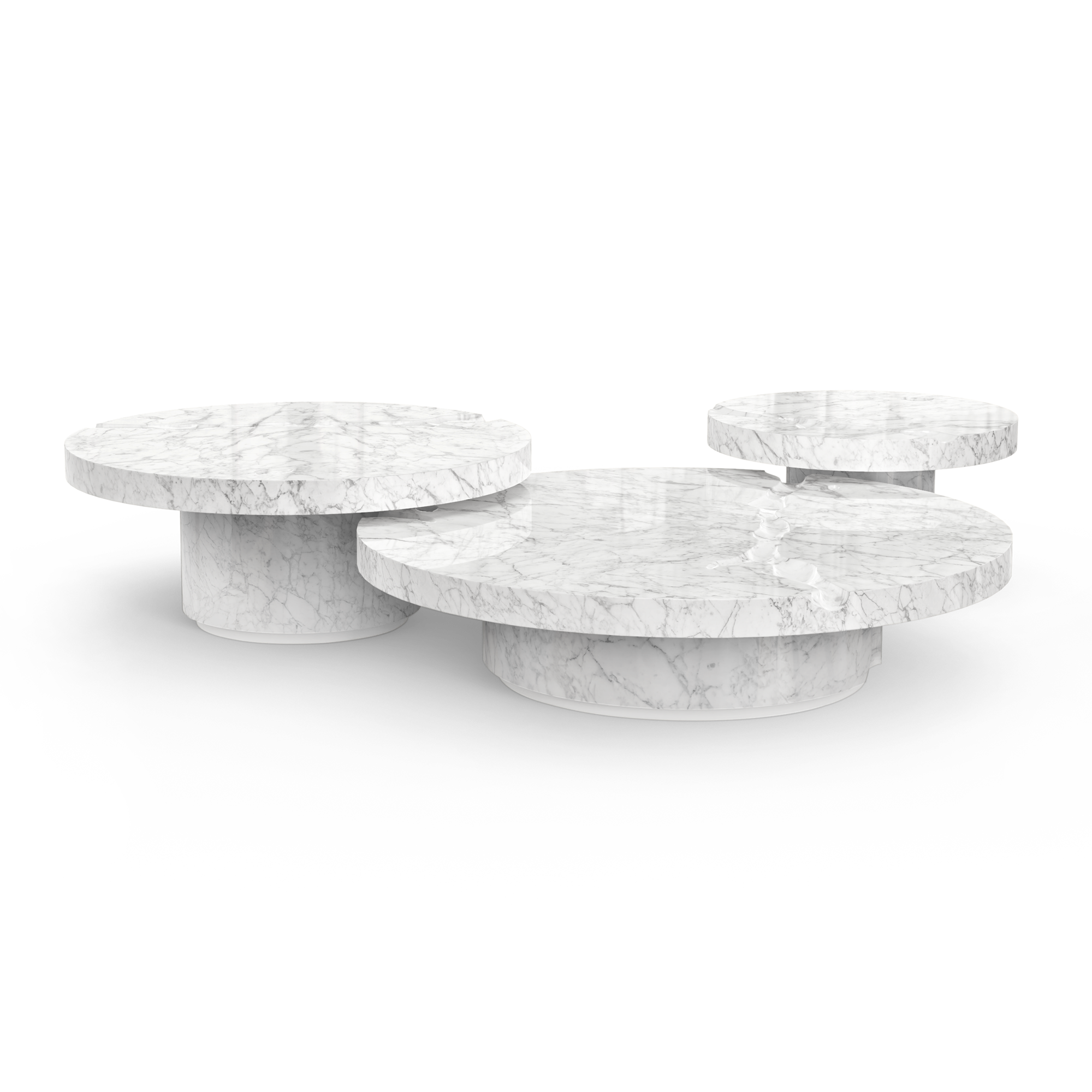 The Empire center table set is produced in Carrara Marble with a white matte lacquered footer.