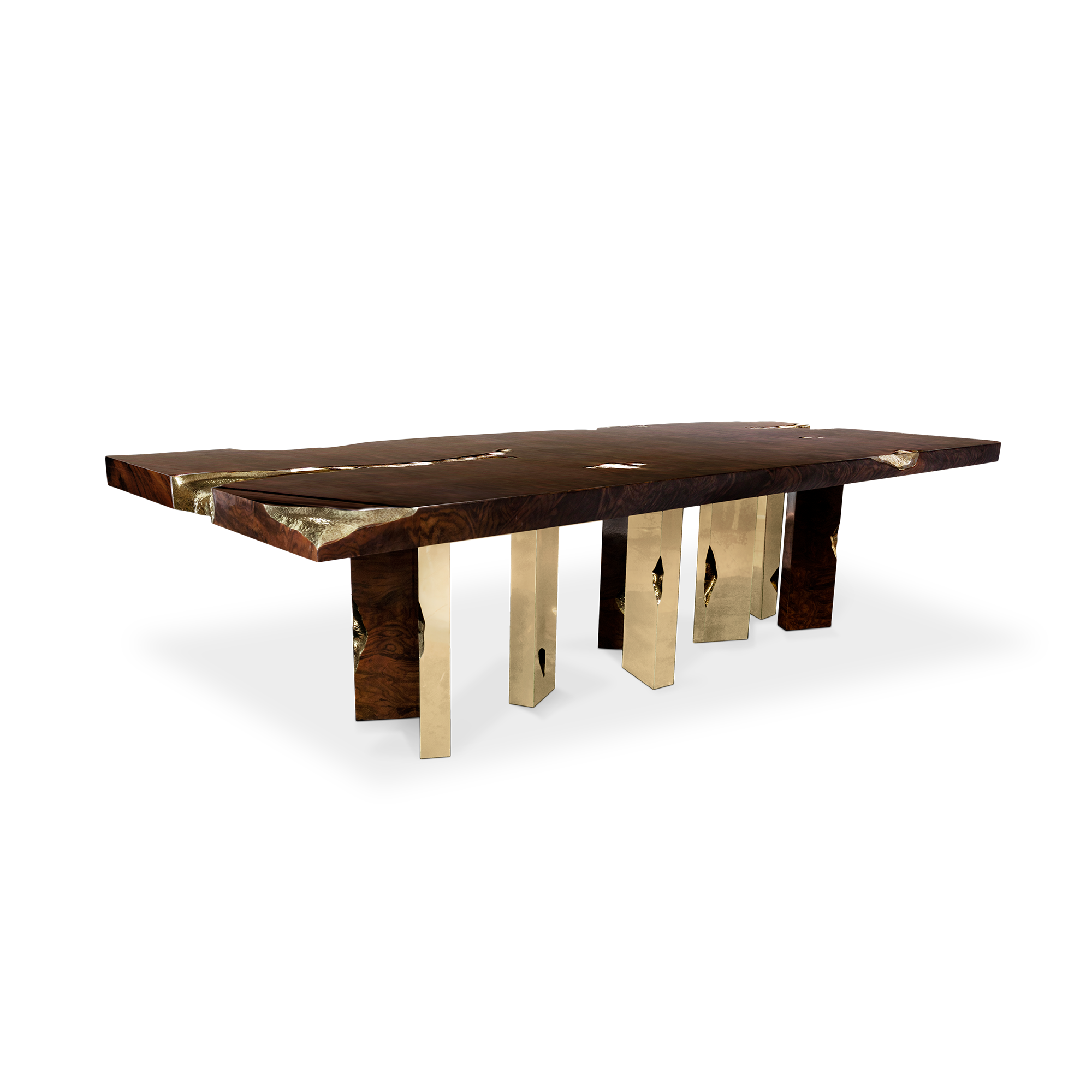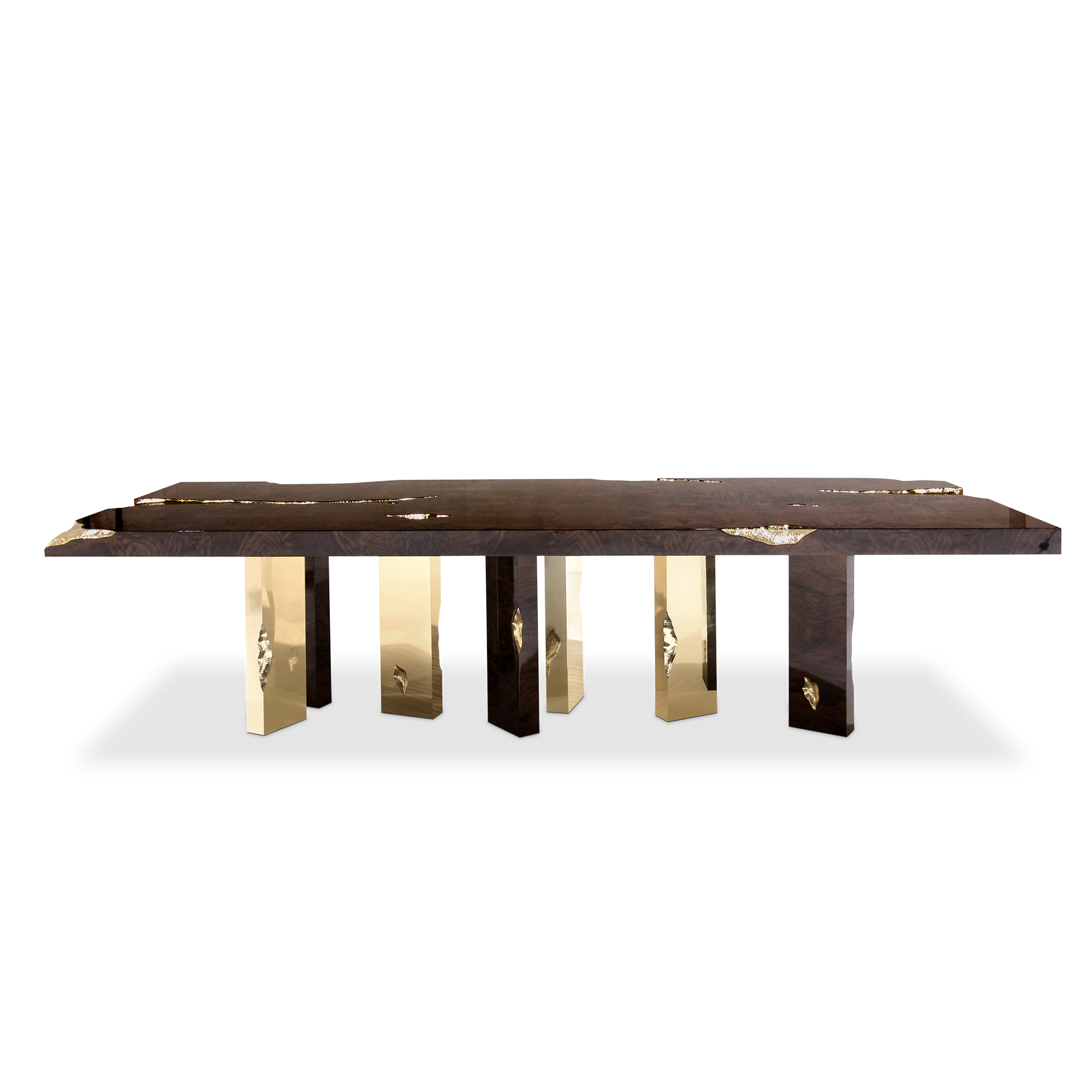 The Empire dining table’s surface is made in mahogany, coated in a fine wood veneer, with high polished brass details to fill the cracks. Its legs, also made from mahogany are finished the same way, and with polished brass sheets.