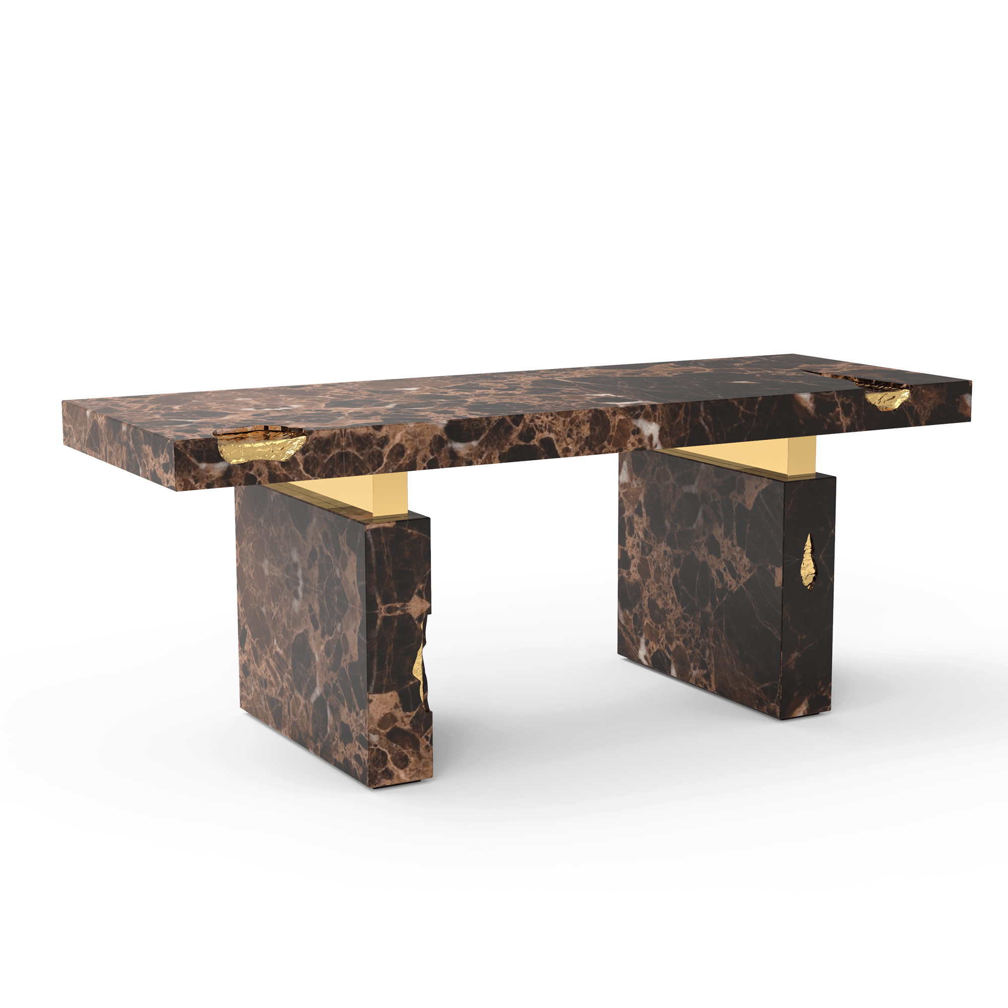 An elegant writing desk built in marble with polished brass details. Its cracks are hand-carved and inserted through polished brass sheets, which are hand-hammered for a unique finish.