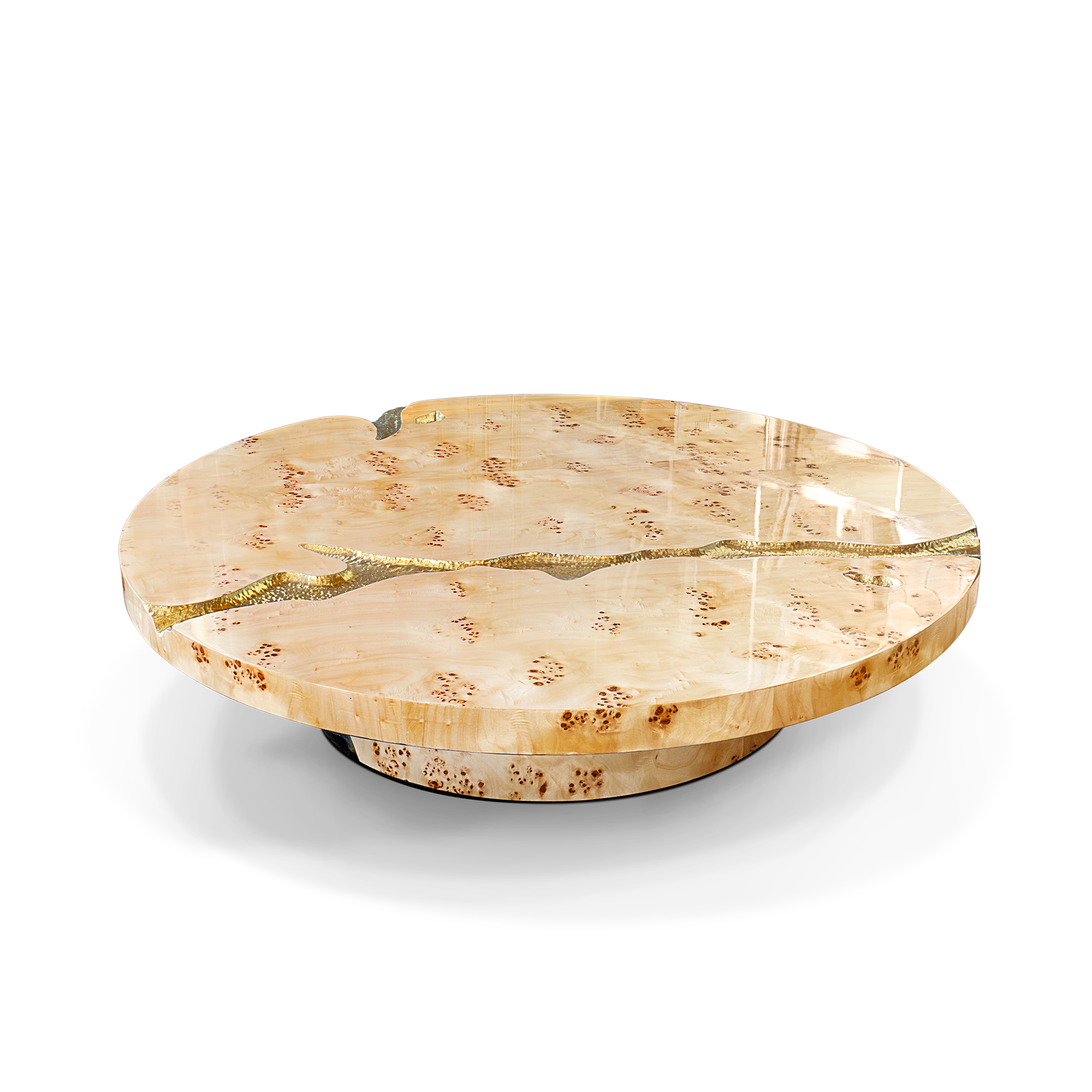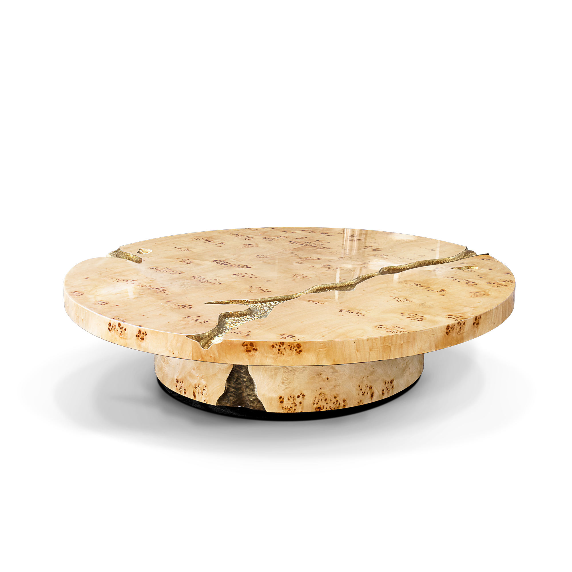 Wood structure, poplar root veneer, polished hammered brass