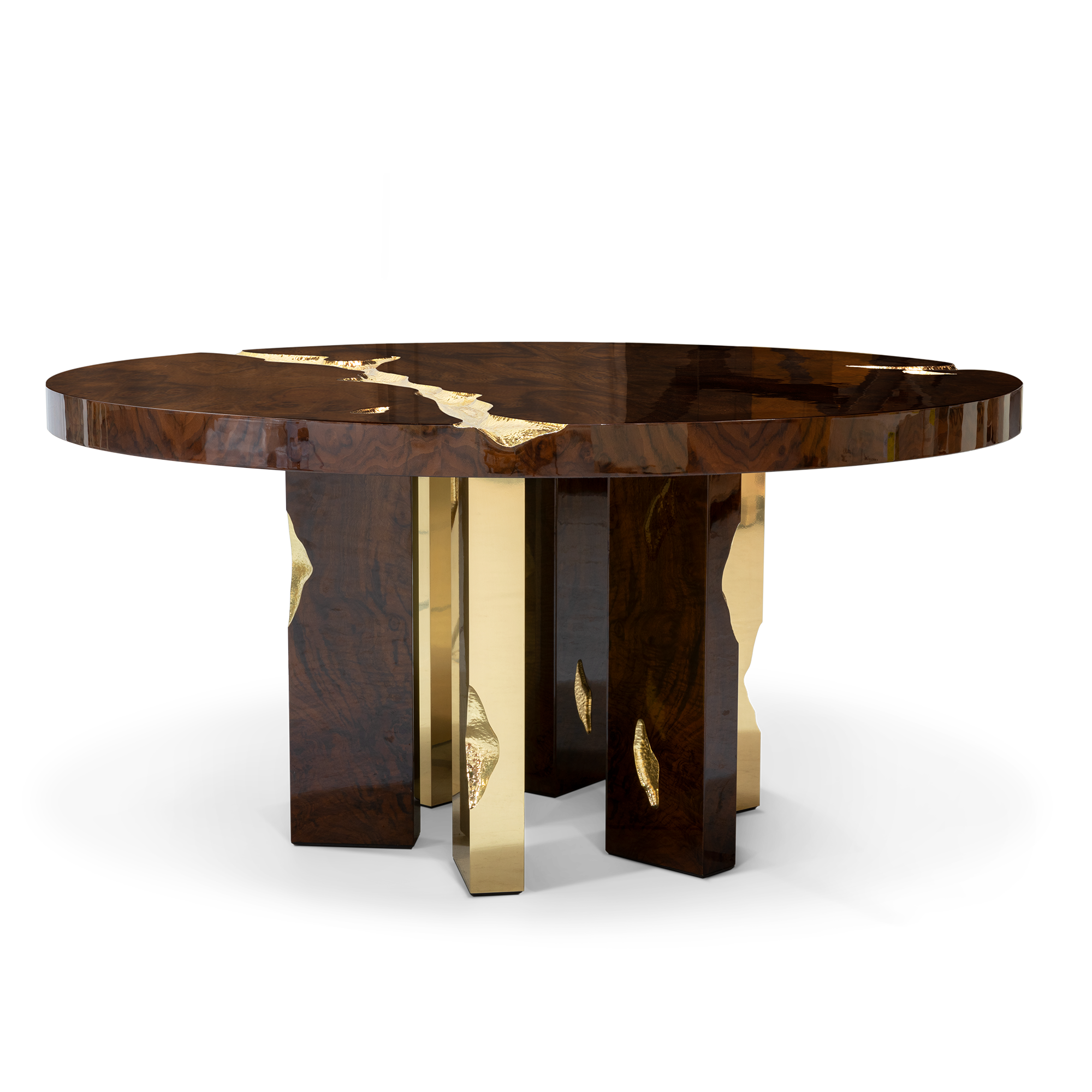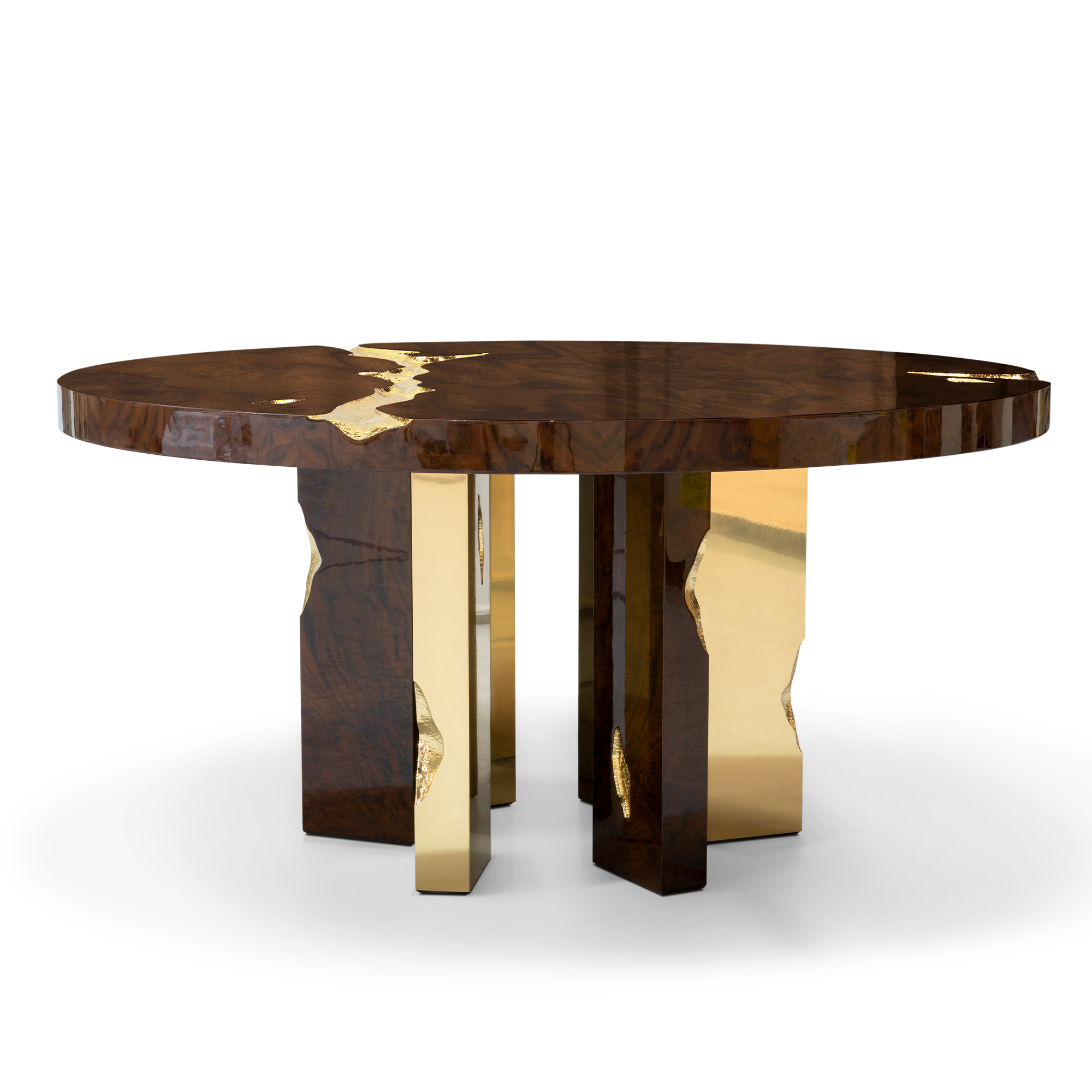 Made in wood and polished brass, this upscale round dining table is an elegant composition of two scaled organic brass tubes. It incorporates richest nature-inspired design, industrious welding techniques and a manually engraved top that emulates the outlines of log rings, reminding the timeline of a tree.