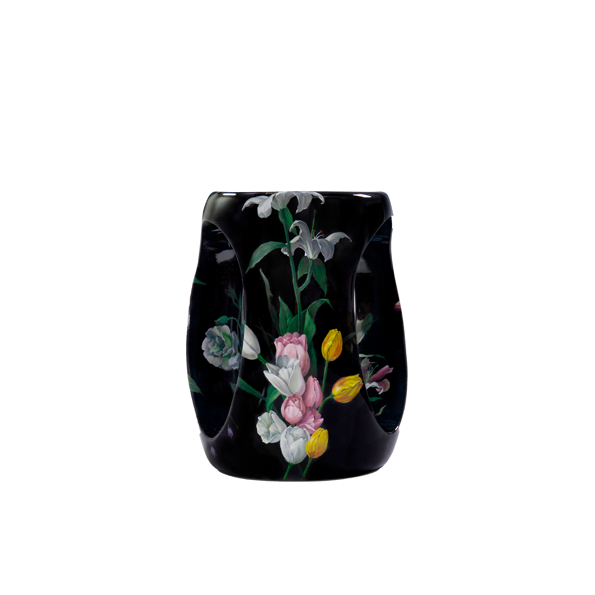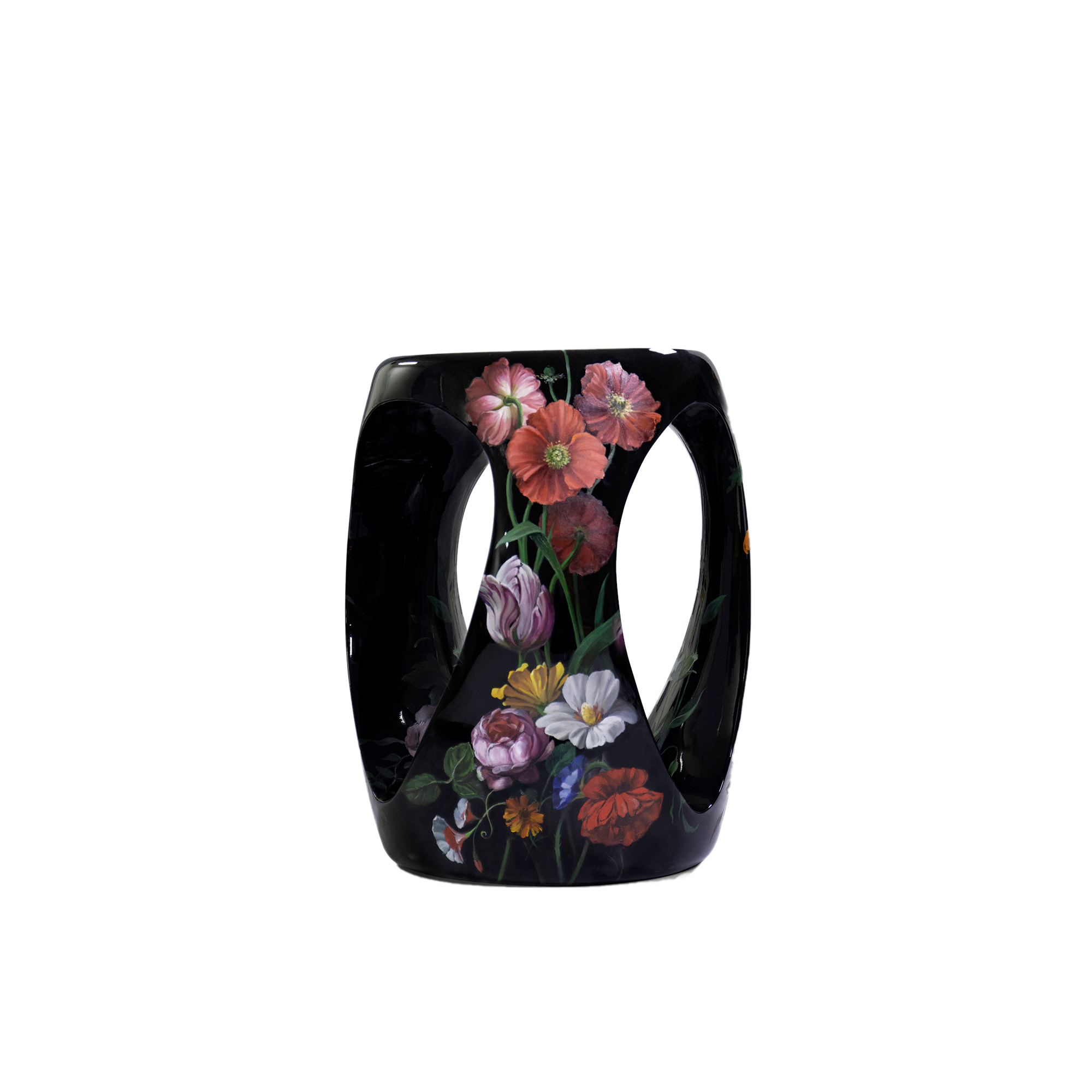 Floral is a soulful stool which evokes Portuguese Romanticism traditions thanks to its gentle flowers delineated with oil paint over a black background. It marries perfectly ancient painting techniques with contemporary design. The Floral art piece was born from the delicate oil painting, which gives a modern look to floral elements. The challenge of recreating an ancient technique to bring to life an Art stool was proposed to Santa Bárbara’s atelier, renowned in Portugal due to its high quality and detail in painting applied to restoration. Expertise in craftsmanship allowed master artisans to adapt this craft often used in furniture and murals. The result is a masterpiece filled with a unique elegance and detail which can only be achieved by hand craft. Its pictorial quality is remarkable.