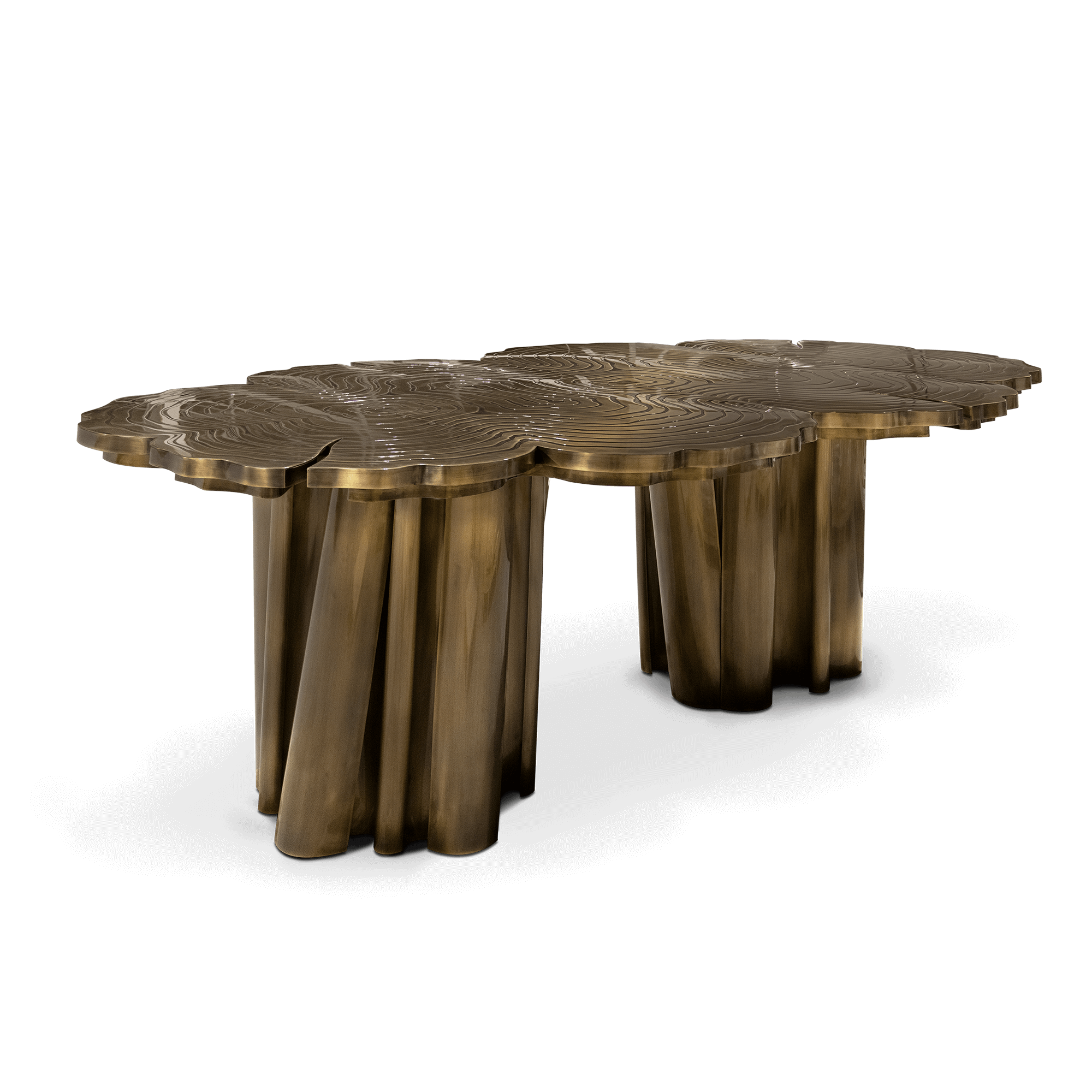 Made in wood and polished brass patina, this upscale dining table incorporates richest nature-inspired design, industrious welding techniques and a manually engraved top that emulates the outlines of log rings, reminding the timeline of a tree. Below the expansive 8 seat dining table top is an elegant composition of two scaled organic brass tubes.