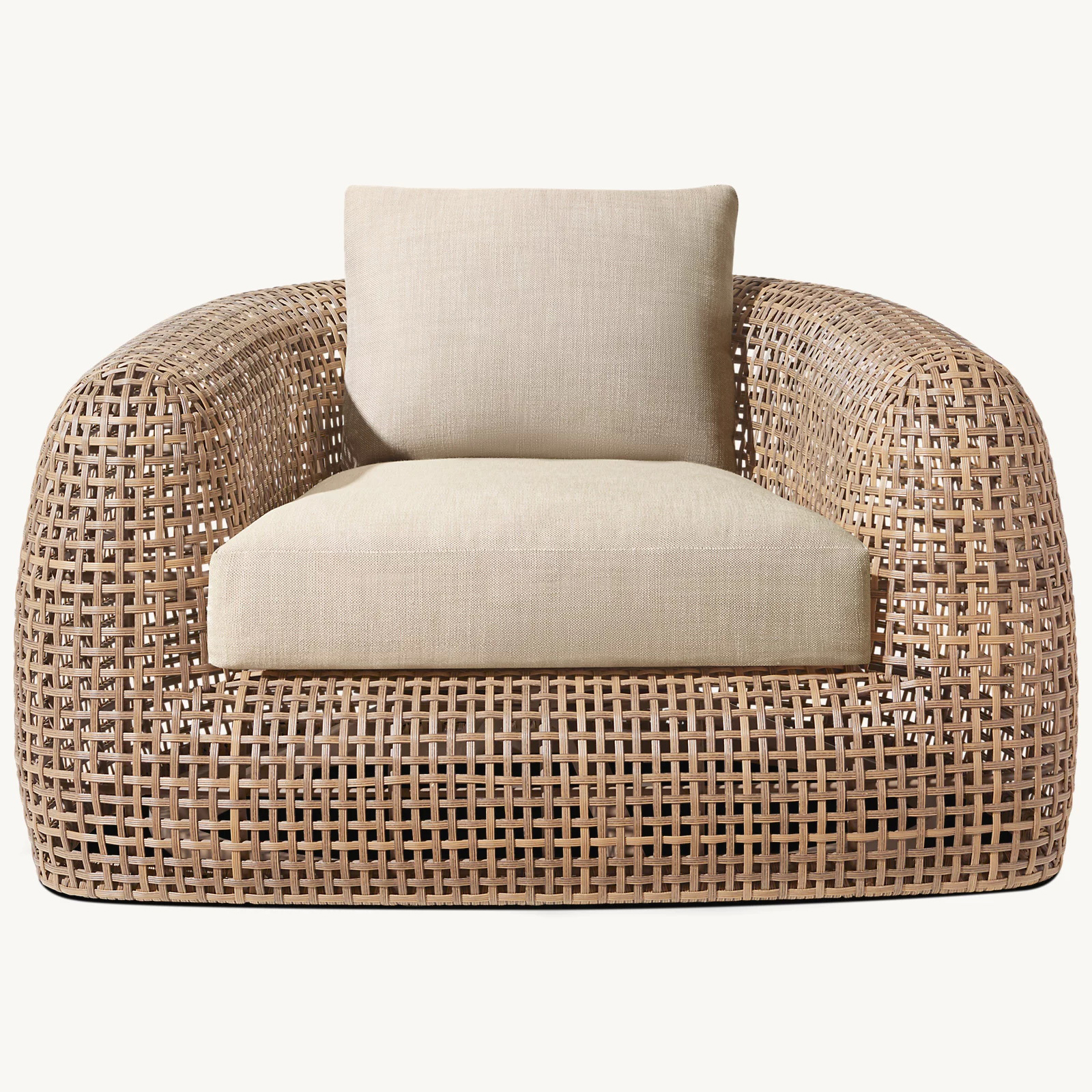 Premium Quick-Dry cushions are engineered with an open-cell reticulated foam core and mesh bottom panel, allowing water to drain rapidly and air to circulate freely; loose back cushions are quick-dry foam wrapped with polyfiber