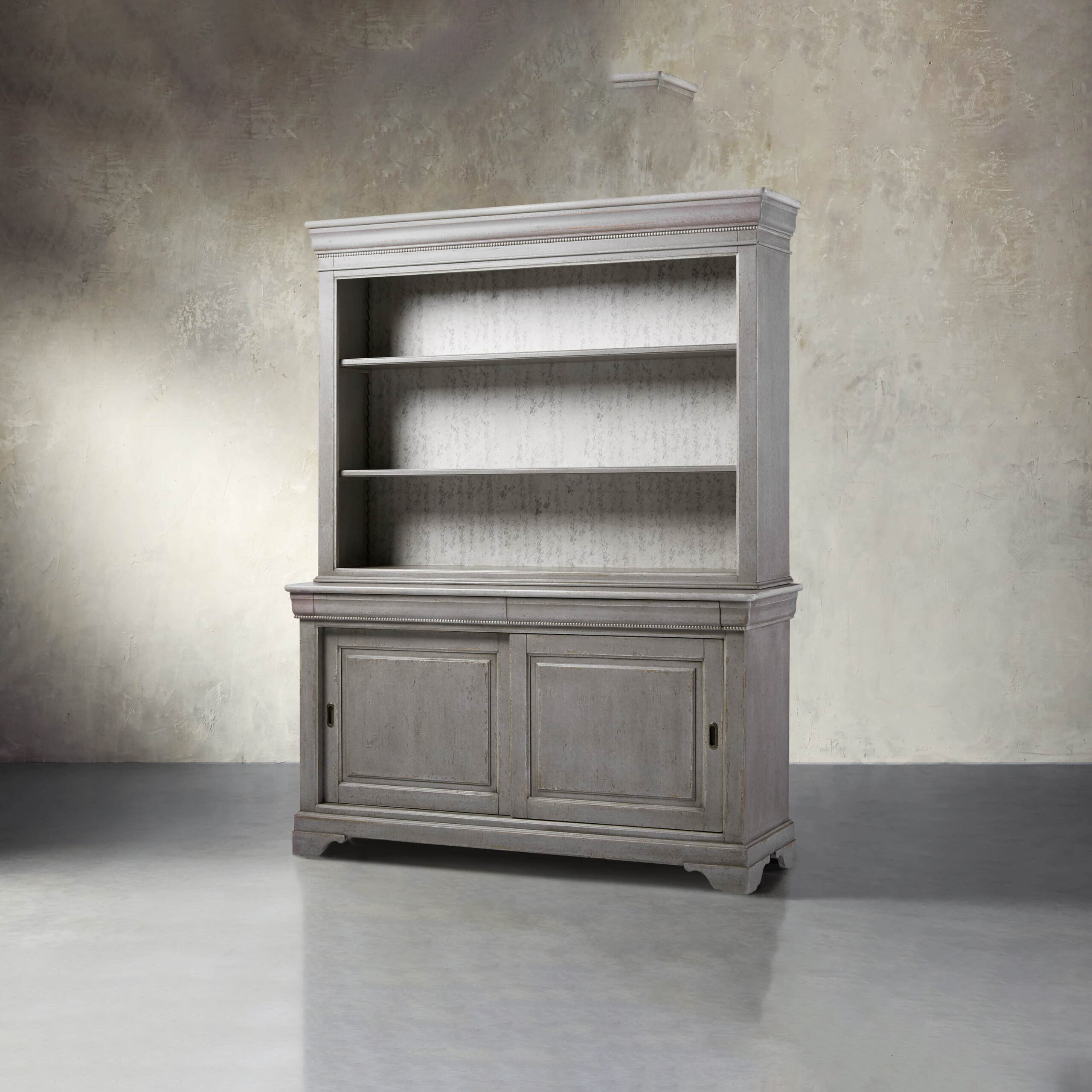 Hand-applied Antique Grey finishes are layered with stain, paint, and glaze to achieve a timeworn appearance with elegant detailing.