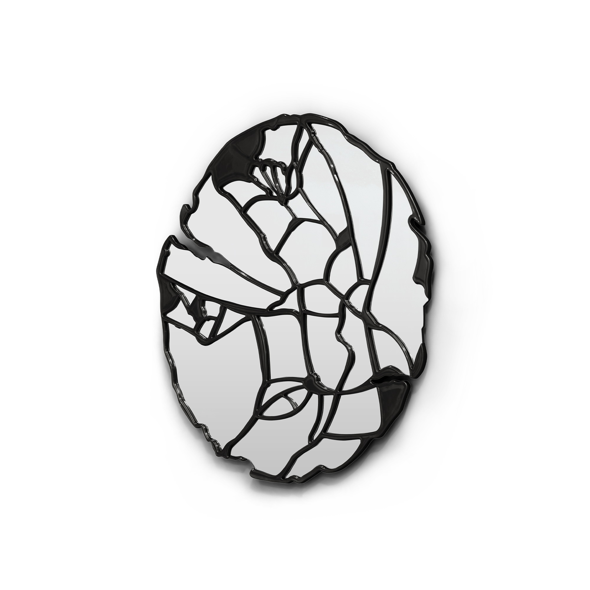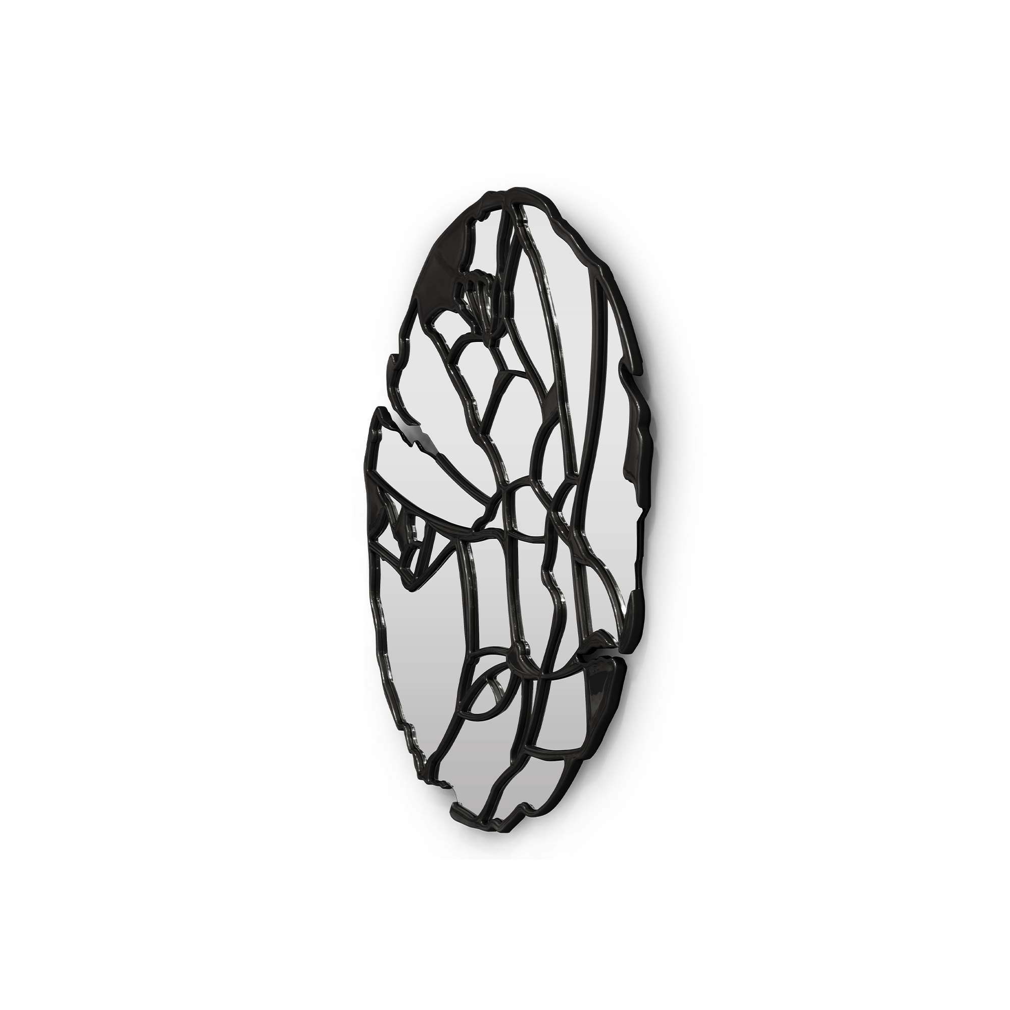 The Glance Black Mirror structure is produced in wood crafted by hand with a glossy black lacquer finish. The structure follows organic geometry where thirty-six normal mirrors with organic cuts are placed.
