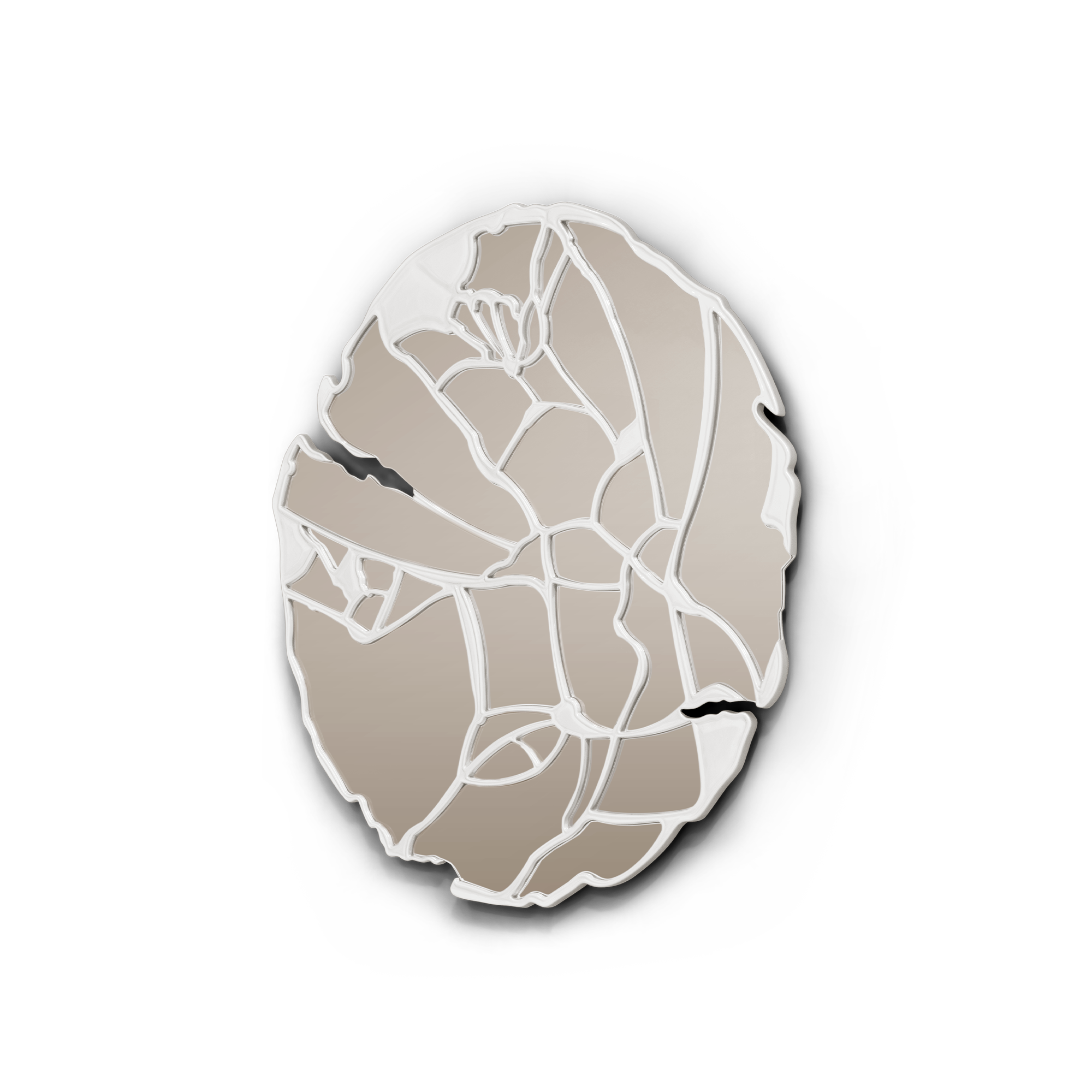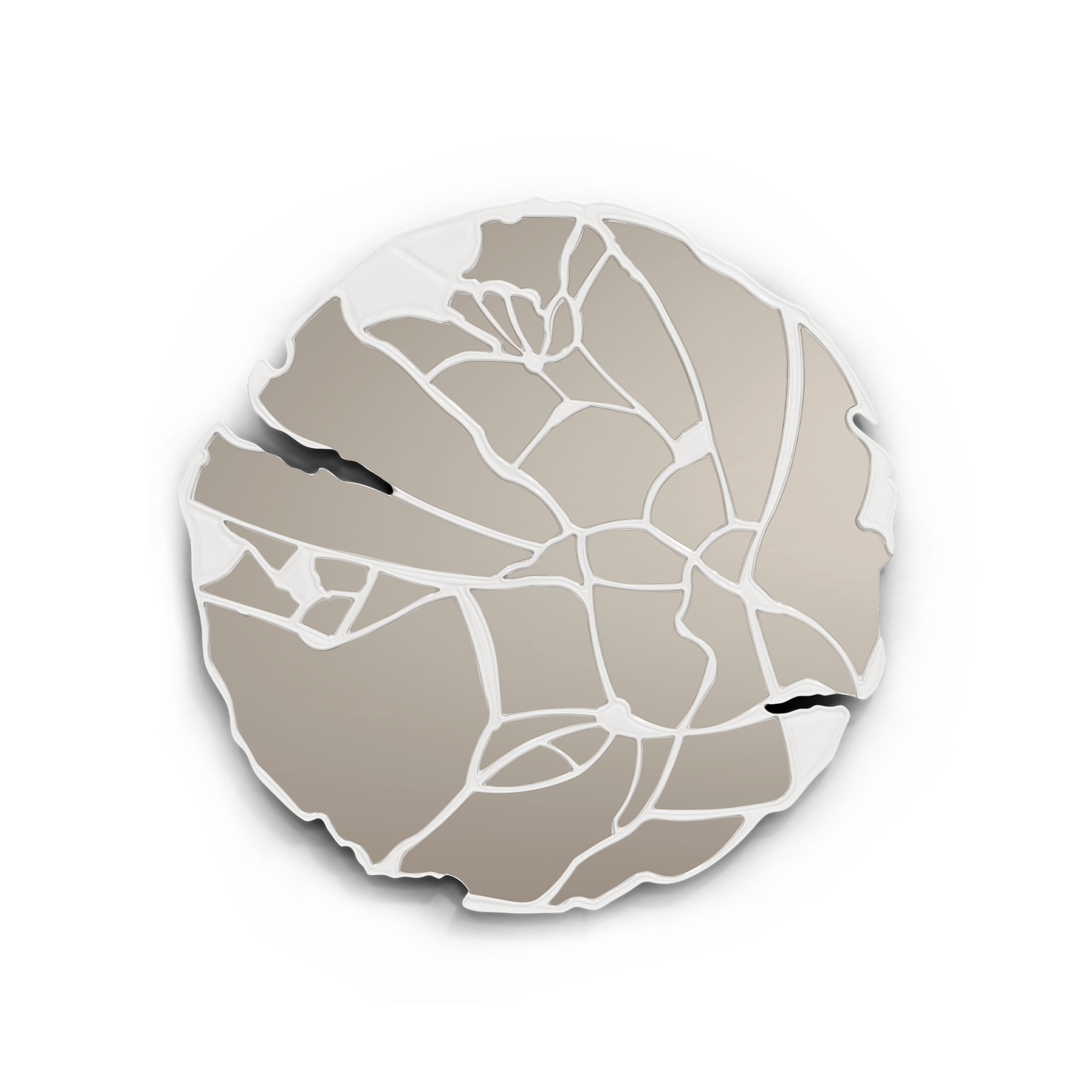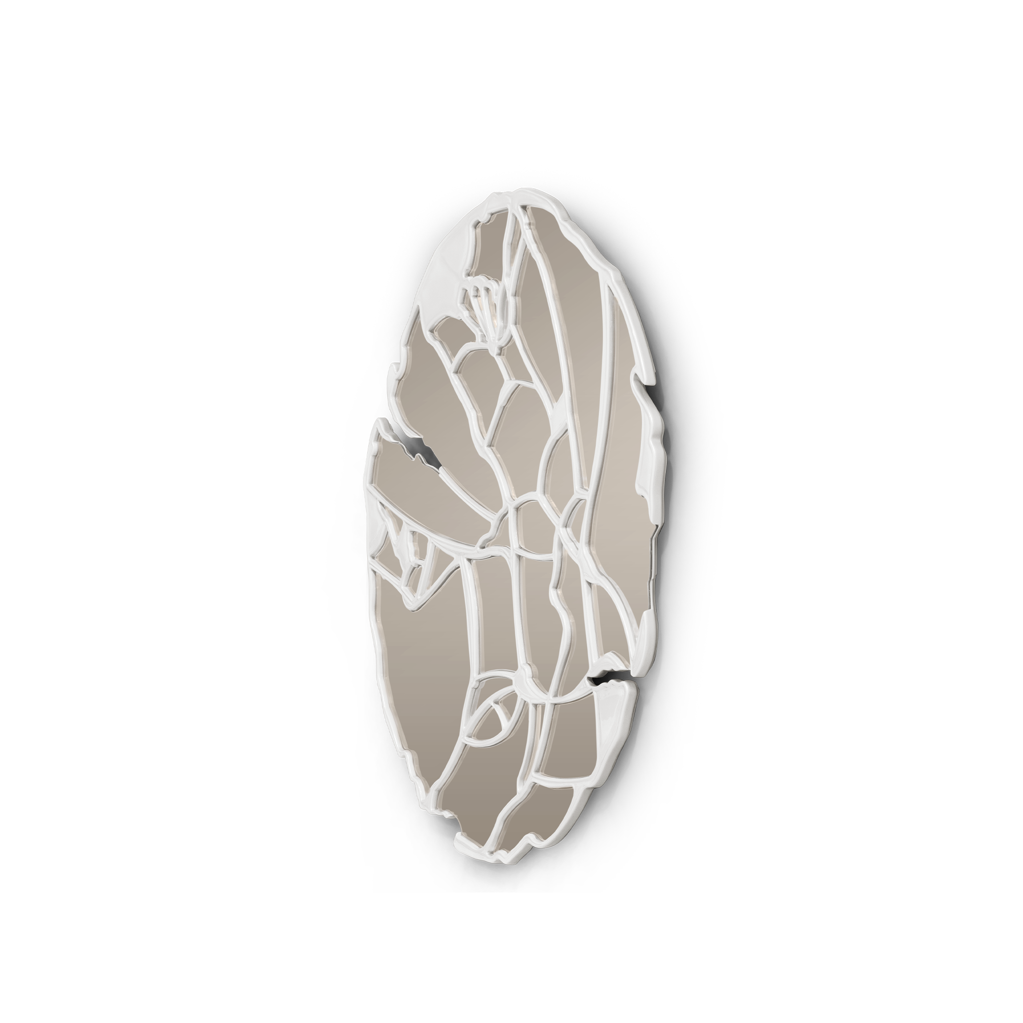 The Glance Cream Mirror structure is produced in wood crafted by hand with a glossy white lacquer finish. The structure follows organic geometry where thirty-six normal mirrors with organic cuts are placed.
