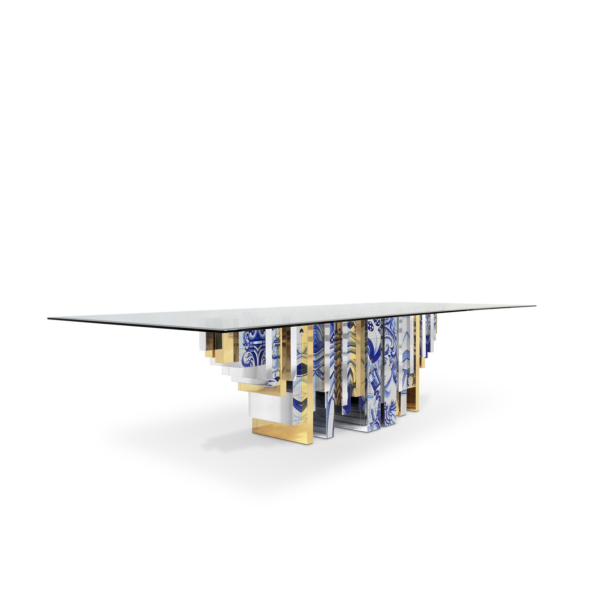 The Heritage Dining Table, much like its sibling Heritage Sideboard and Cabinet, is a highly sophisticated piece inspired by Portuguese history through the use of traditional hand painted azulejo tiles. Its noble design features bold lines, with alternating polished brass, bevelled mirror and azulejo strips and a tempered glass top, which reflect your dining room’s finest elements, yet adding a touch of warmth and finesse.
