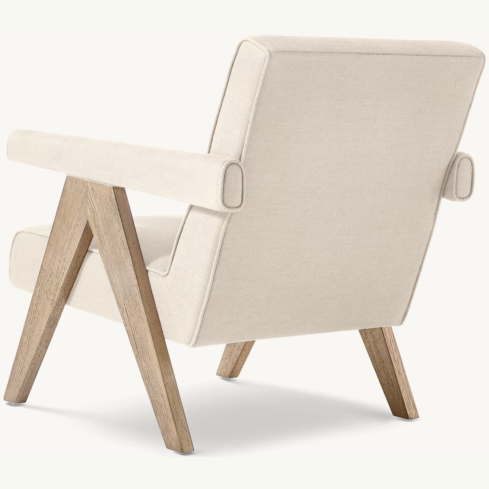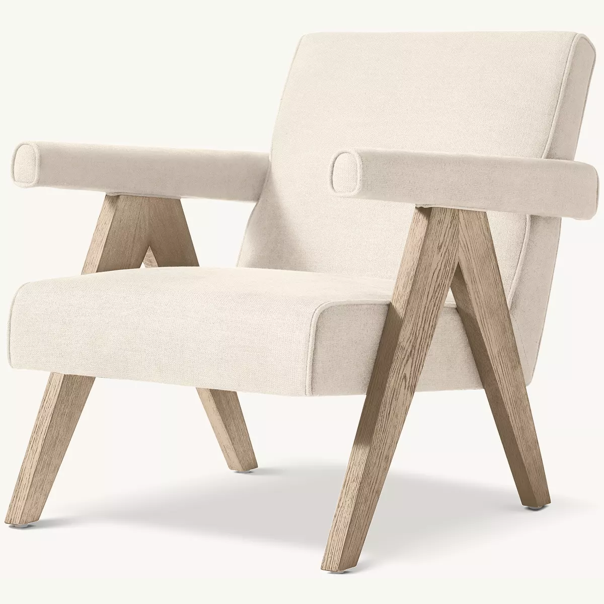 Inspired by the iconic midcentury modern Chandigarh chair by Pierre Jeanneret, our design embodies purity, simplicity and functionality. Expertly crafted of solid American oak with smartly tailored upholstery, its canted seat and back are framed by plank arms and inverted-V legs that taper subtly to the ground, forming a striking silhouette. Guaranteed for life.