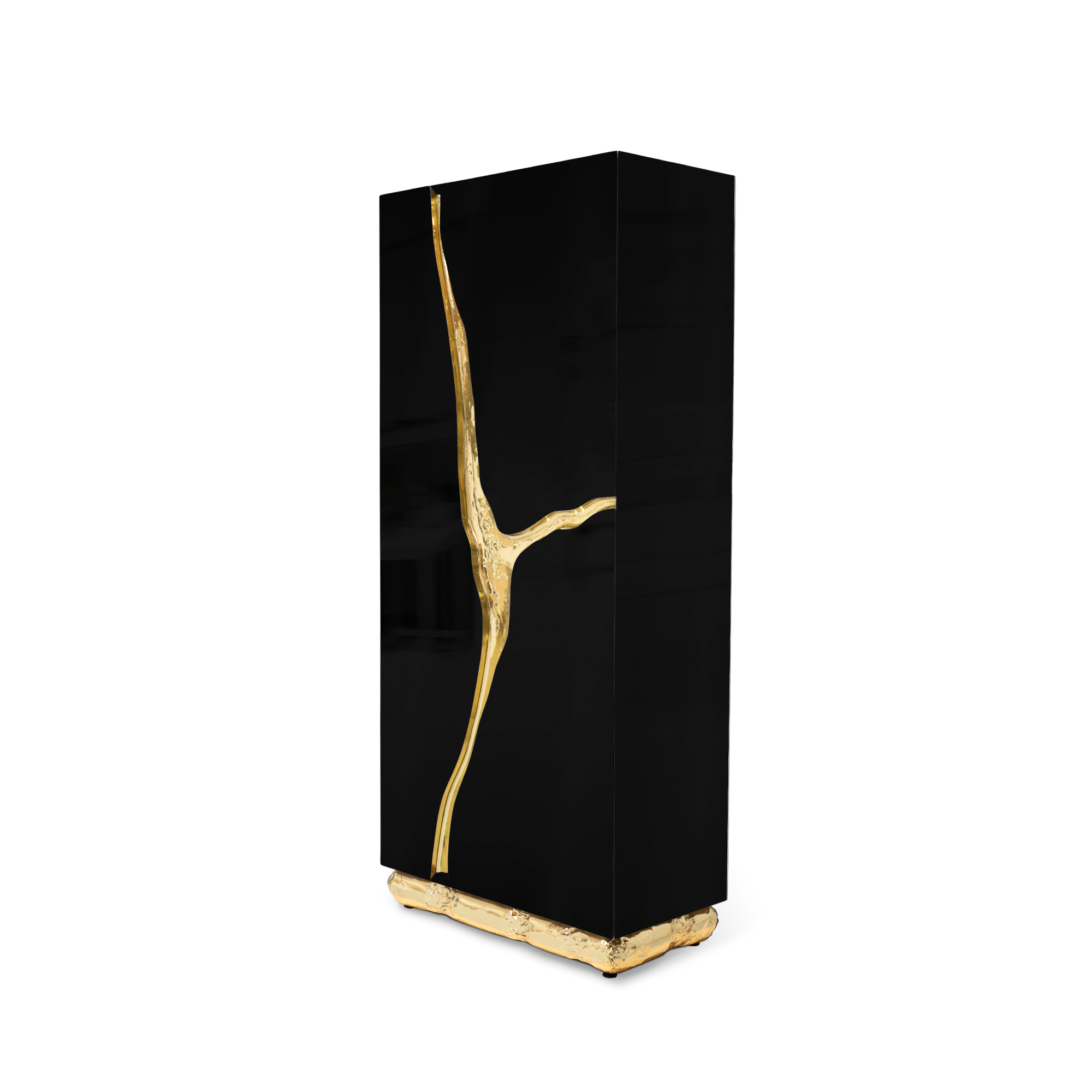 Lapiaz cabinet table takes exceptional craftsmanship and design to a new realm. A functional artwork conceived with three doors, six glass shelves and six drawers decorated by handcrafted brass handles. Its organic features are achieved through the manual fitting of the polished brass sheet, and a sharp exterior and interiors finished in glossy black lacquer. The hammered brass details convey both dynamics and elegance to bring a new contemporary verve into refined interiors. Finding beauty in the most unexpected places, this sophisticated cabinet is inspired by authentic karst formations created by surface dissolution, freezing, or thawing of dolomite rocks. Born from cold and freshly cracked to showing off the world rich, golden interior.