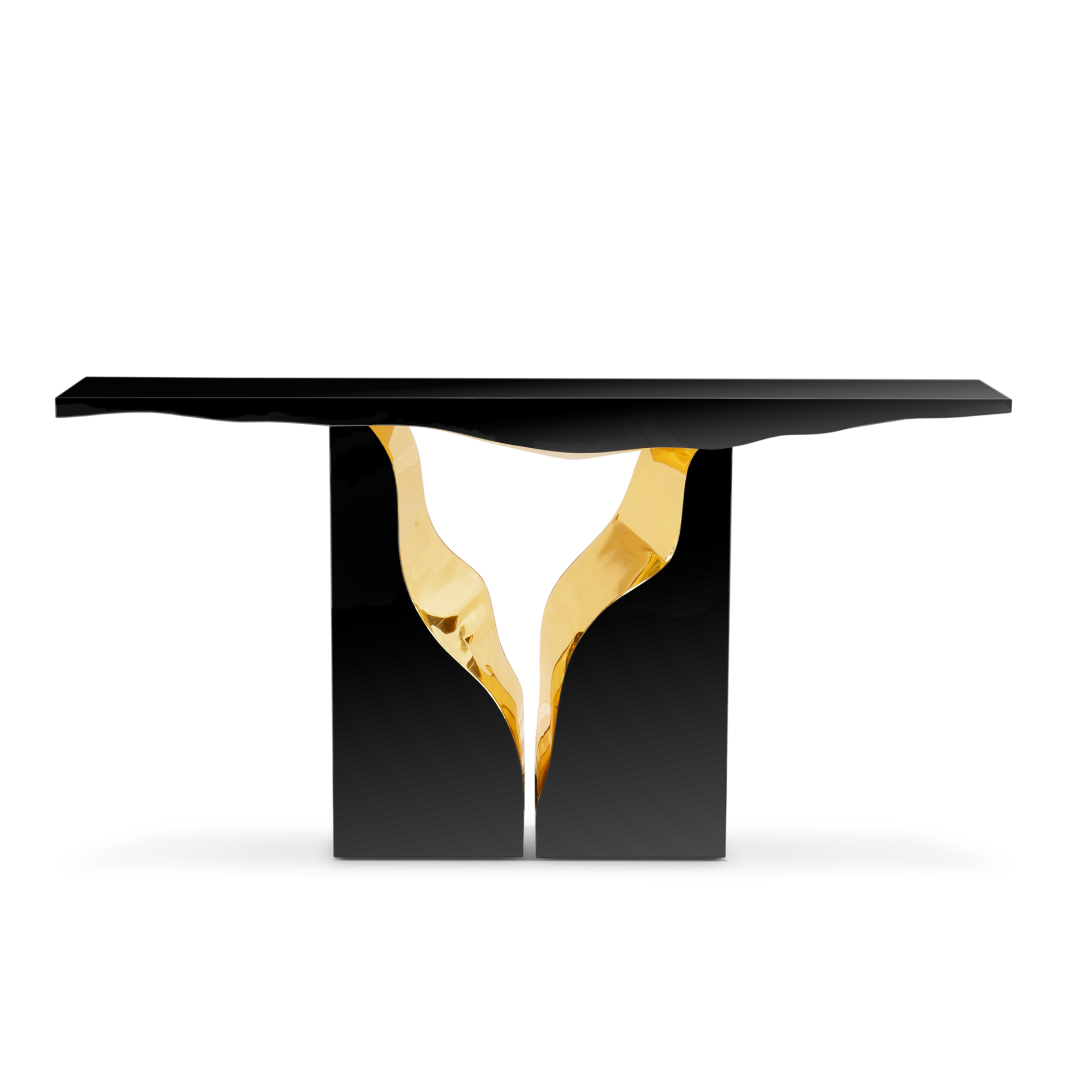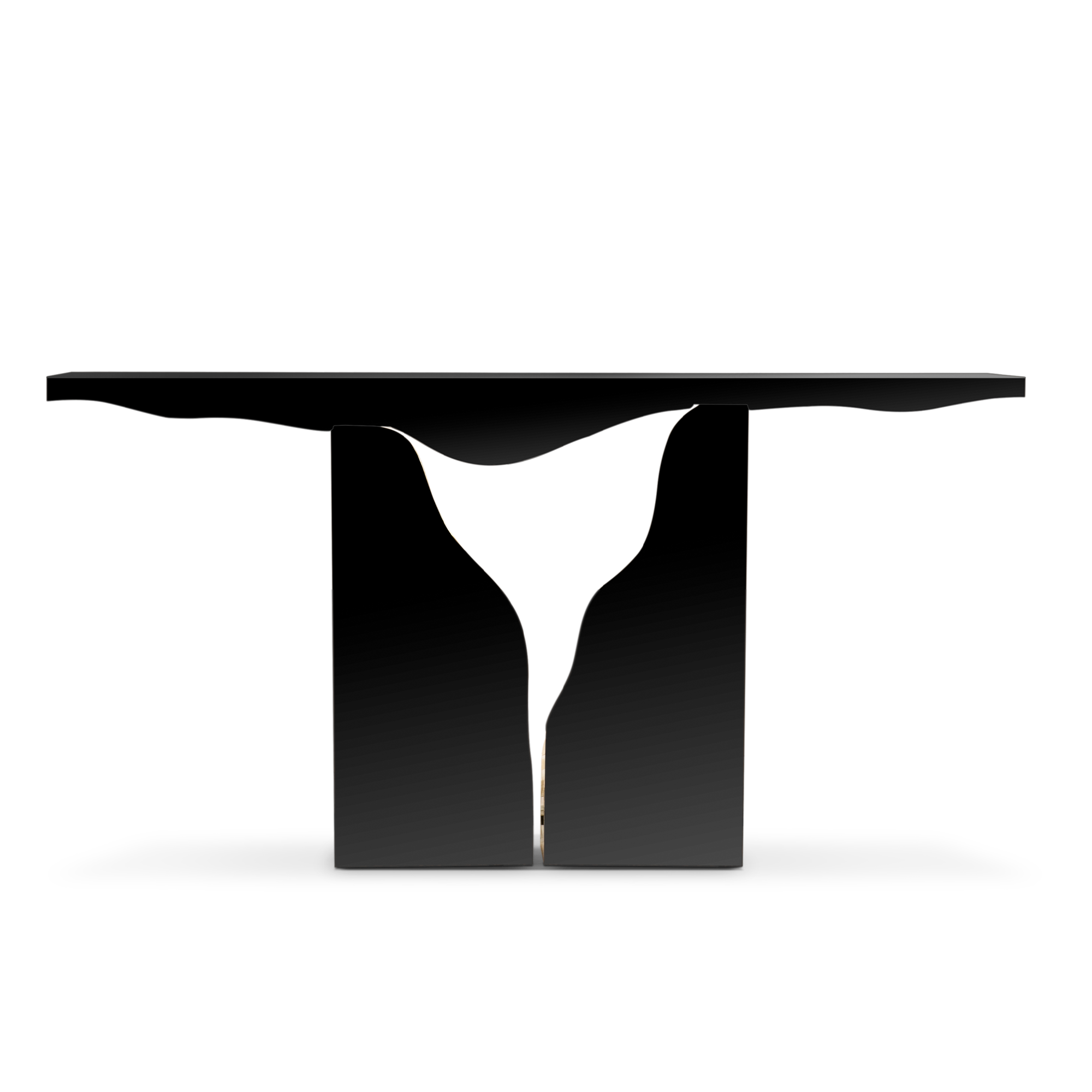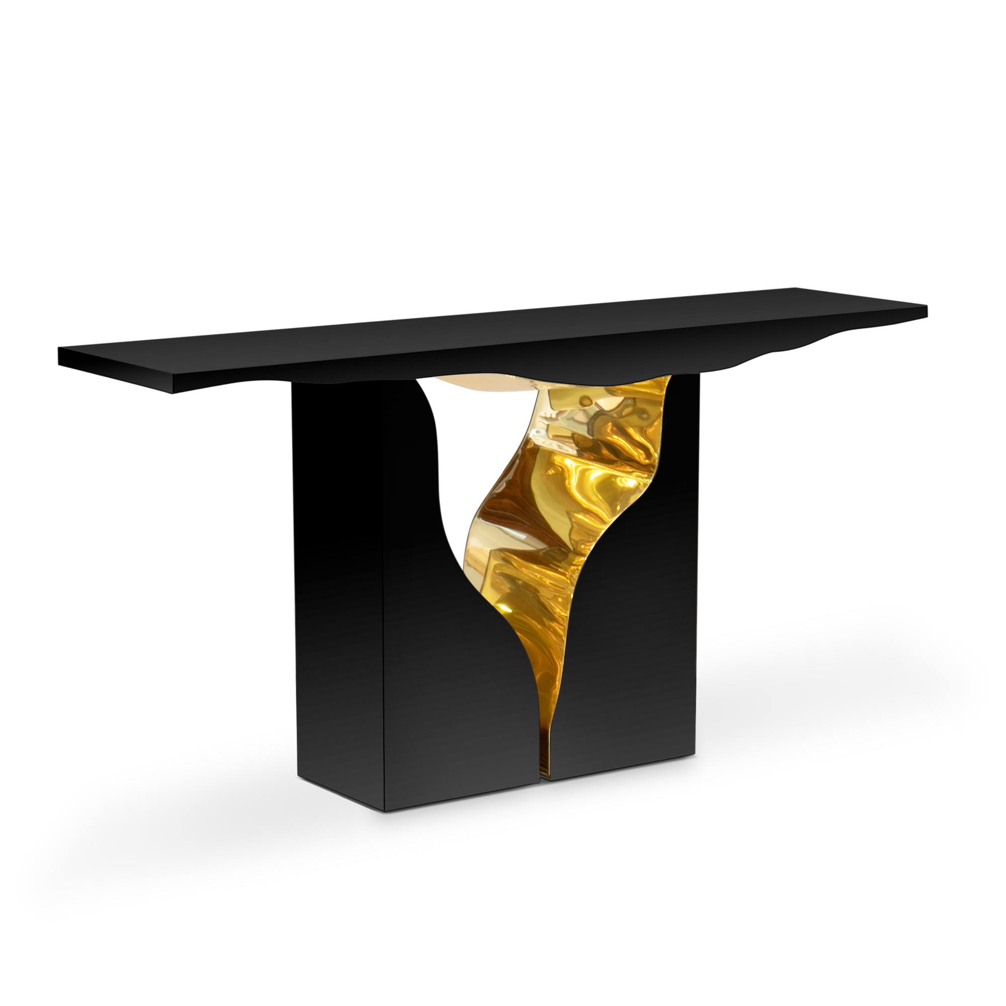 Lapiaz console takes exceptional craftsmanship and design to a new realm. With the inside finished in polished brass, and an exterior finished in a sharp glossy black lacquer, its organic features are achieved through the manual fitting of the brass sheet, conveying both dynamics and elegance to bring a new contemporary verve into refined interiors. Finding beauty in the most unexpected places, this contemporary console is inspired by authentic karst formations created by surface dissolution, freezing or thawing of dolomite rocks. A functional artwork piece born from cold and freshly cracked to showing off the world rich, golden details.