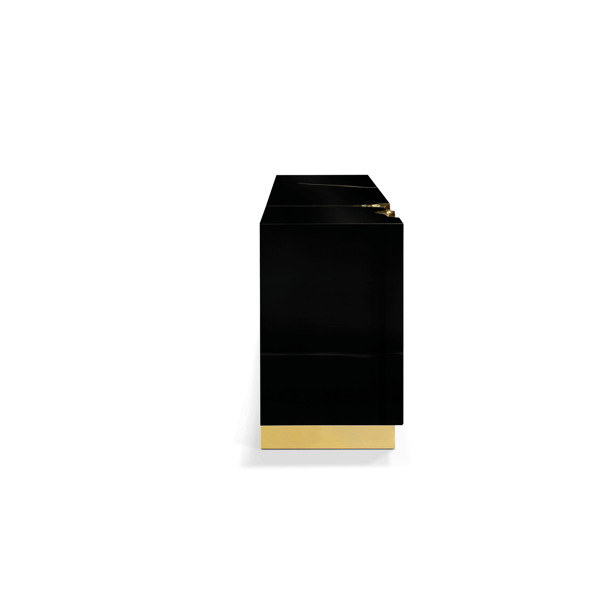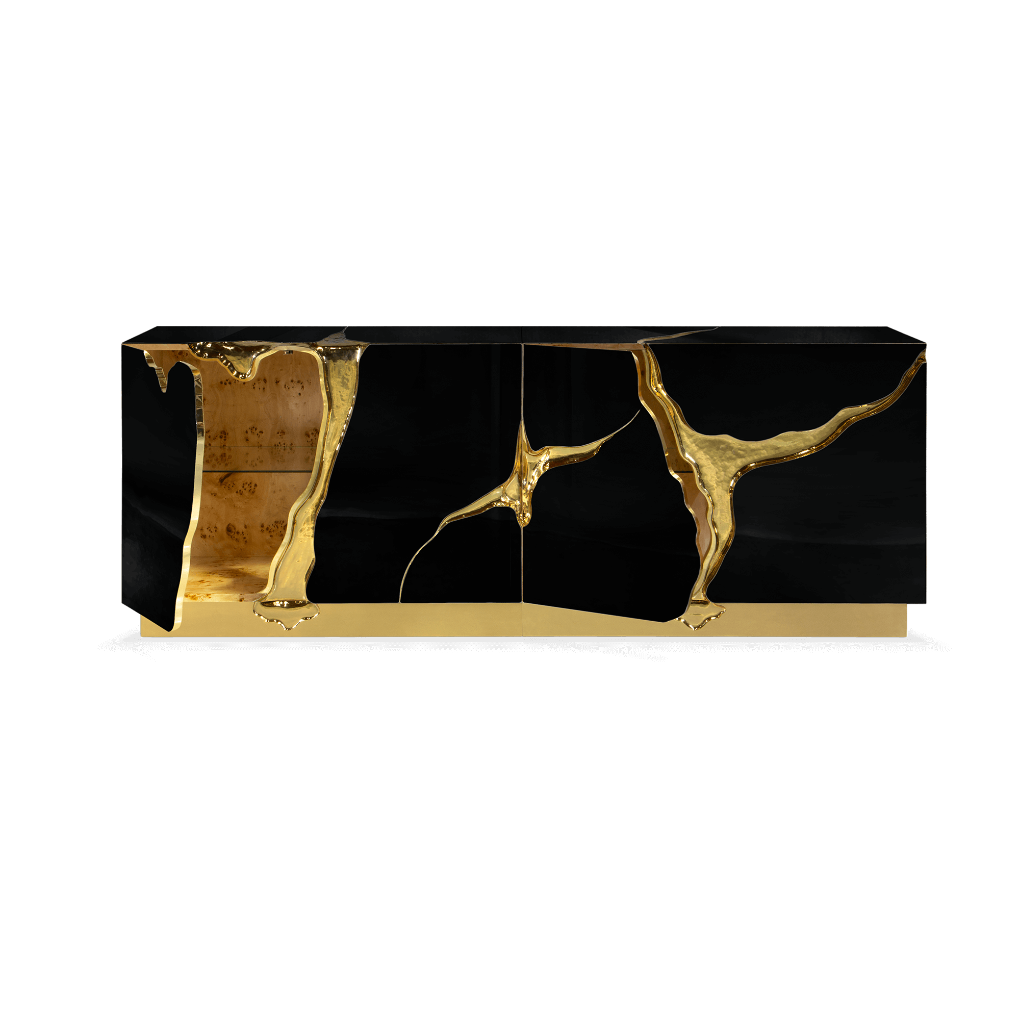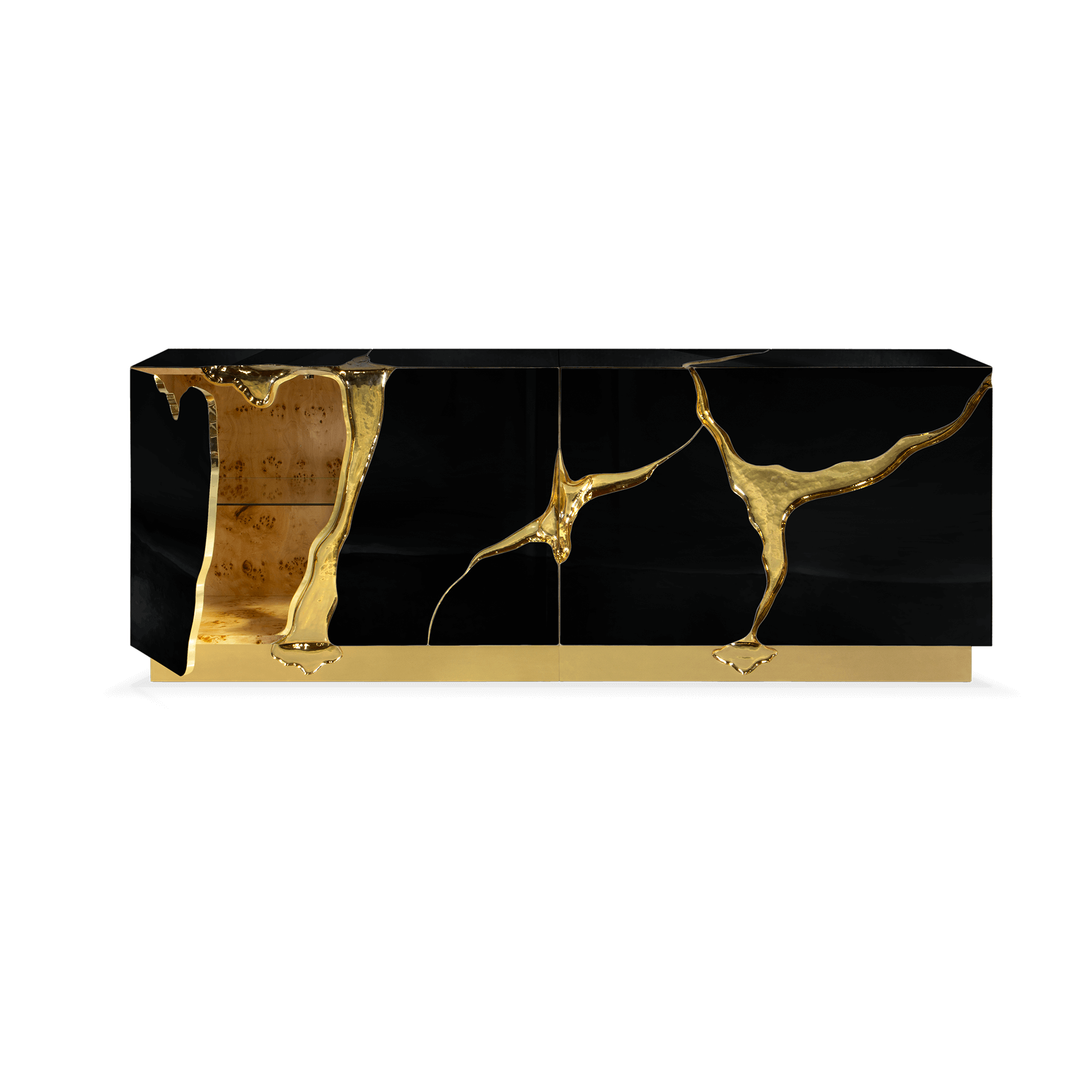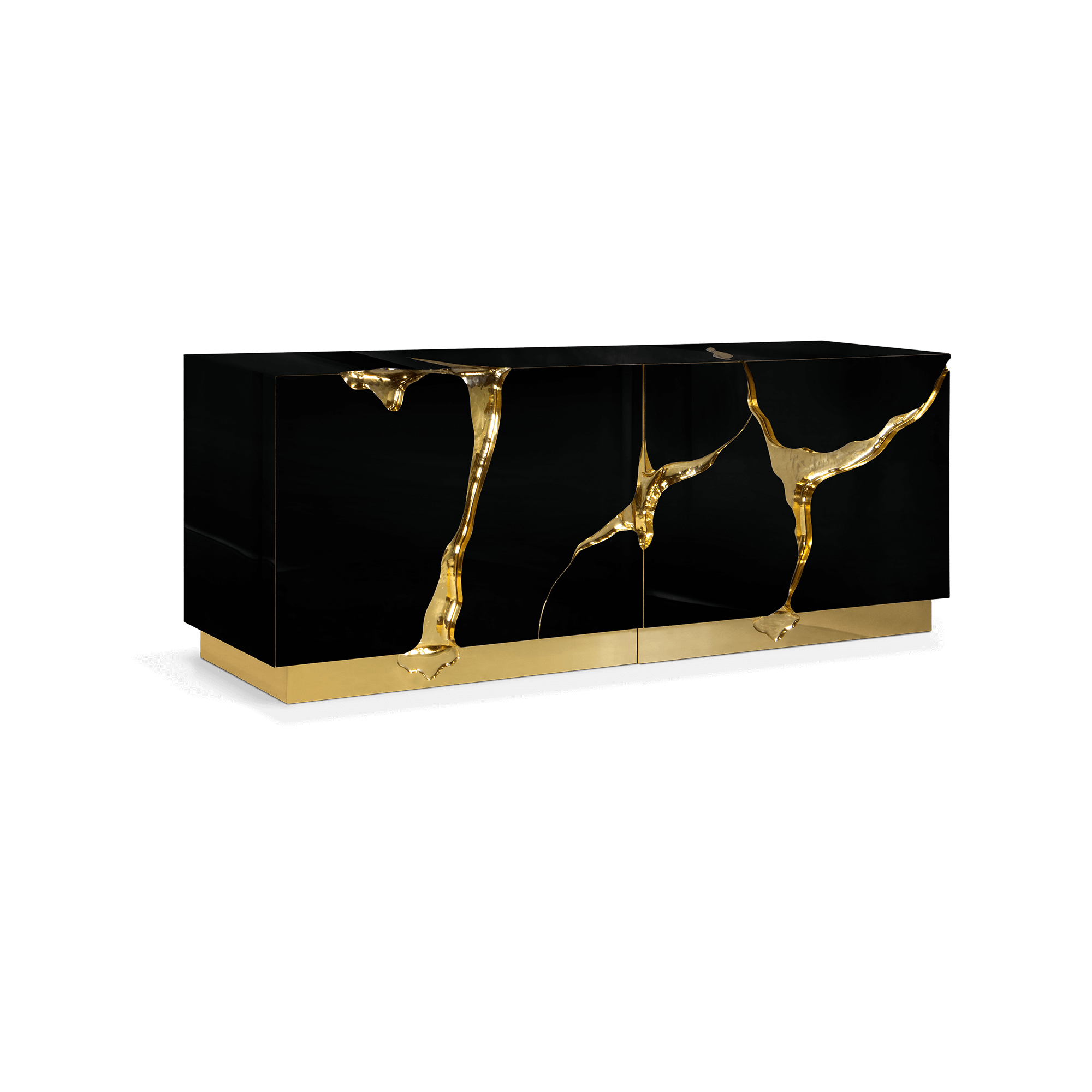 Its organic features are achieved through the manual fitting of polished brass, and a warmth black veneer finish that bursts from the inside to the distinct exterior façades. Different-shaped doors and drawer are embellished by hammered gold details, conveying both sophistication and elegance to bring a new contemporary verve into refined interiors. Finding beauty in the most unexpected places, this luxe sideboard born from authentic karst formations created by surface dissolution, freezing, or thawing of dolomite rocks.