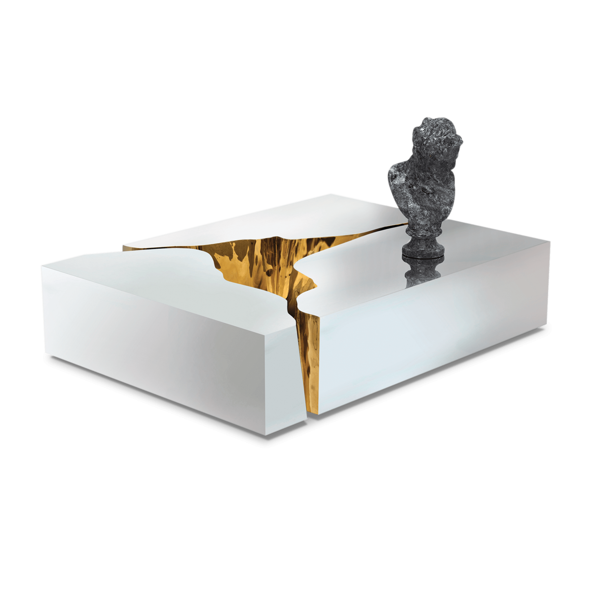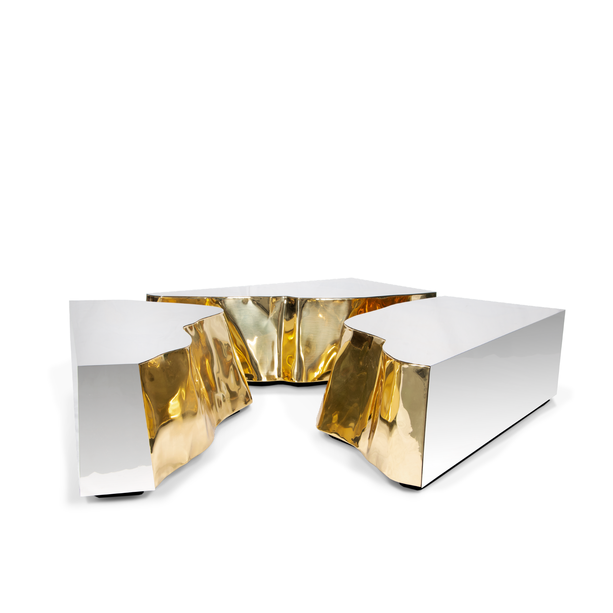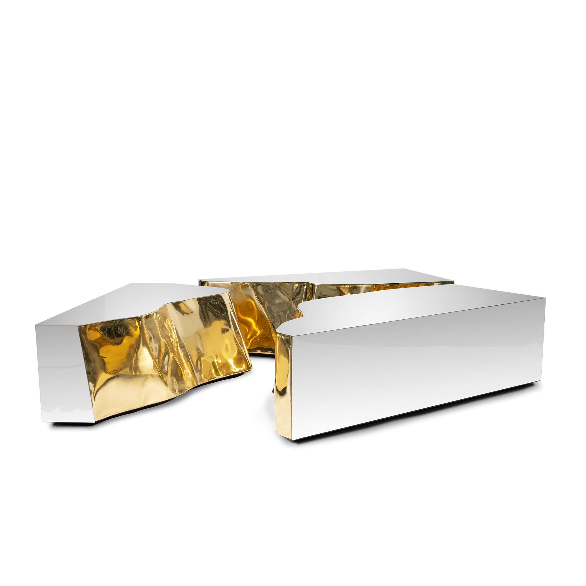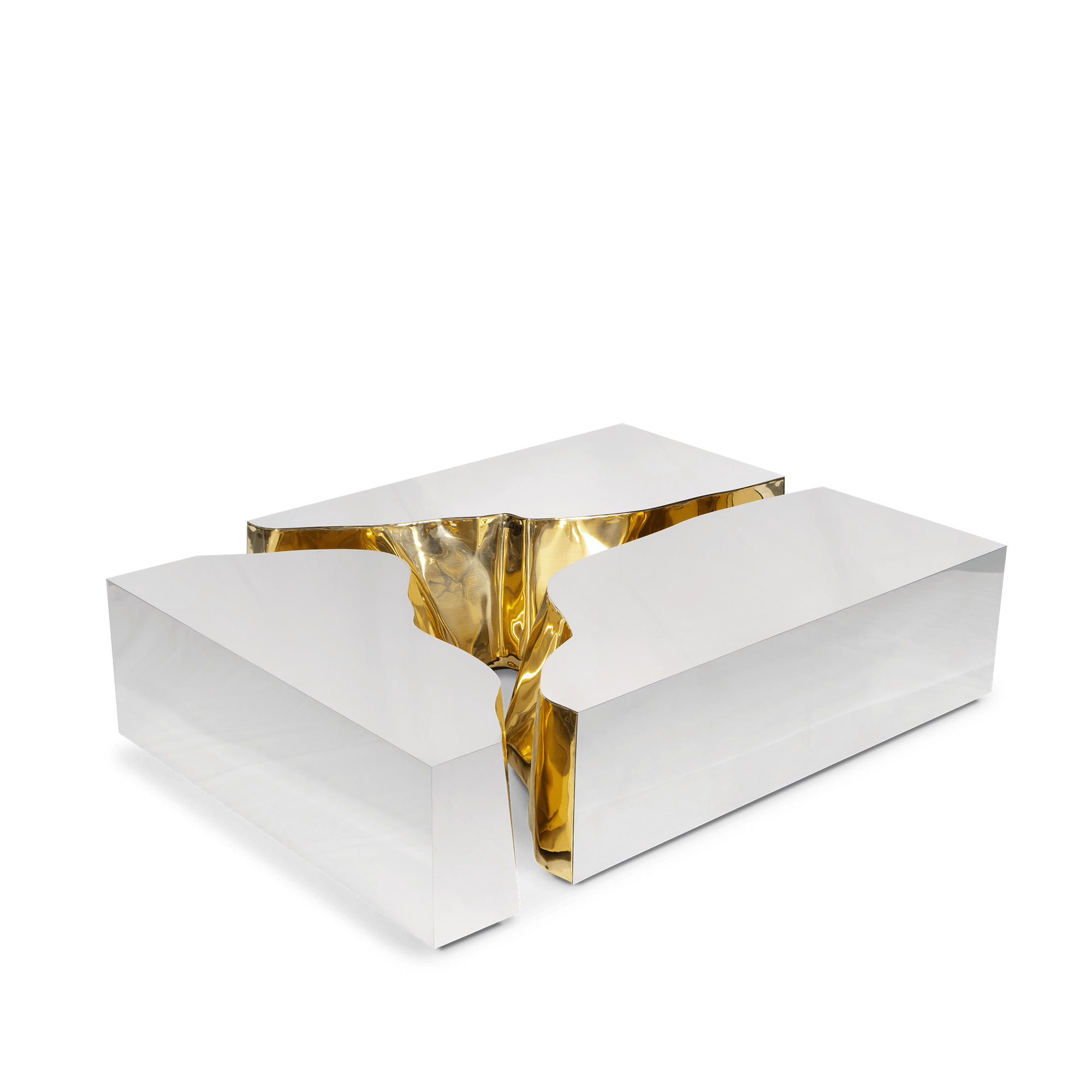 Lapiaz center table takes exceptional craftsmanship and design to a new realm. Finding beauty in the most unexpected places, this contemporary design piece is inspired by authentic karst formations. Its organic features are achieved through the manual fitting of the polished brass sheet, and a sharp exterior finished in polished stainless steel that portrays a perfect mirror. The hammered brass details and mirrored sides conveys both dynamics and elegance, a beautiful duality between power and refinement to bring a new contemporary verve into interior design. A functional artwork conceived in three modules for unexpected combinations. Born from cold and freshly cracked to showing off the world rich, golden interior.