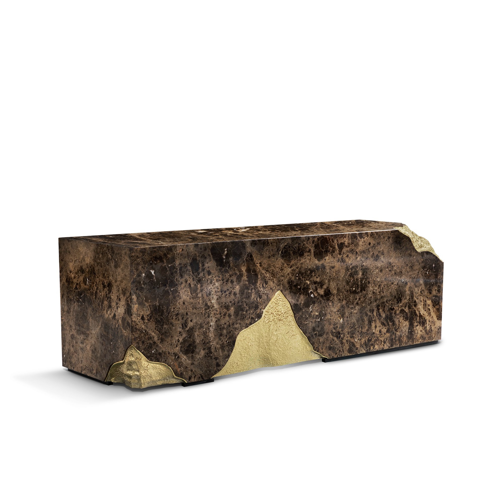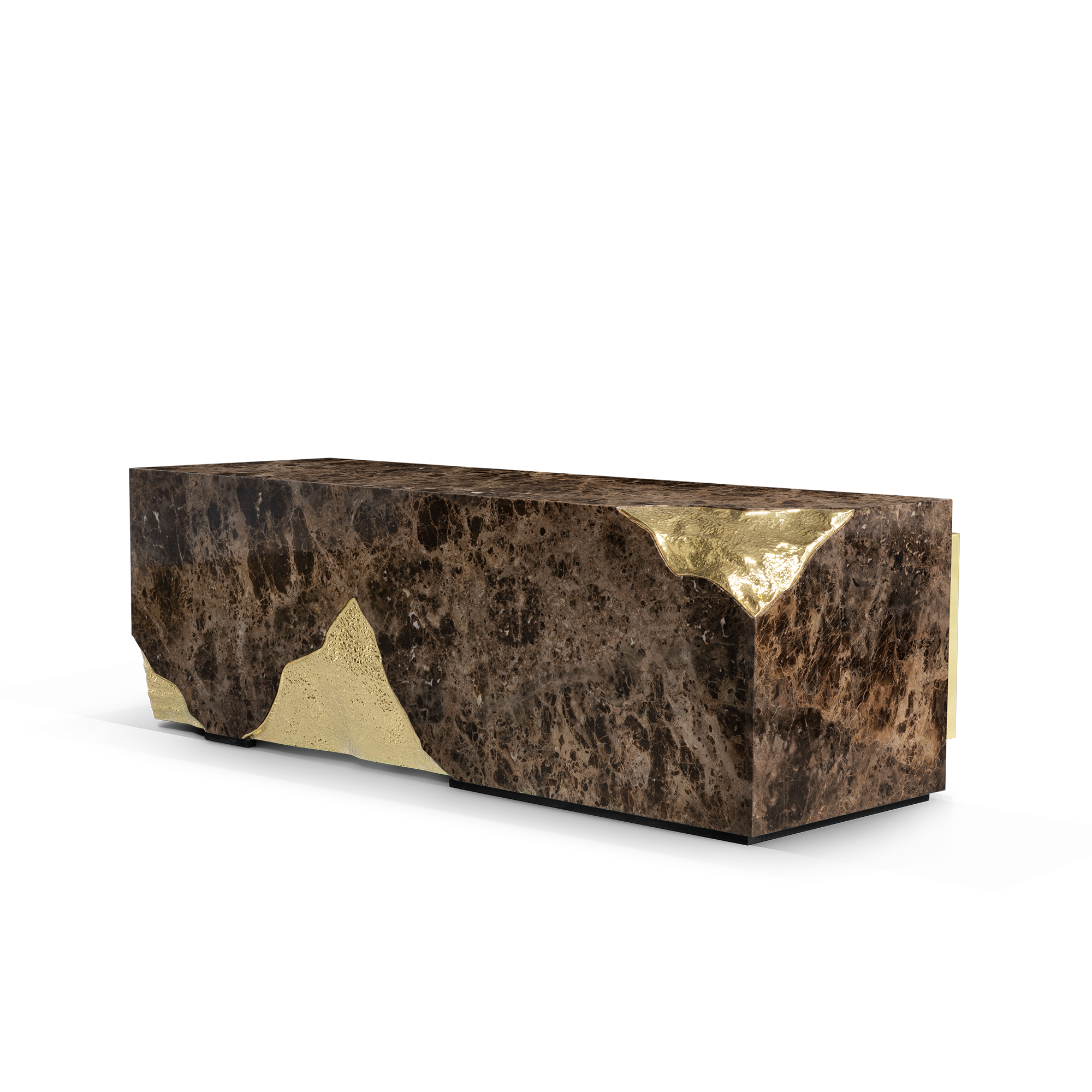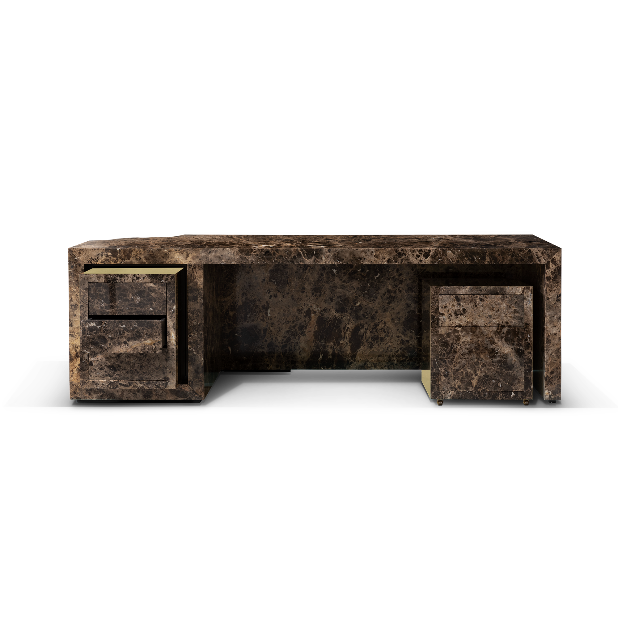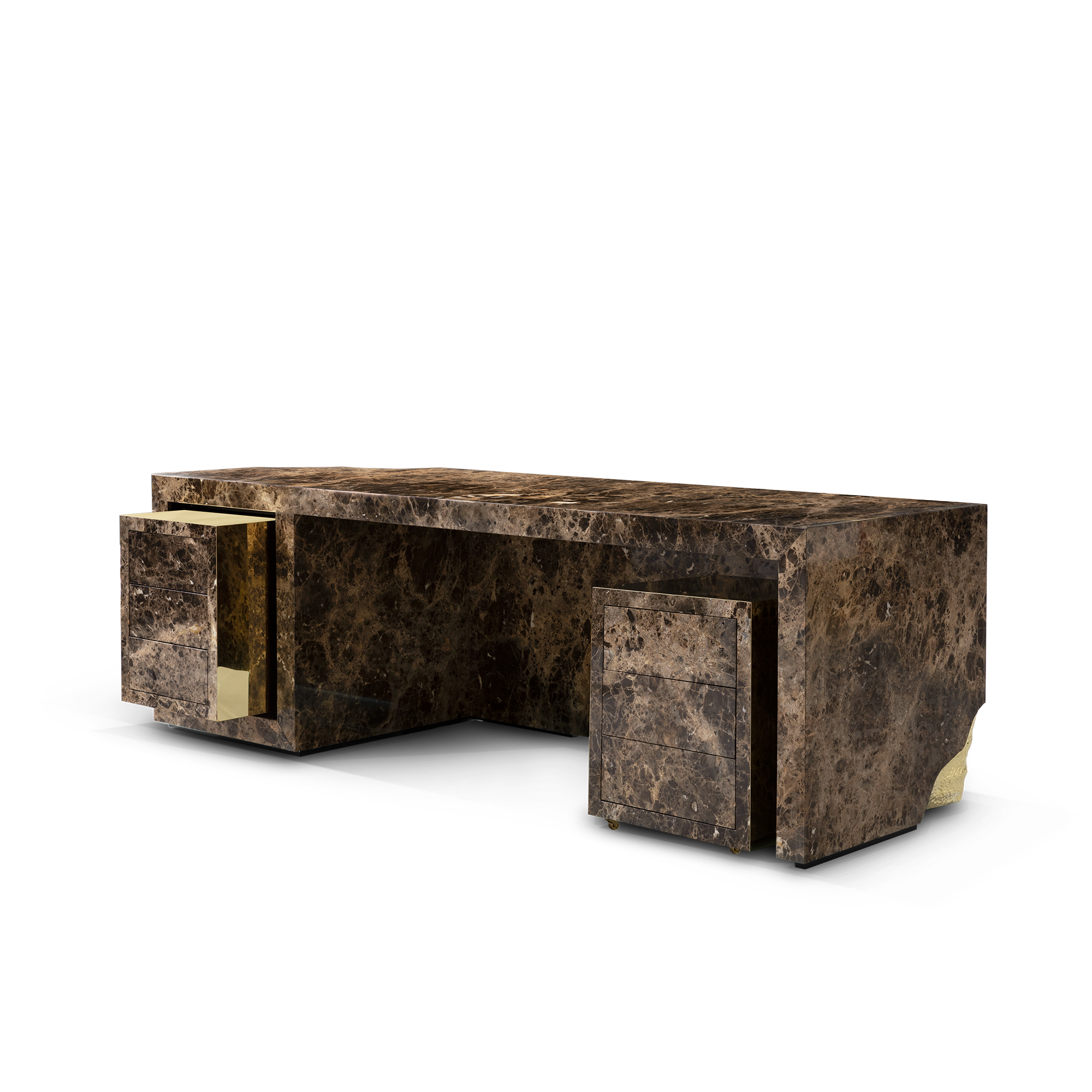 The Lapiaz Desk takes exceptional craftsmanship and design to a new realm. Its organic features are achieved through the manual fitting of polished brass, with a rich walnut root veneer that bursts from the inside to the distinct exterior façades. The desk’s surface is split by a striking fissure, which is enhanced by the hammered gold detailing, conveying both sophistication and elegance, and bringing a contemporary verve into refined interiors. Finding beauty in the most unexpected places, this luxe desk is inspired by authentic karst formations created by surface dissolution, freezing, or thawing of dolomite rocks. The Lapiaz Desk is a statement piece, embodying the fusion of functionality and artistic beauty, perfect for any luxury office or workspace.