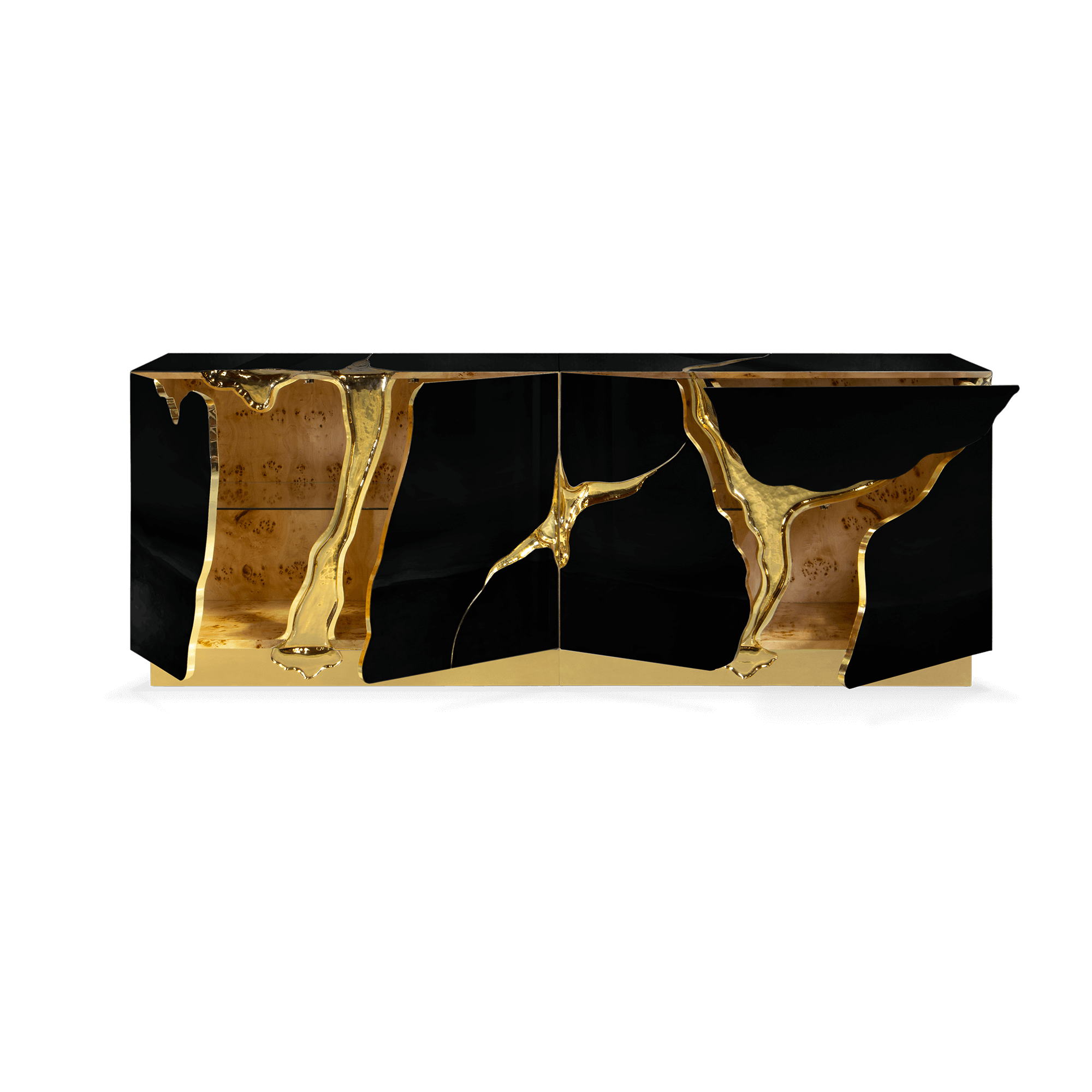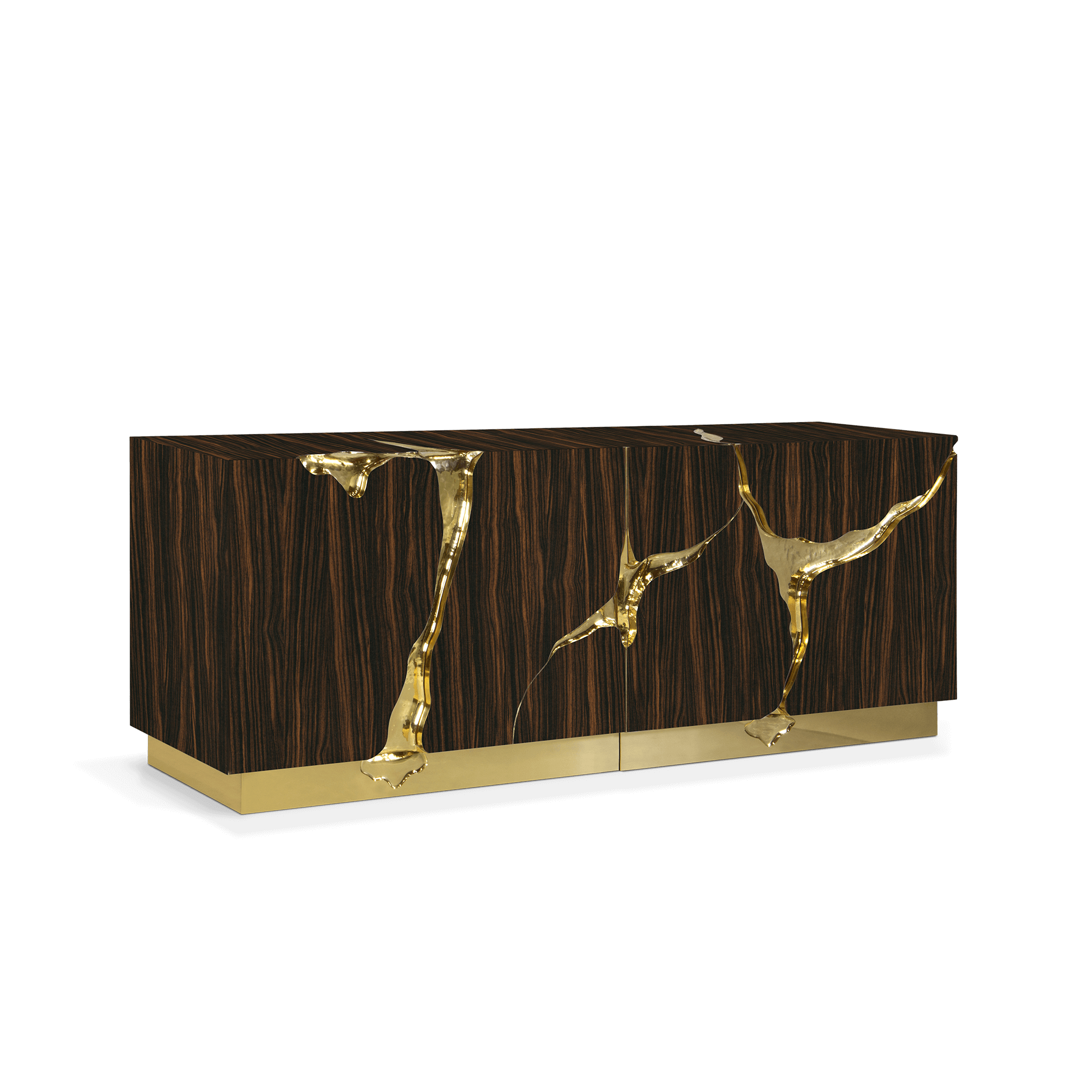 Its organic features are achieved through the manual fitting of polished brass, and a warmth glossy ebony veneer finish that bursts from the inside to the distinct exterior façades. Different-shaped doors and drawer are embellished by hammered gold details, conveying both sophistication and elegance to bring a new contemporary verve into refined interiors.