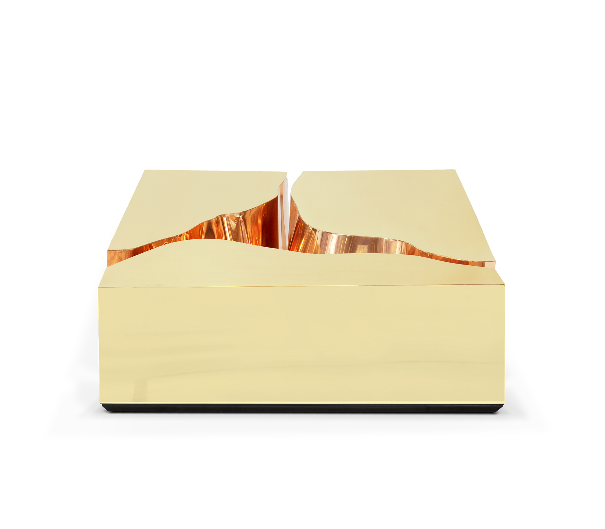 This center table is made with polished stainless steel, polished brass and a gold copper finish.