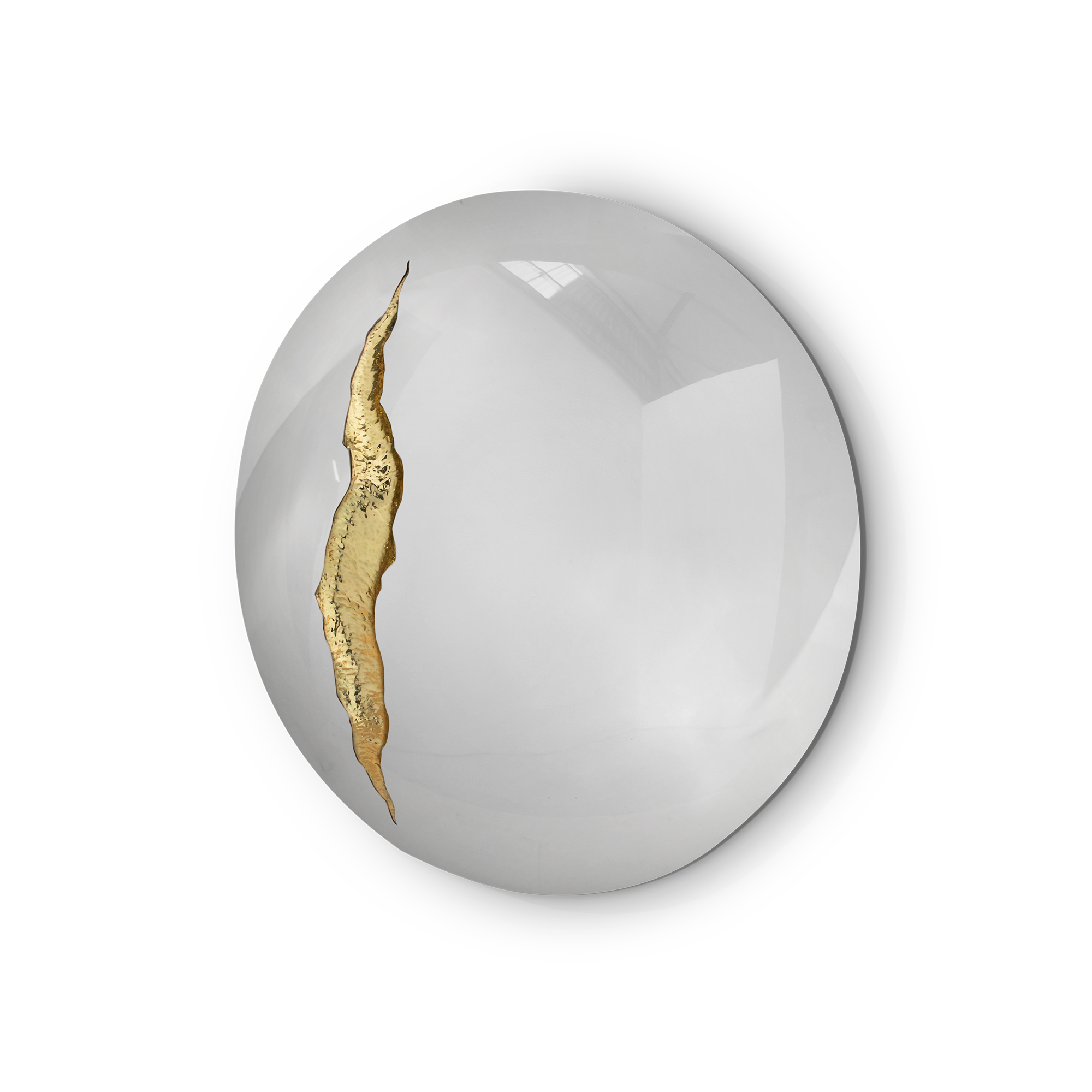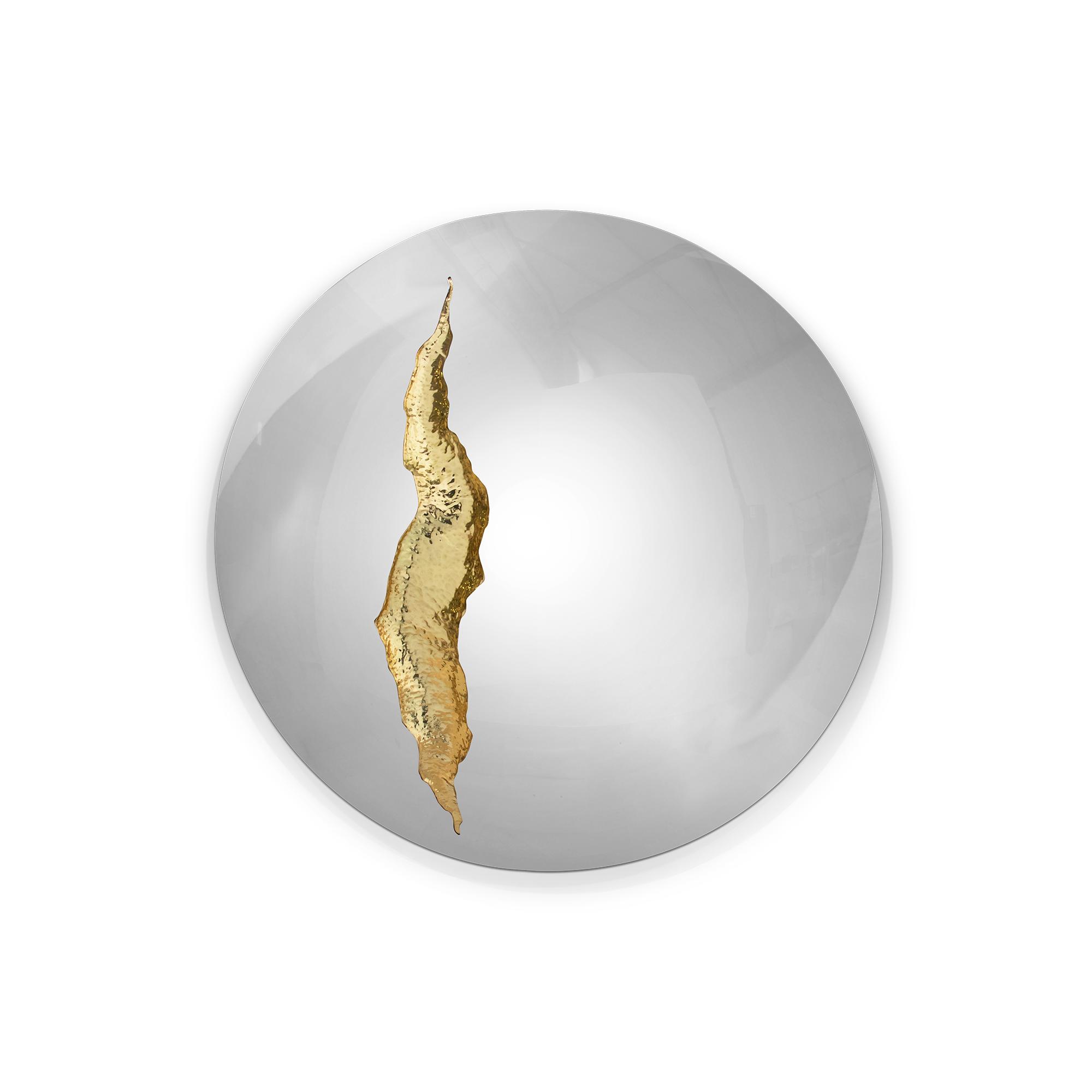 The organic features of this large mirror are achieved through the manual fitting of golden polished brass, finishes in polished stainless steel. The hammered gold details and the mirrored façade conveys a beautiful duality between power and refinement to bring a new contemporary verve into interior design. A functional artwork piece born from cold and freshly cracked to showing off the world rich, golden details.