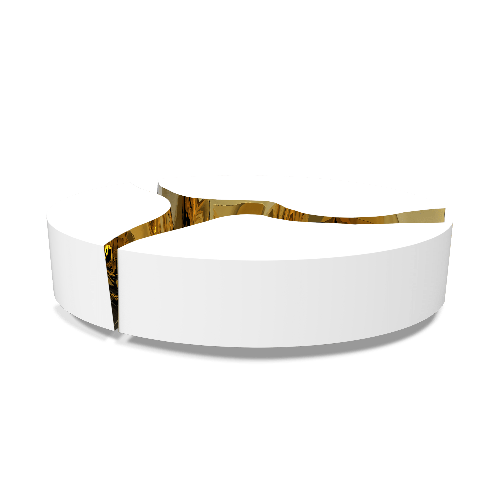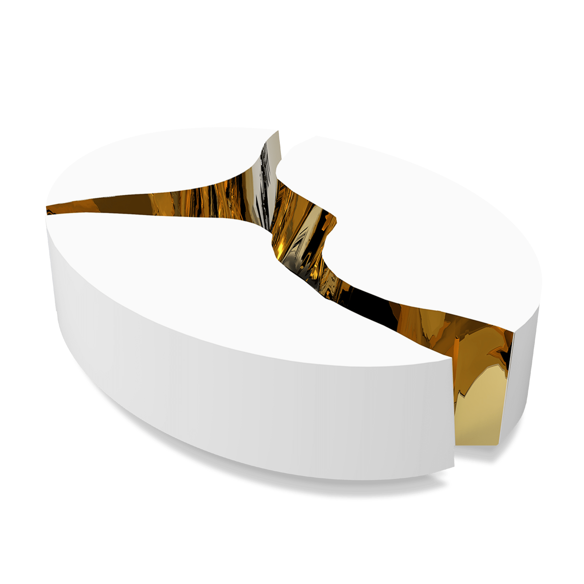 A functional artwork conceived in three modules for unexpected combinations. Its organic features are achieved through the manual fitting of the polished brass sheet, and a curved exterior finished in glossy white lacquer finish. The hammered brass details and mirrored sides convey both dynamics and elegance to bring a new contemporary verve into refined interiors. Finding beauty in the most unexpected places, this contemporary coffee table is inspired by authentic karst formations created by surface dissolution, freezing, or thawing of dolomite rocks. Born from cold and freshly cracked to showing off the world rich, golden interior.
