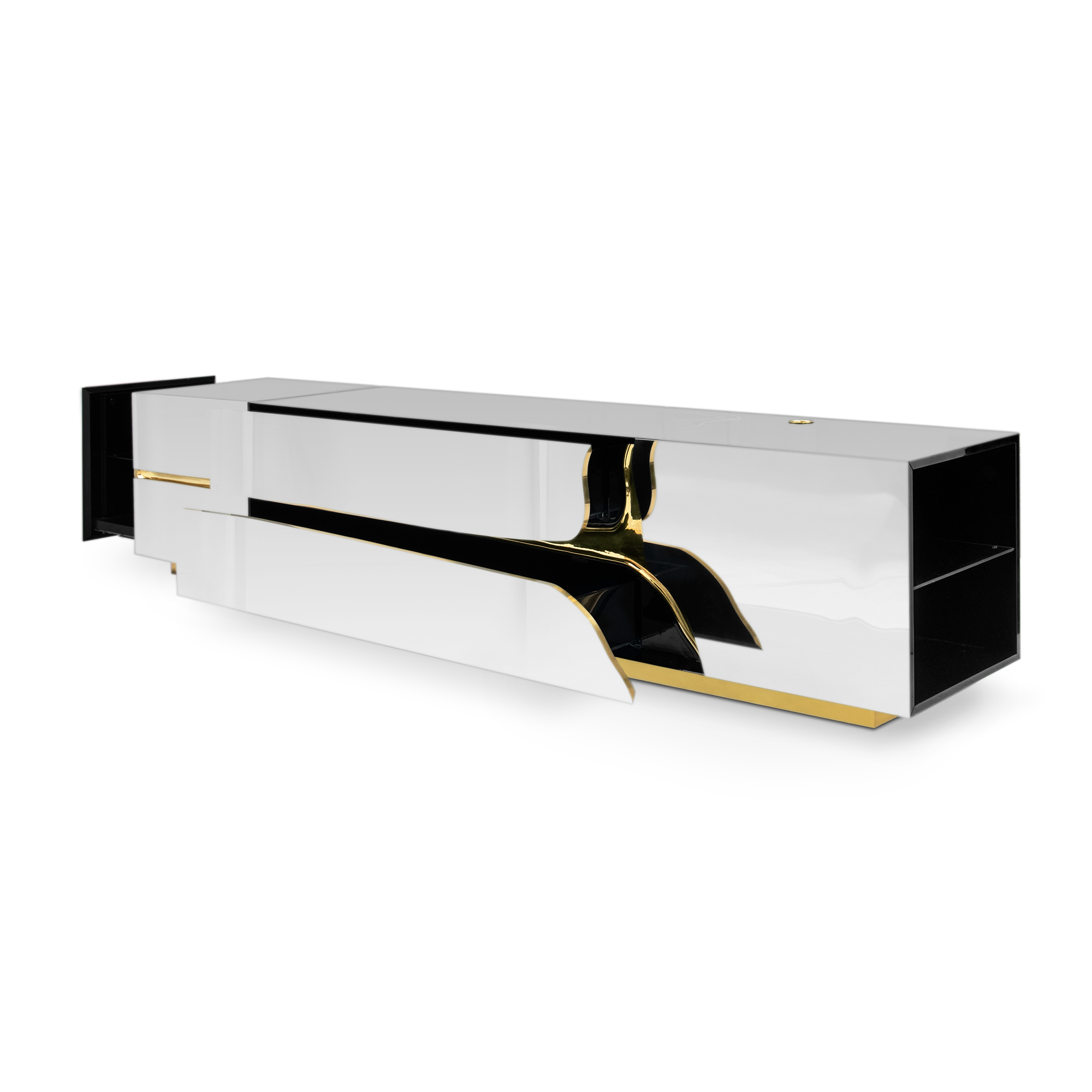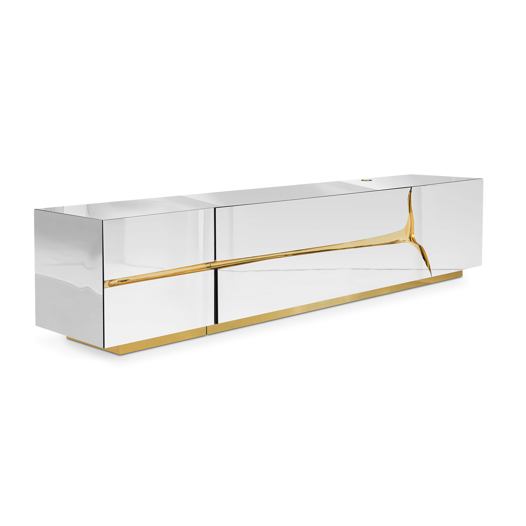 Lapiaz TV cabinet takes exceptional craftsmanship and design to a new realm. Finding beauty in the most unexpected places, this contemporary design piece is inspired by authentic karst formations created by surface dissolution, freezing, or thawing of limestone or dolomite rocks. Its organic features are achieved through the manual fitting of polished brass, and a sharp finish in polished stainless steel that portrays a perfect mirror. It is composed of two modules that open to a distinct black interior, featuring different-shaped drawers and glass shelves. The hammered gold details and the mirrored façade conveys both dynamics and elegance, a beautiful duality between power and refinement to bring a new contemporary verve into interior design. A functional artwork piece born from cold and freshly cracked to show off the world rich, golden details.