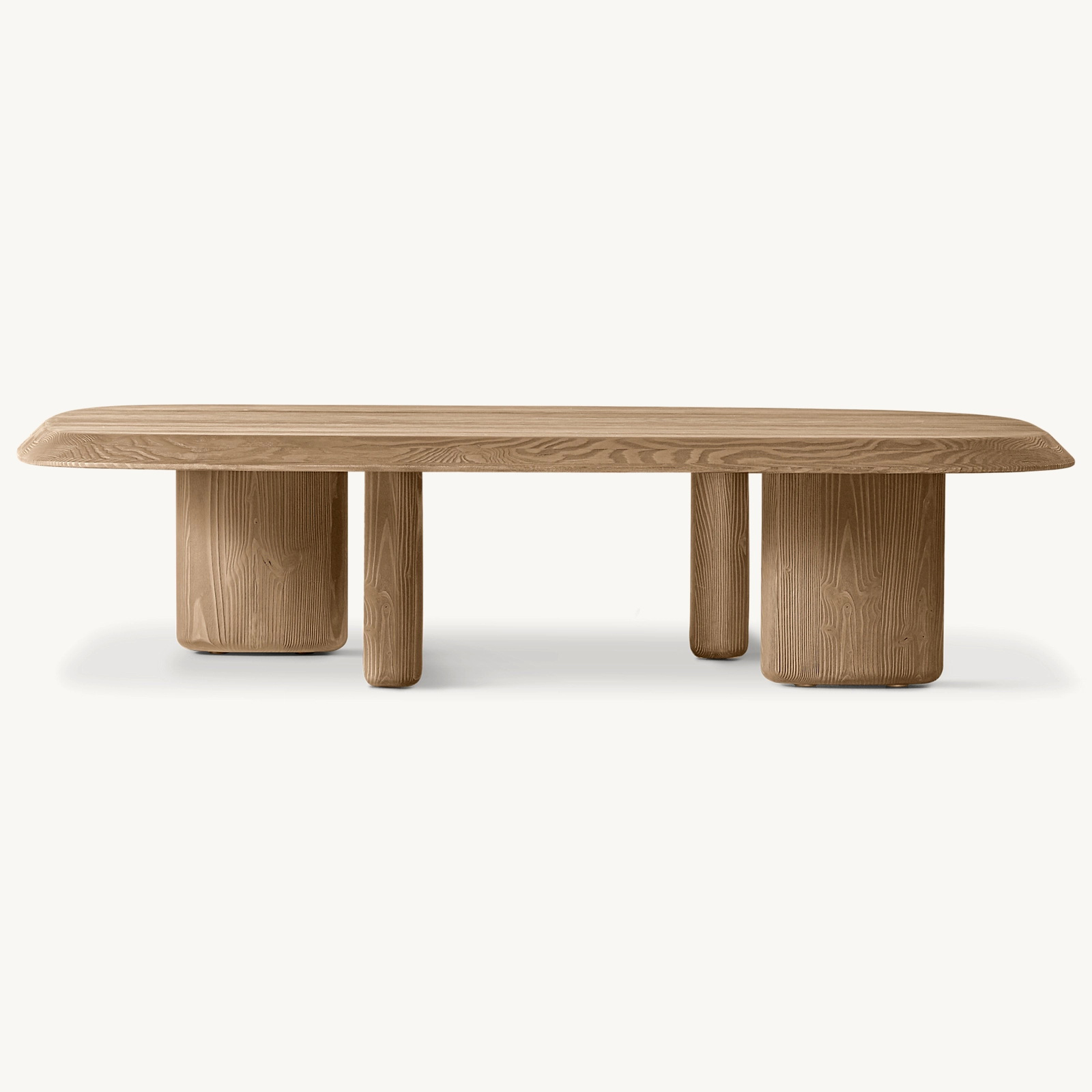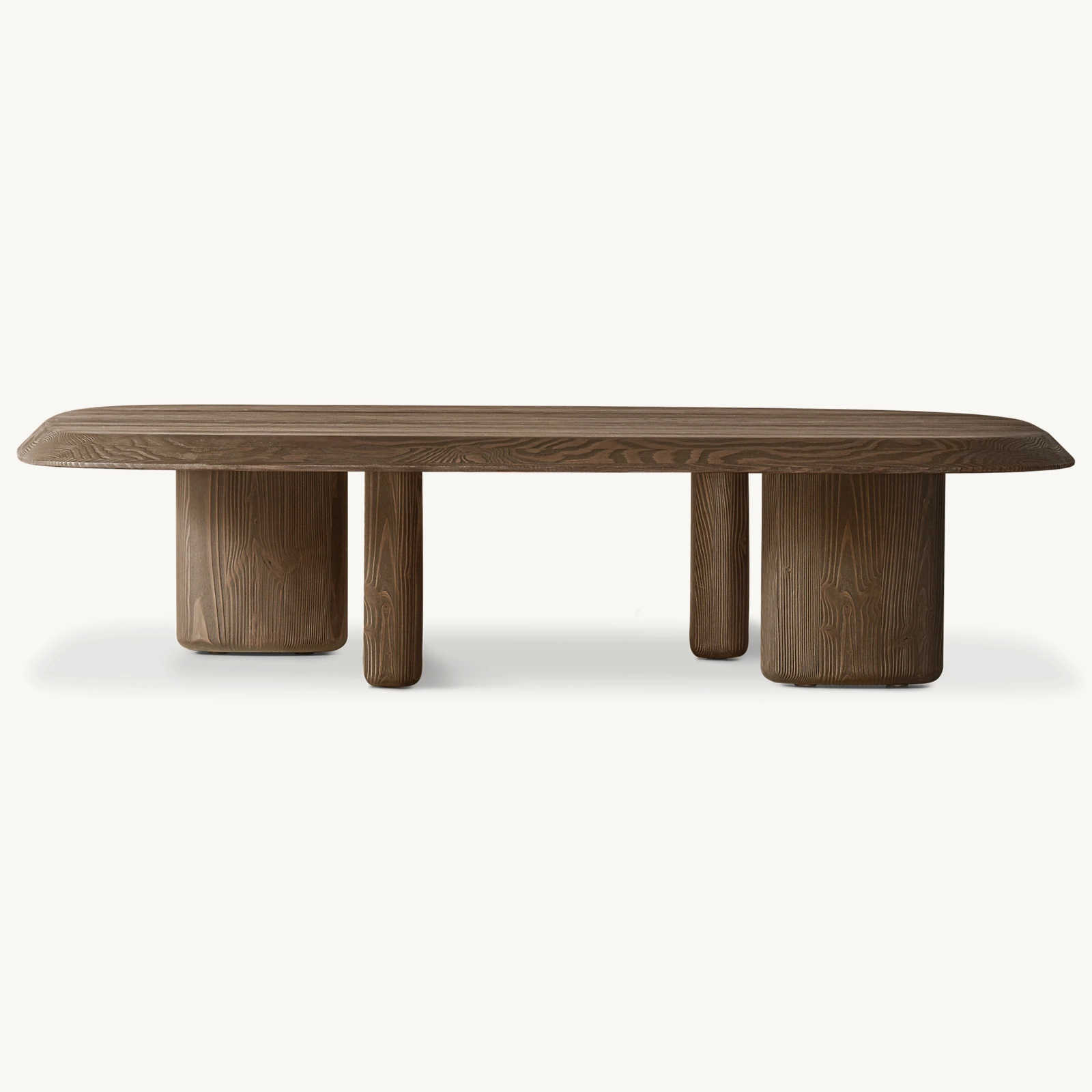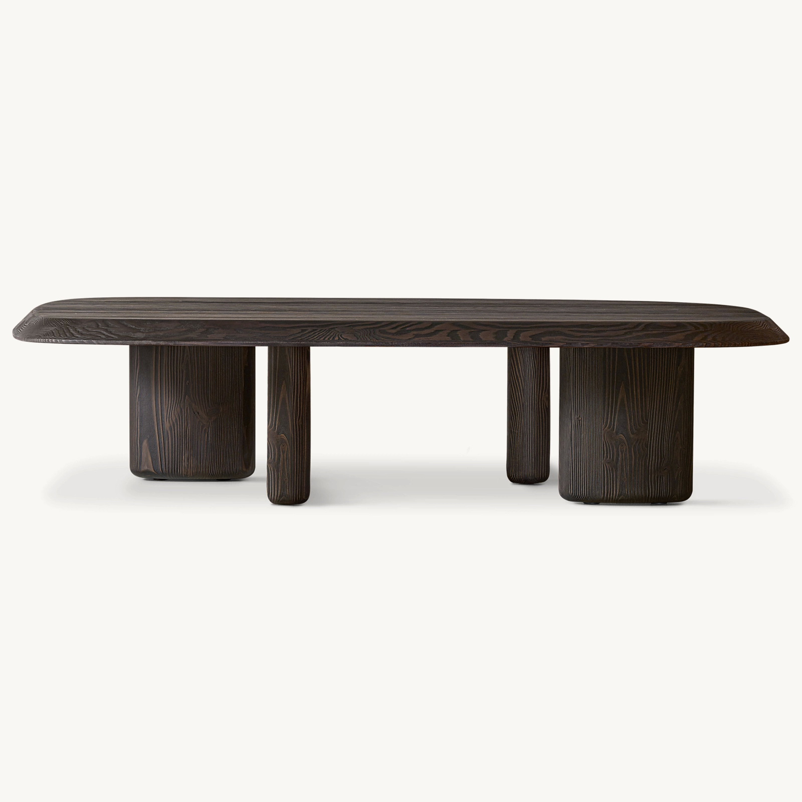 An intensive, multistep finishing process, including dry brushing and sanding, results in a matte surface with deeply textured grain