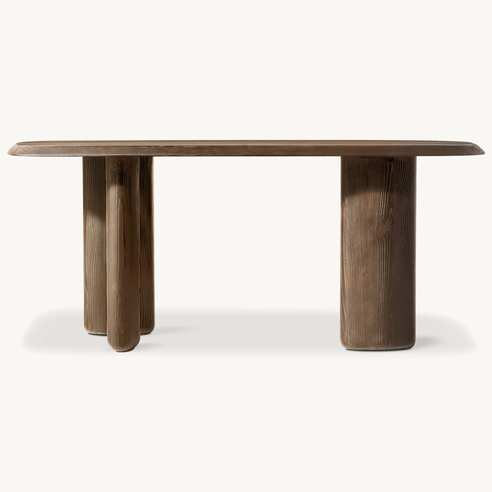 An intensive, multistep finishing process, including dry brushing and sanding, results in a matte surface with deeply textured grain