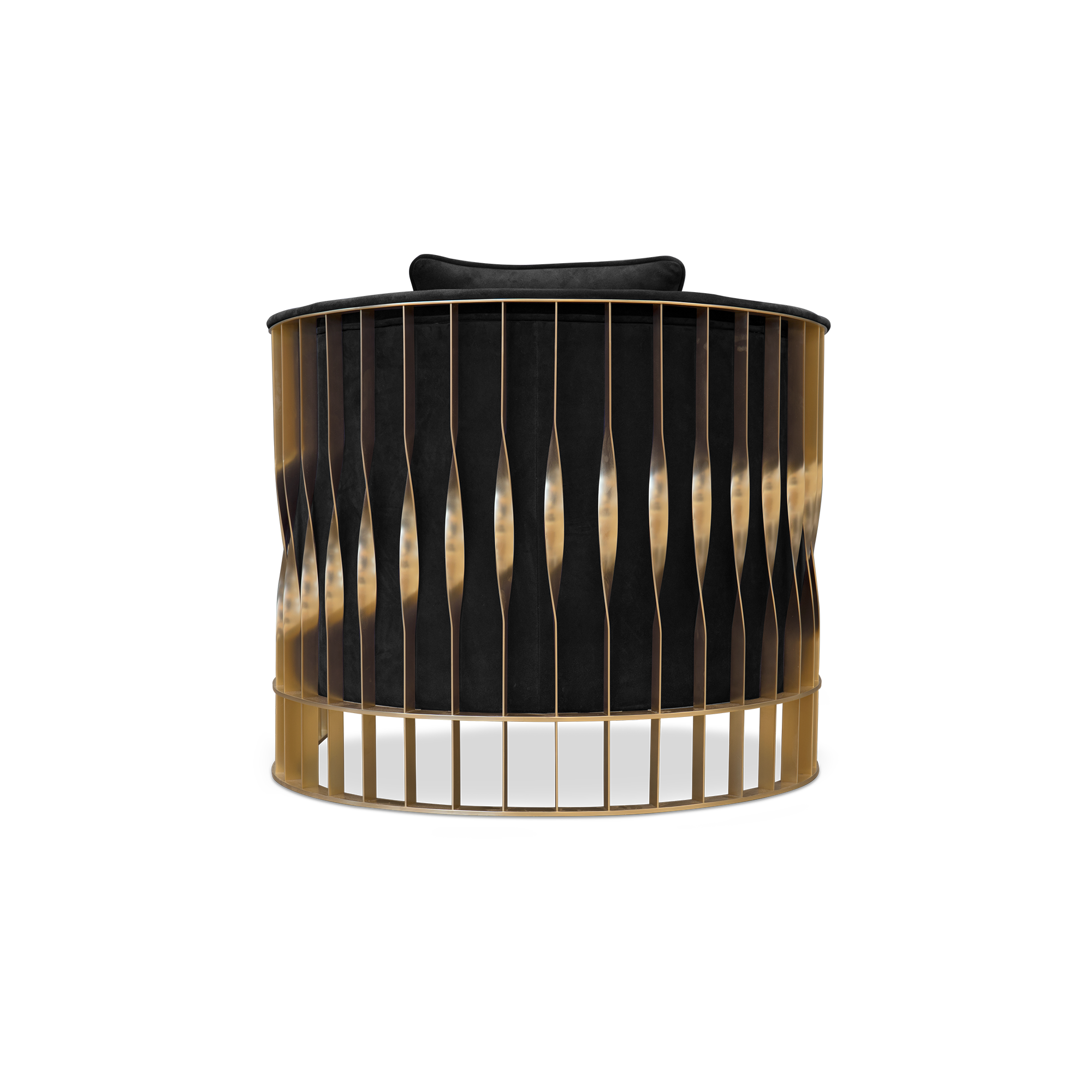 Conceived from a cuff bracelet, the Mandy chair will embellish any setting with its supple upholstery and a base in twisted high-gloss metal.