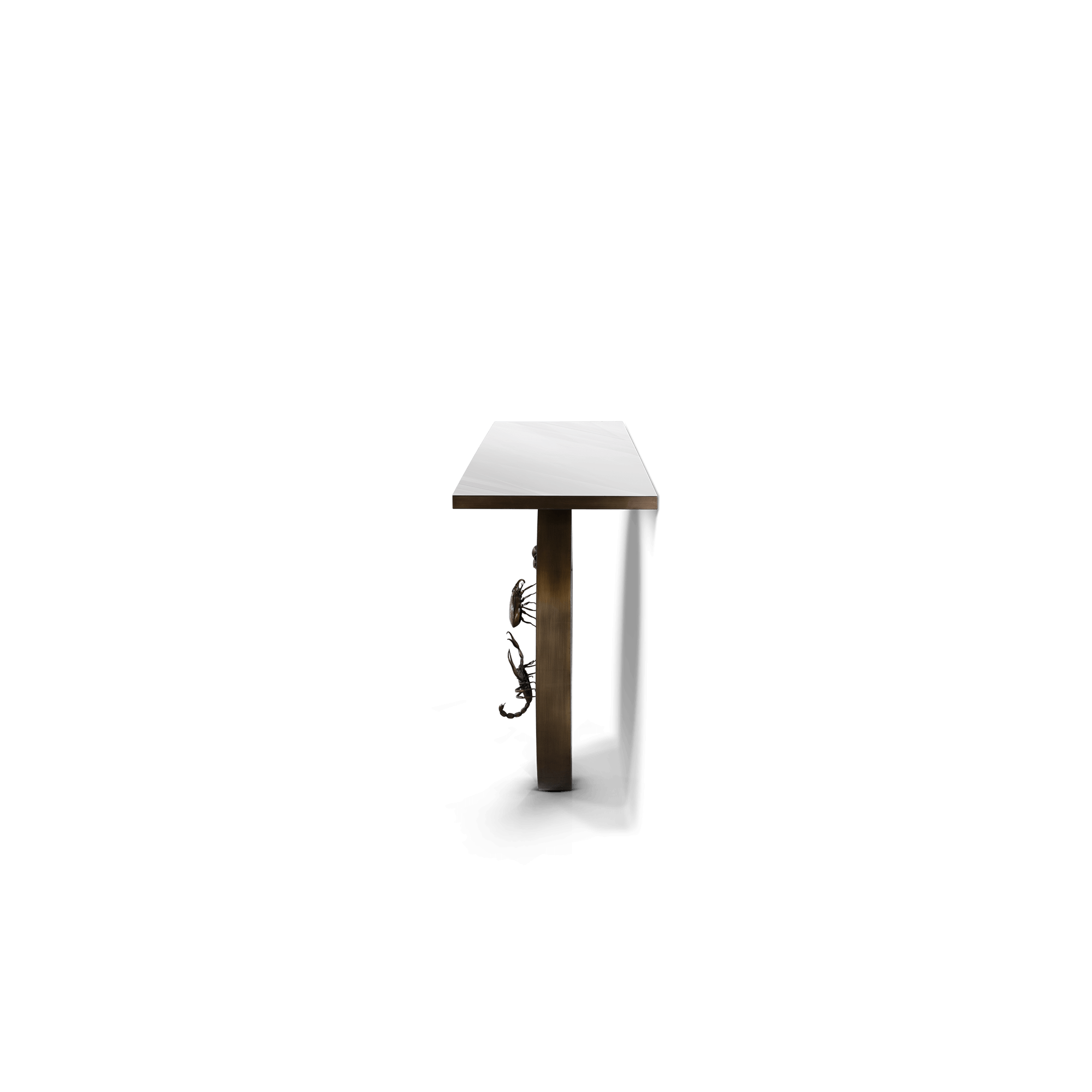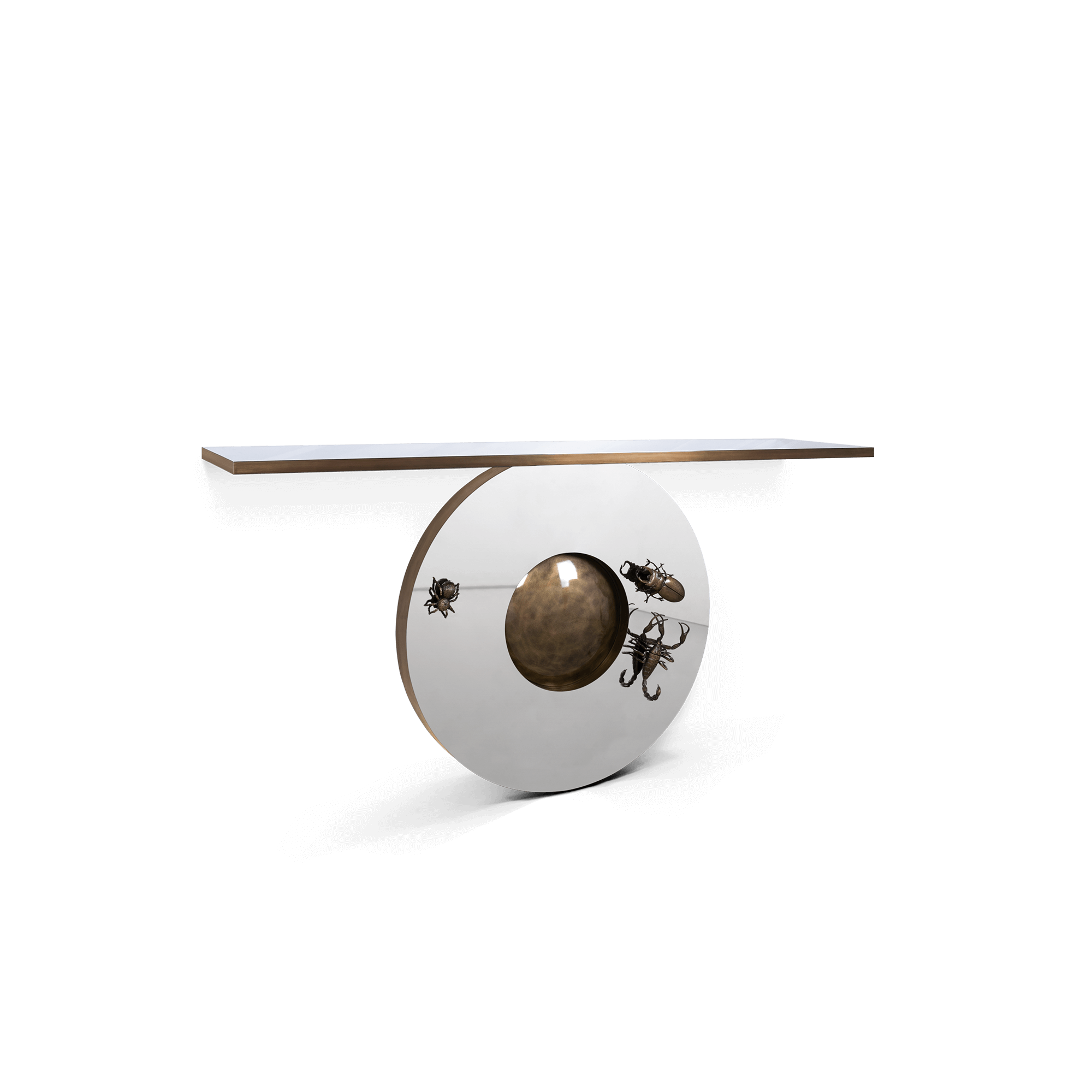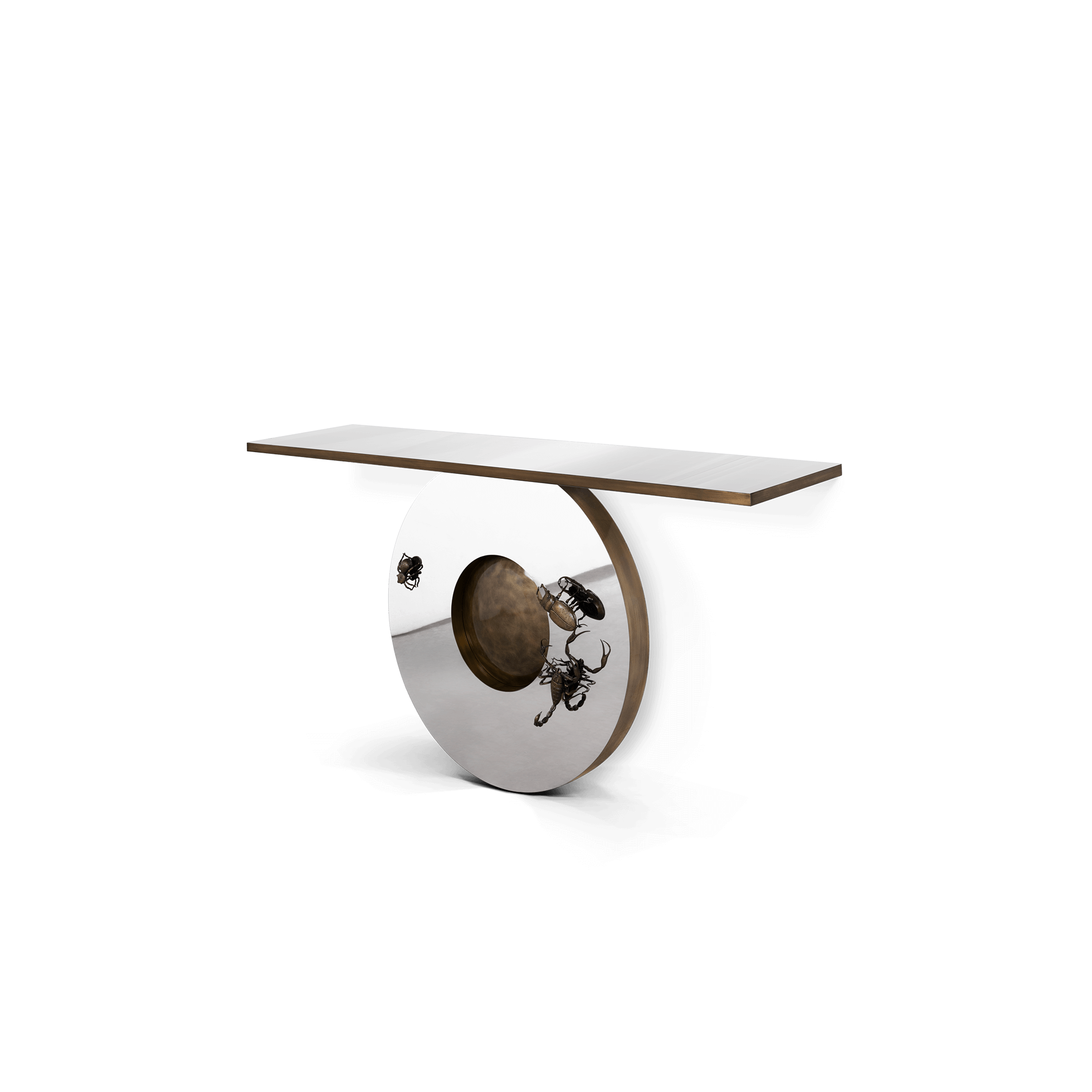The Metamorphosis Console is composed by a top and base finished in polished inox and brass beautified by the presence of golden creatures. Two brass plated feet with casted brass details.