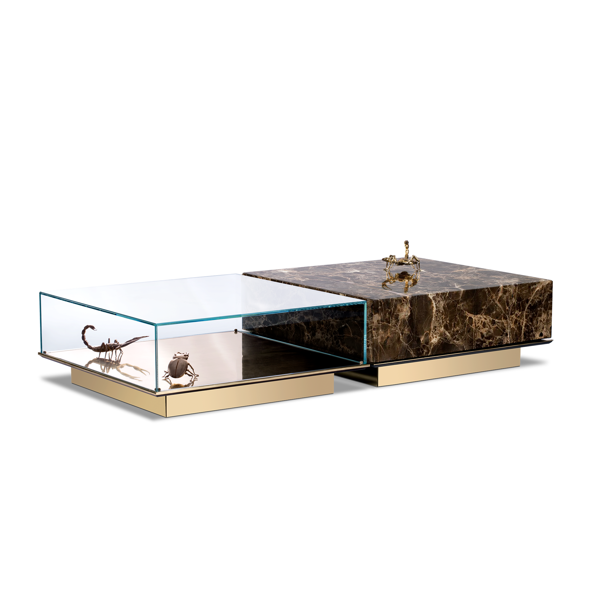 A set of two tables. One module is composed of a glass box which envelopes 3 gold plated elements of 2x scorpion and 1x pollock beatle, laying in a base of gold plated brass. The second module is composed of marble box over wood structure, gold plated base.