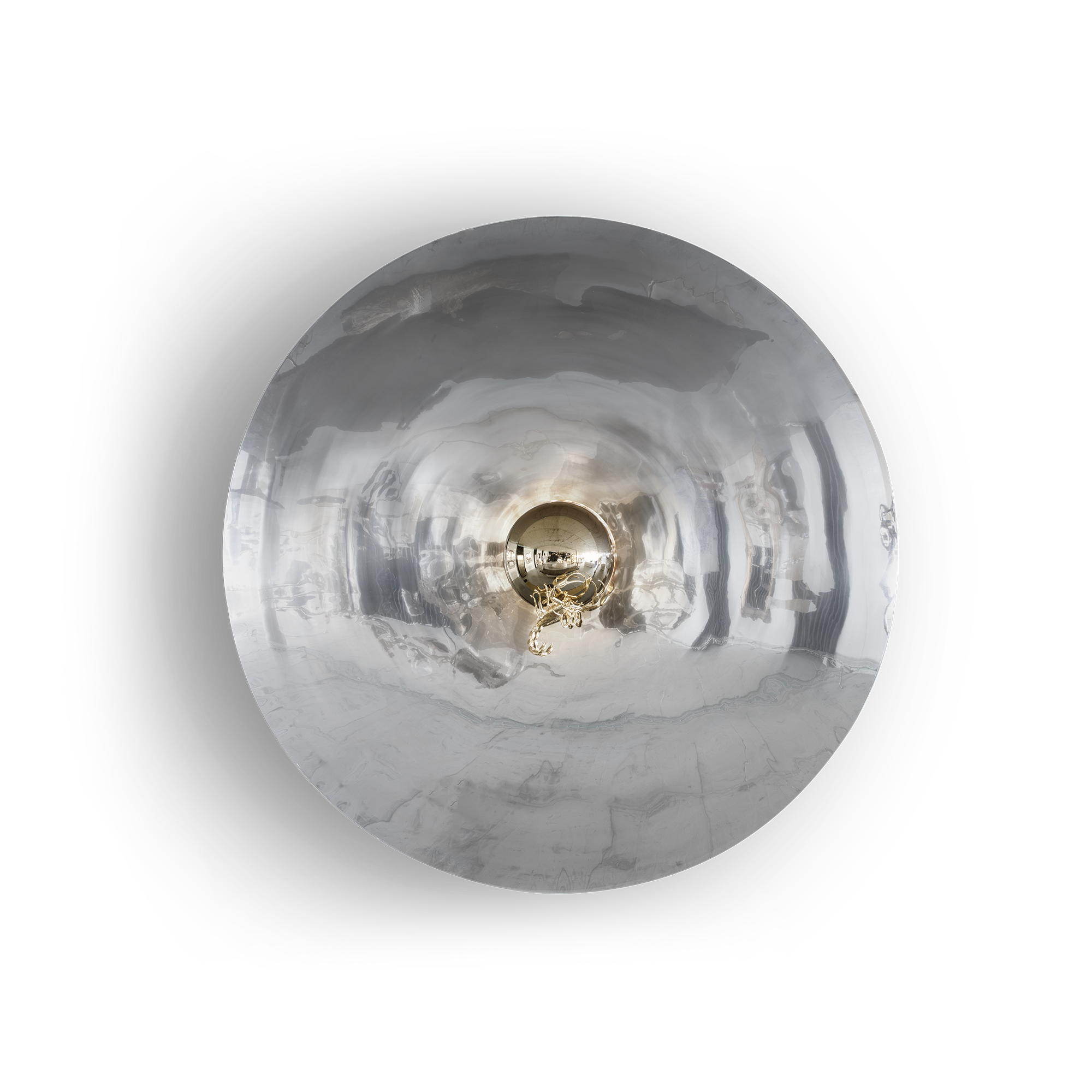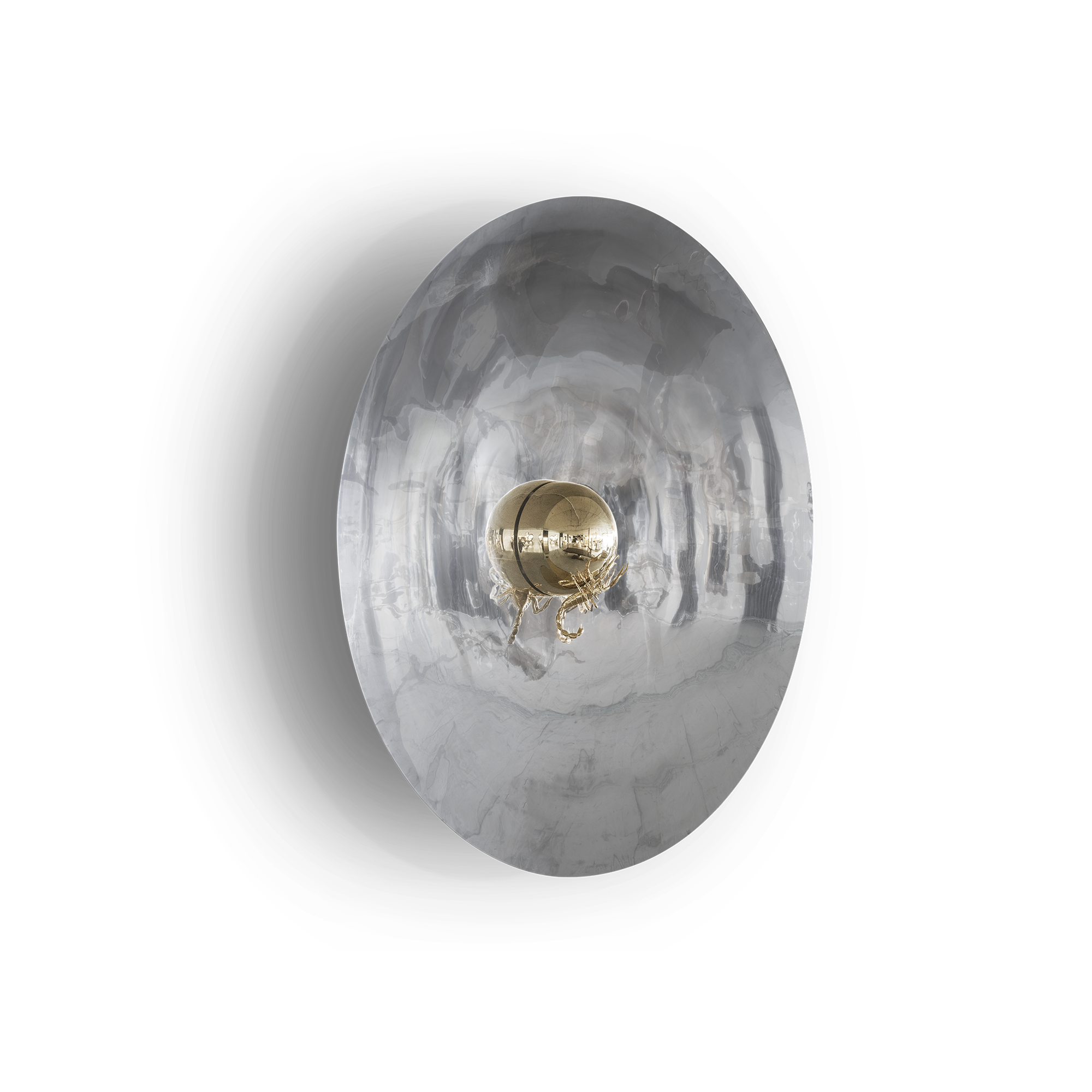 Contemporary art imagined for those who appreciate the great things in life, finding beauty in the most unexpected places. Metamorphosis large round wall mirror is conceived with the concave shape of polished stainless steel and coated in a nickel bath. A restless yet sleek gold scorpion of casted brass raises in the centre, landed in a polished stainless steel semi-sphere encircled by a warm light. This statement wall decoration piece is born from the finest craftsmanship for the most exceptional rooms and remarkable interiors. A tribute to the darkest side of nature where challenges never cease to exist.