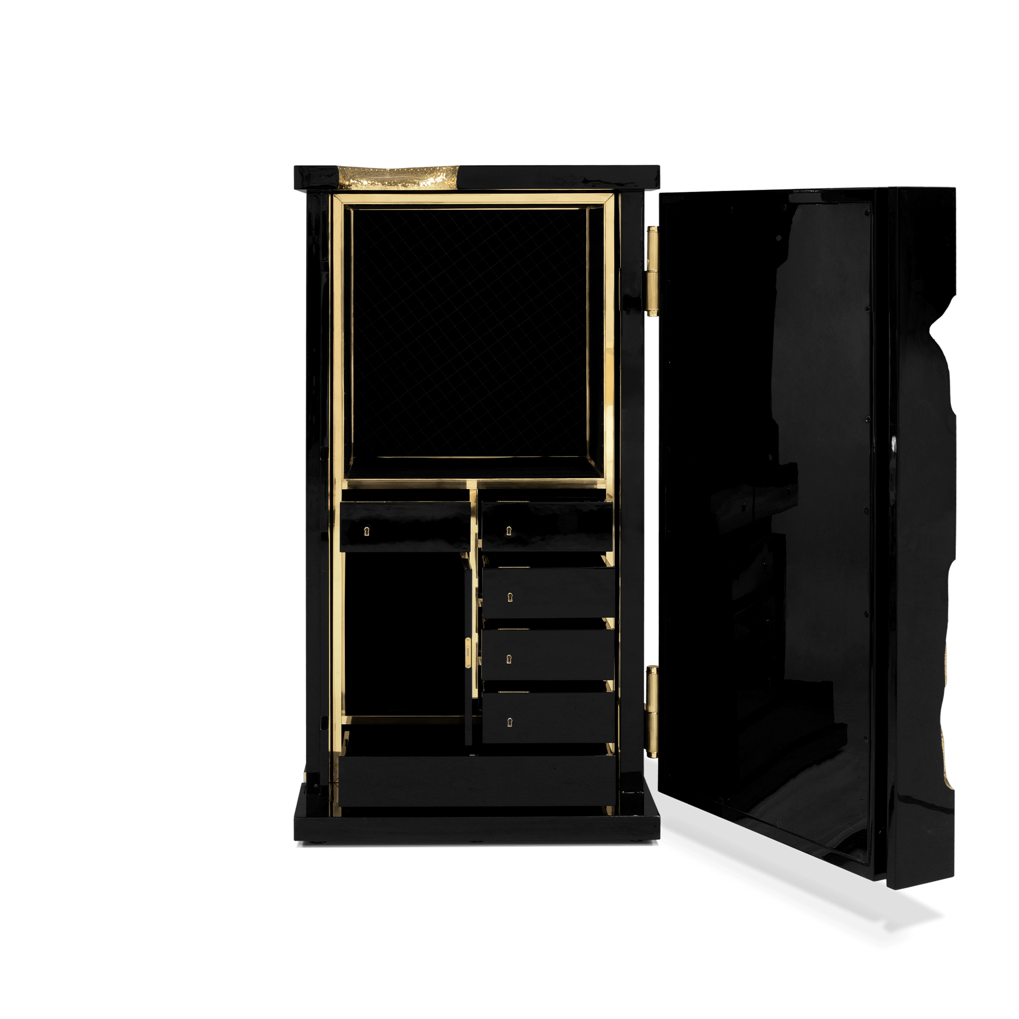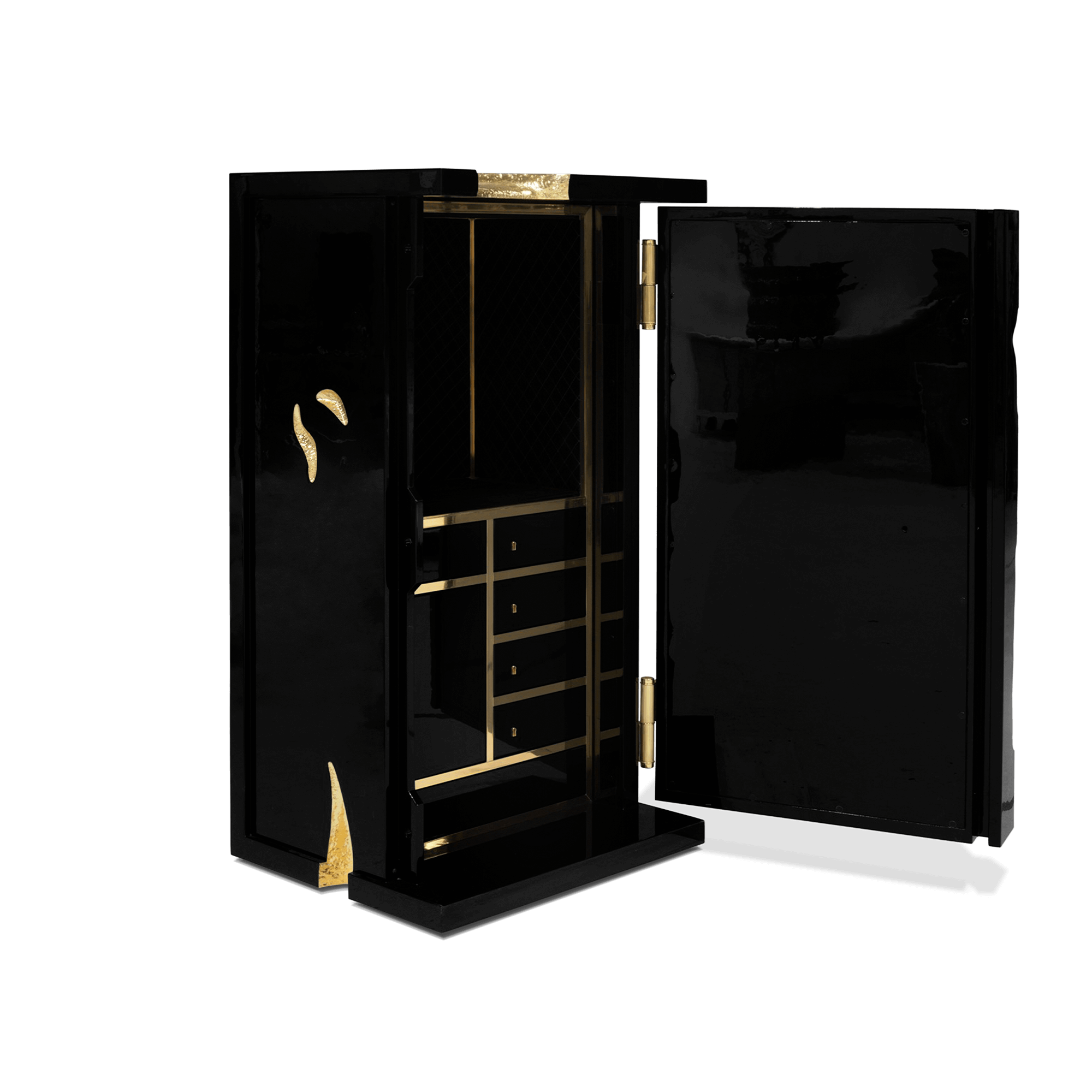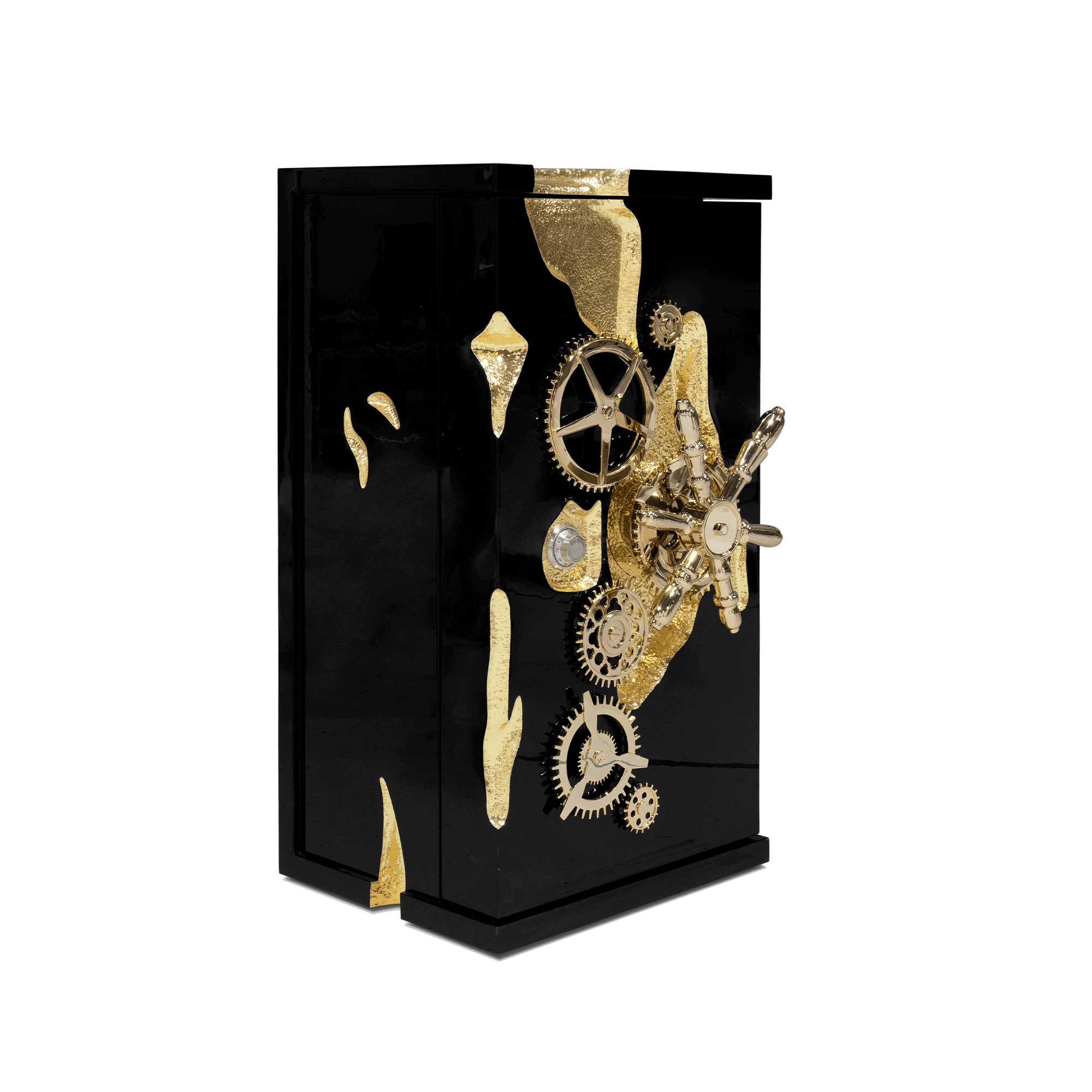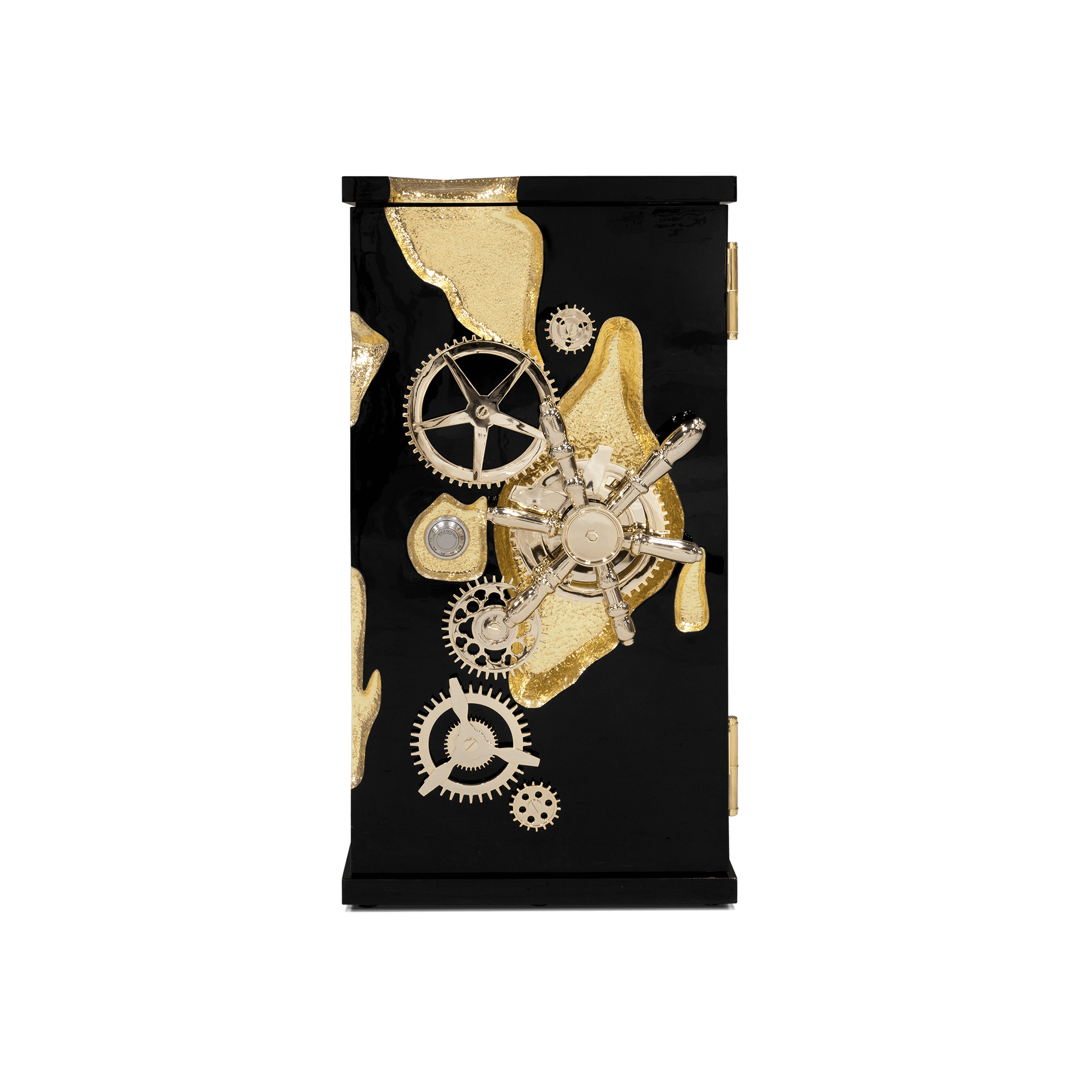 Influenced by the California Gold Rush, the Millionaire Safe is a statement piece designed to cause an impression. Enveloped by gold-plated polished brass frame with several dents, it sparks both interest and imagination reminding the vault robbery attempts in the old west. Nestled in a turned brass gold plated gear-wheel mechanism, an imposing safe handle obeys the will of is master through a secret dial lock combination. The overlay door makes room for an open space lined in velvet to keep liquors or other luxury lifestyle items, and a set of lockable drawers and door. Watch winders, shelves, an extra locking system and other features are able to customize.