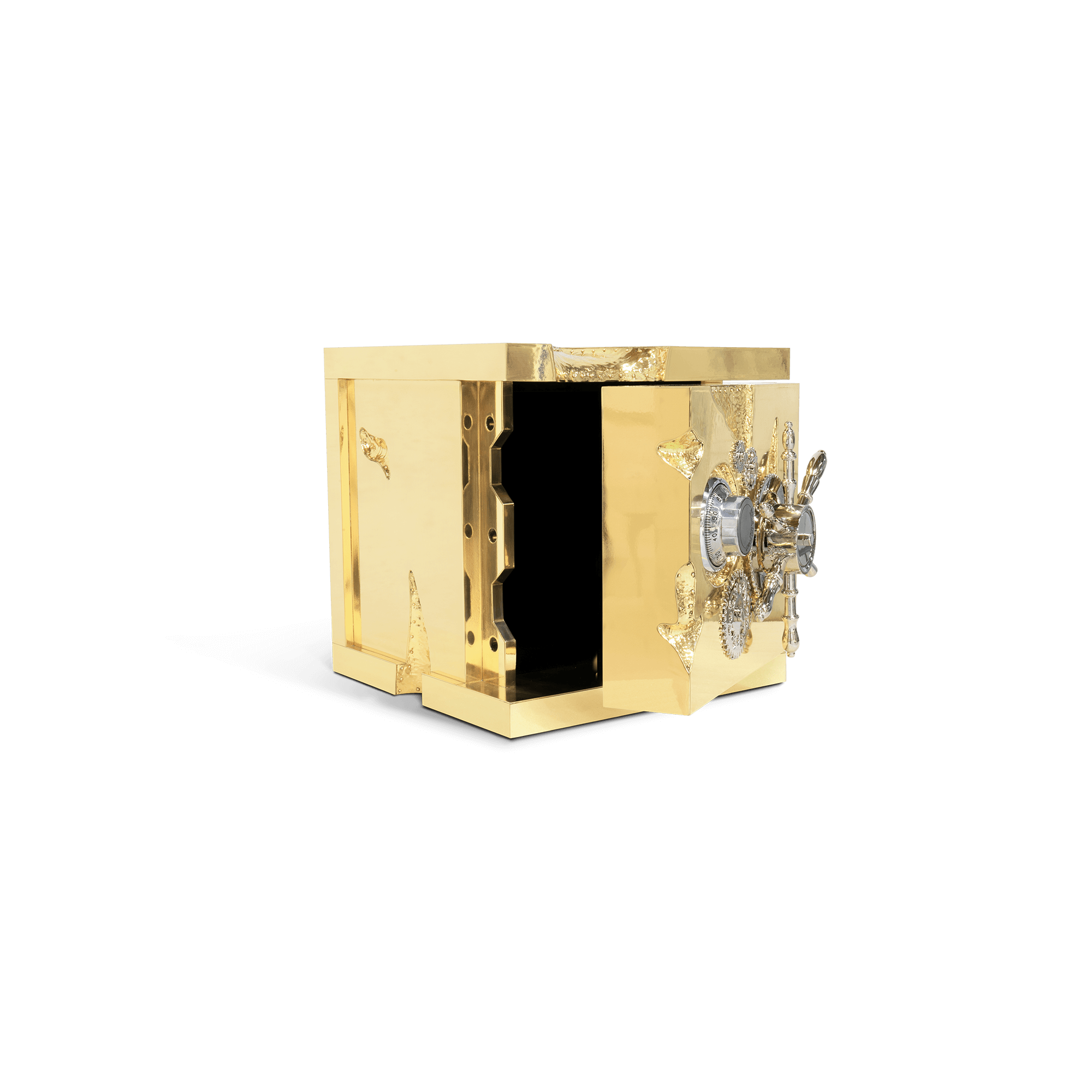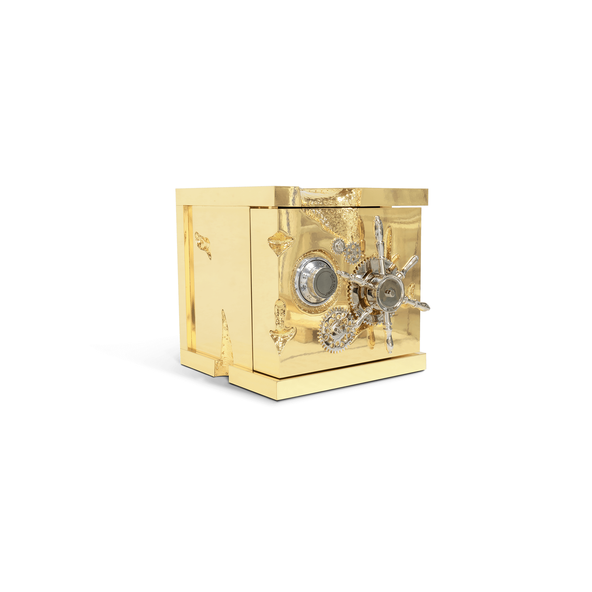 The Millionaire Jewelry Safe – a compact and portable rendition of the iconic Millionaire Safe. Inspired by the allure of the California Gold Rush, this statement piece exudes a captivating charm. Crafted with exquisite materials, and adorned with intriguing dents that evoke tales of the Old West’s vault heists. Its centrepiece is a distinguished safe handle, nestled amidst a gear-wheel mechanism, activated through a secret dial lock combination. The overlay door unveils a lavish interior, offering an exquisite haven for treasured items, making it the ideal storage solution for valuables, accessories, business essentials, or luxury indulgences – all while leaving a lasting impression.