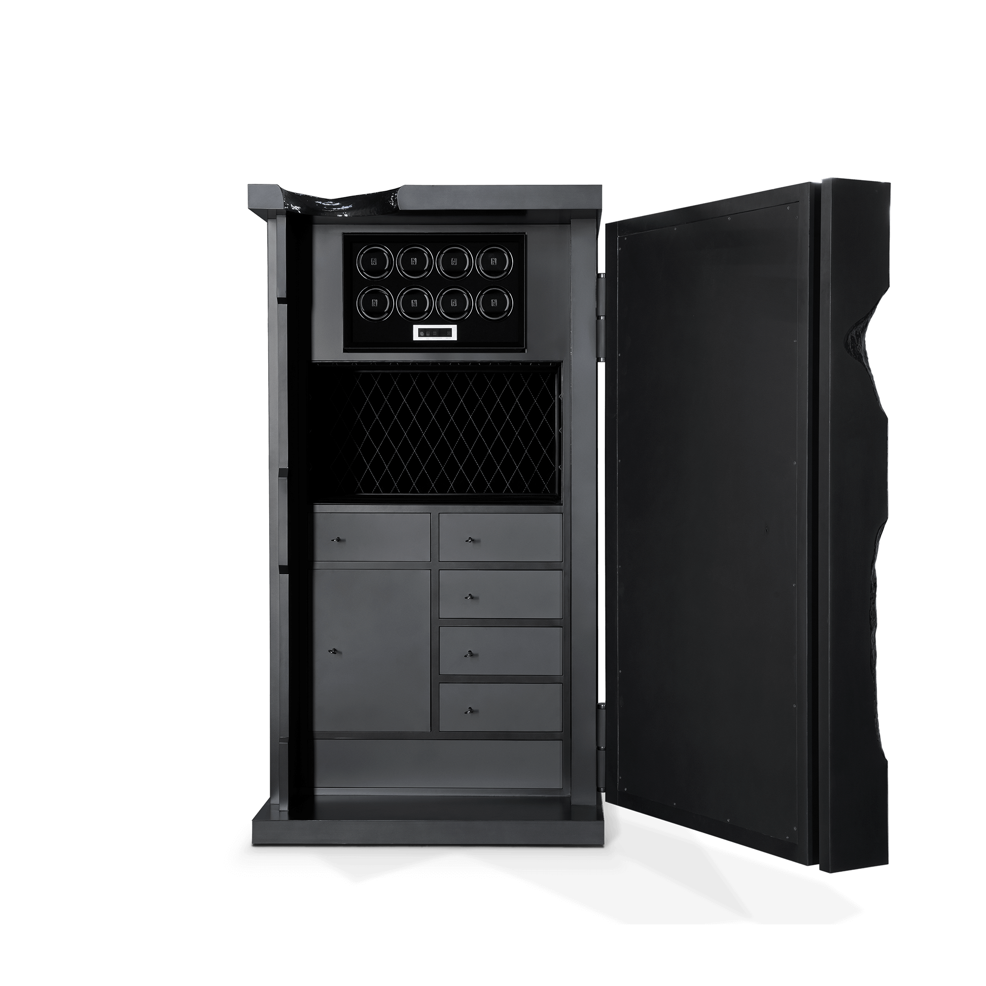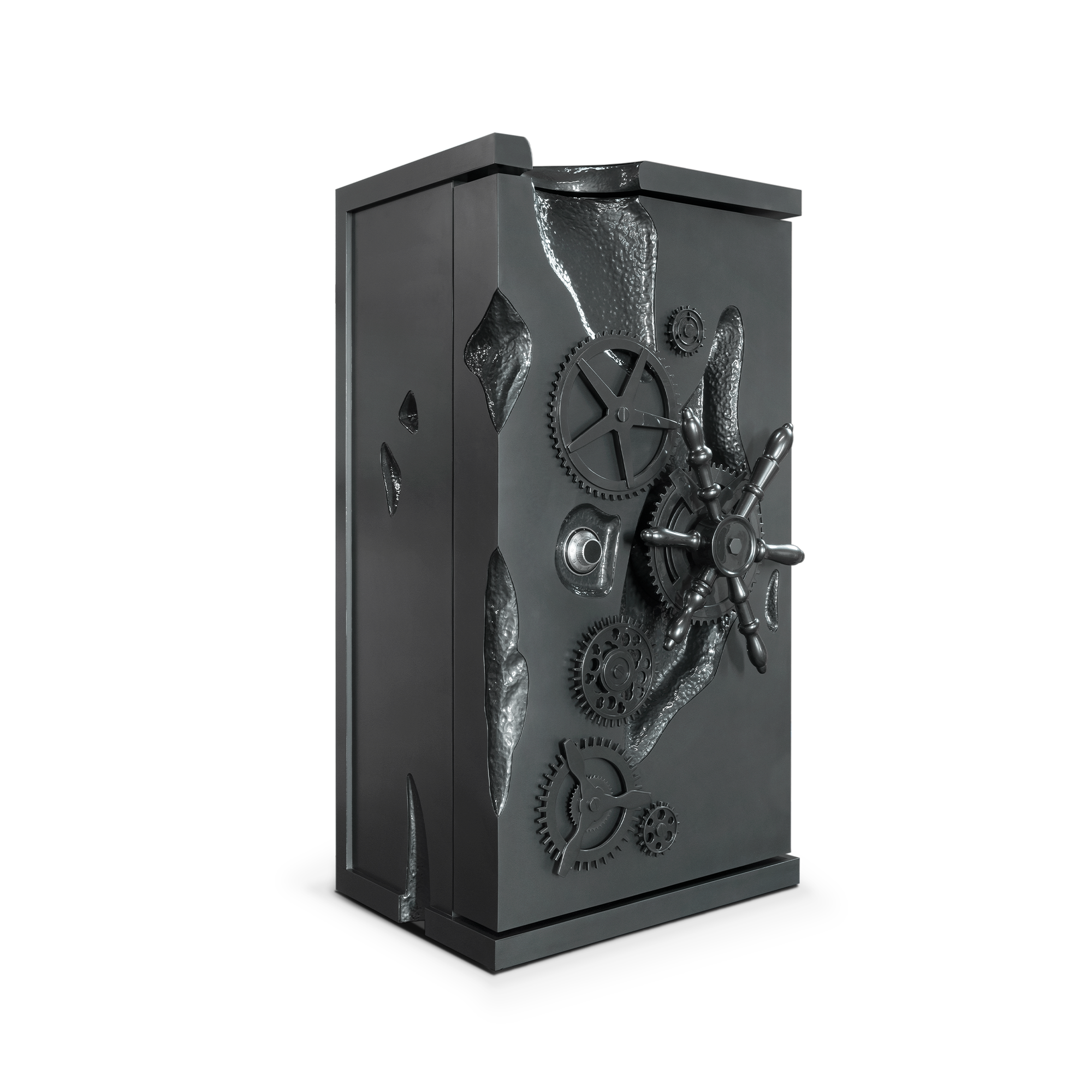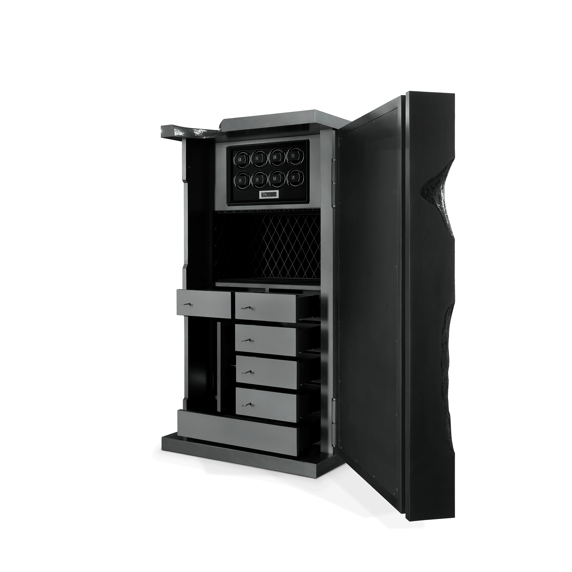 Influenced by the California Gold Rush, the Millionaire Safe is a statement piece designed to cause an impression. Enveloped by gold-plated polished brass frame with several dents, it sparks both interest and imagination reminding the vault robbery attempts in the old west. Nestled in a turned brass gold plated gear-wheel mechanism, an imposing safe handle obeys the will of is master through a secret dial lock combination. The overlay door makes room for an open space lined in velvet to keep liquors or other luxury lifestyle items, and a set of lockable drawers and door. Watch winders, shelves, an extra locking system and other features are able to customize.