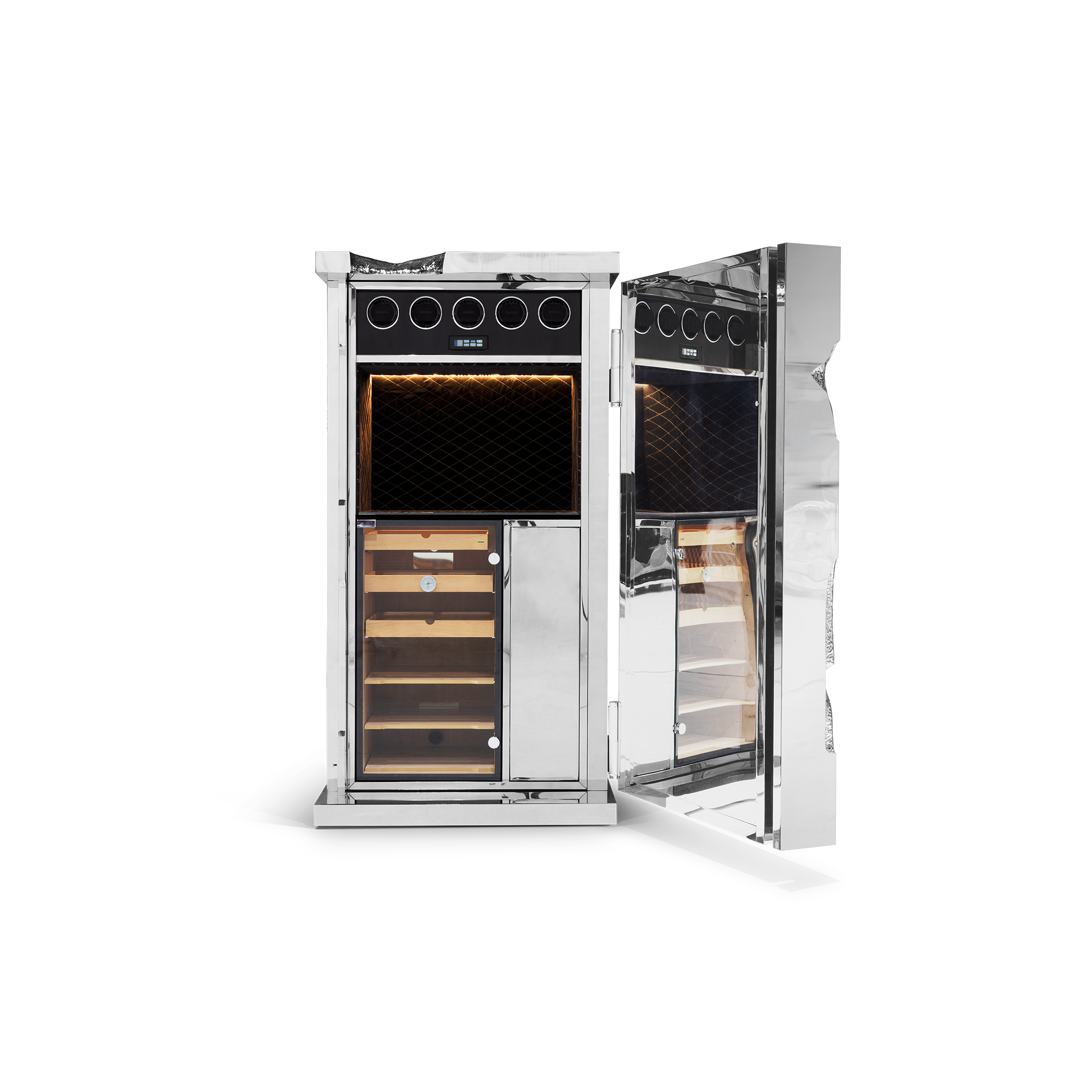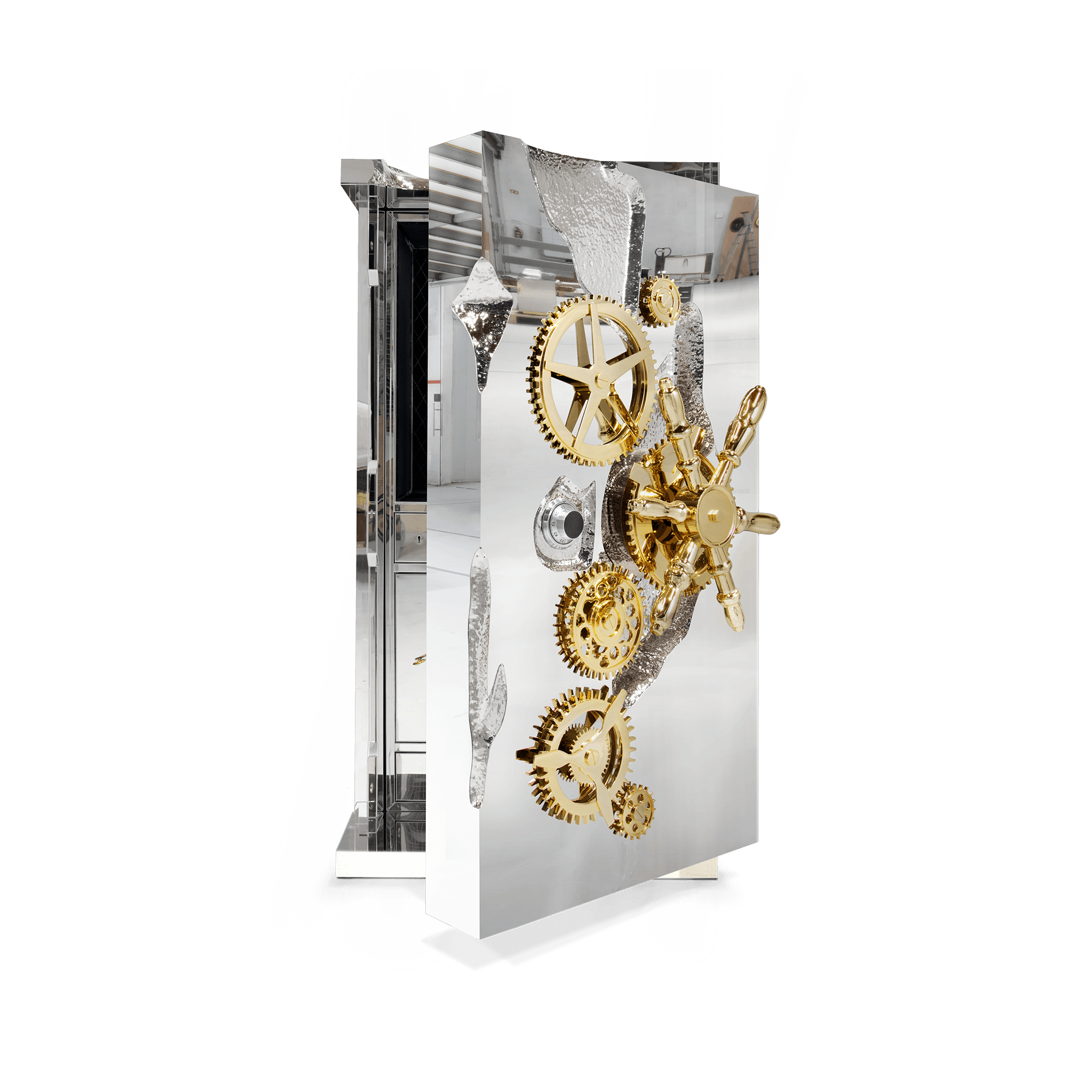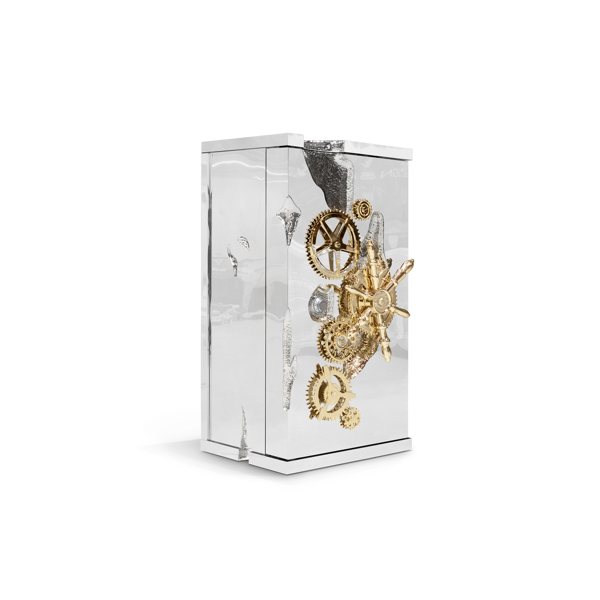 Influenced by the California Gold Rush, the Millionaire Safe is a statement piece designed to cause an impression. Built in a Mahogany structure and gold-plated polished brass frame with several dents, it sparks both interest and imagination reminding the vault robbery attempts in the old west. Nestled in a turned brass silver plated gear-wheel mechanism, an imposing safe handle obeys the will of is master through a secret dial lock combination. The overlay door makes room for an open space lined in velvet to keep liquors or other luxury lifestyle items, and a set of lockable drawers and door. Watch winders, shelves, an extra locking system and other features are able to customize.
